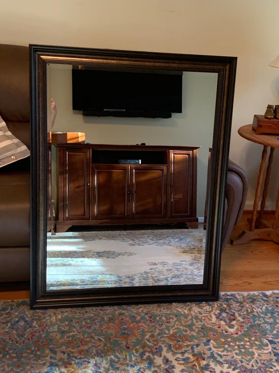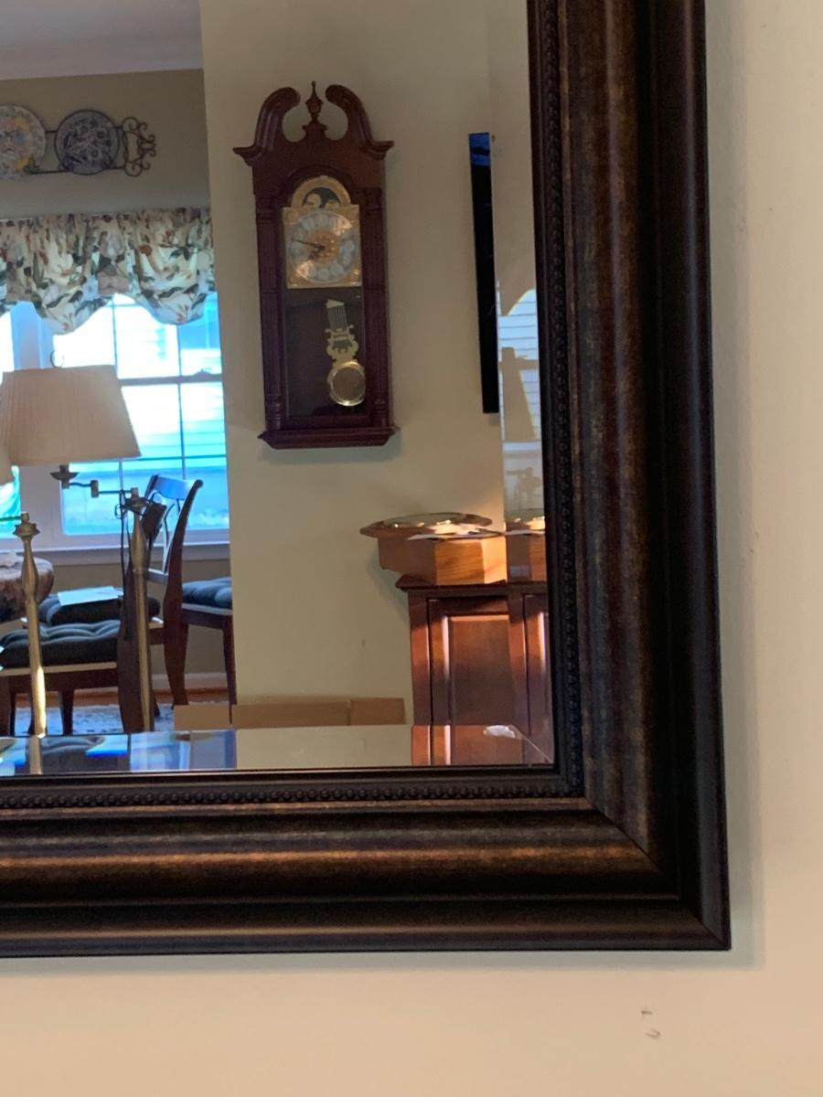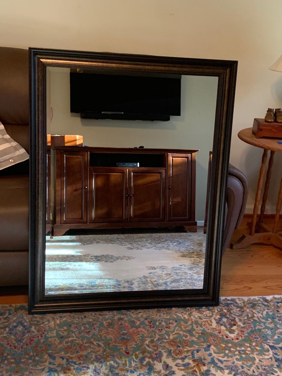 45x 35 inches. Large modern accent mirror, with black w/copper tones. Please see all pictures as they are the best representation of the items. The pictures show condition, measurements if taken, and what is included in the lot. Due to the large amount that we photograph and the time frame, we are not always able to take measurements. All items unless noted, are pre-owned and have been used. If you purchased furniture, you must bring help. We do not allow one person to carry large furniture out on their own. Bring help, tools and a truck for the safety of our client’s homes, and your personal safety. Any damages that result to the property including walls, and floors due to moving of the furniture will be charged to the buyer. Company policy. Thank you.