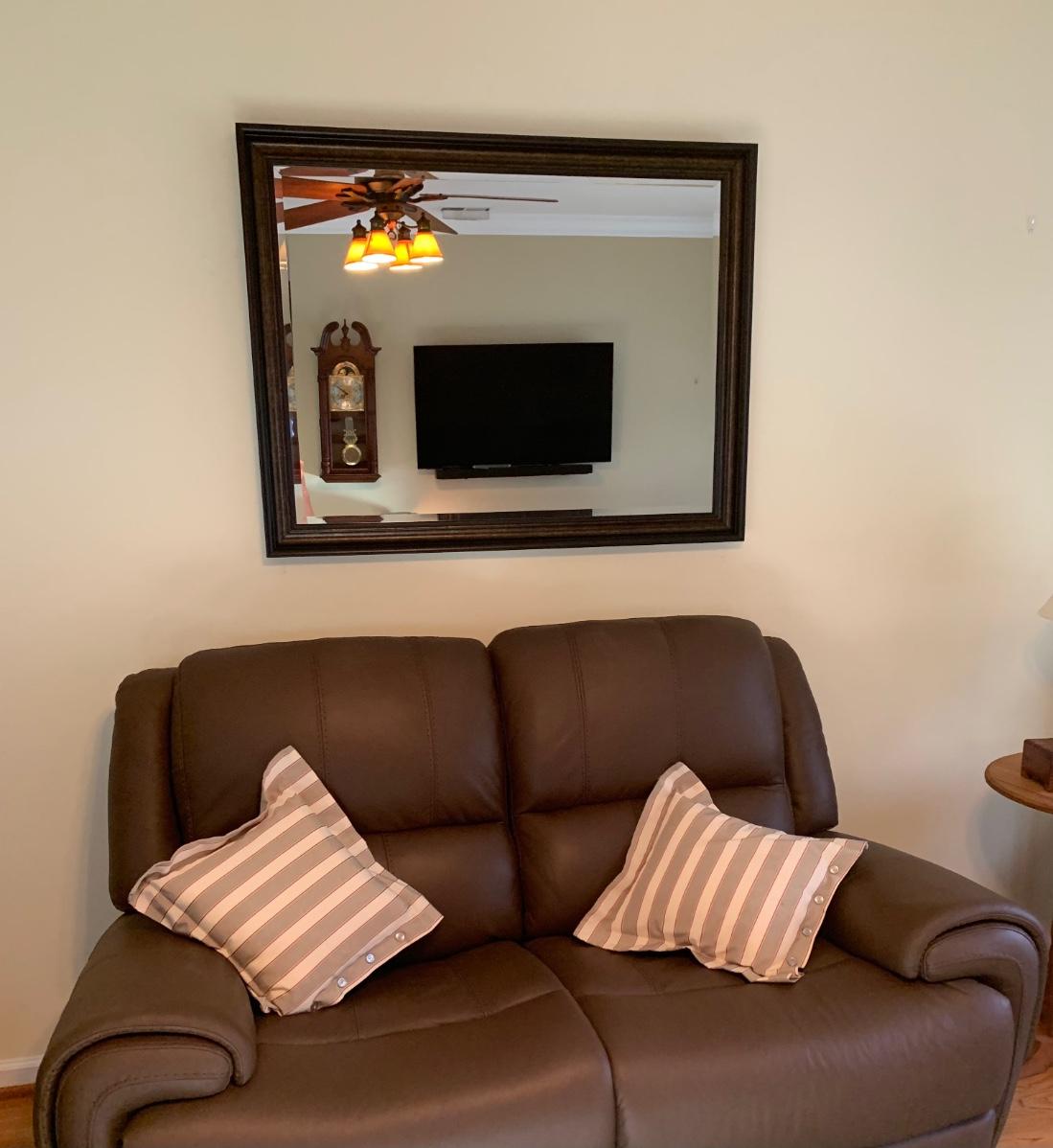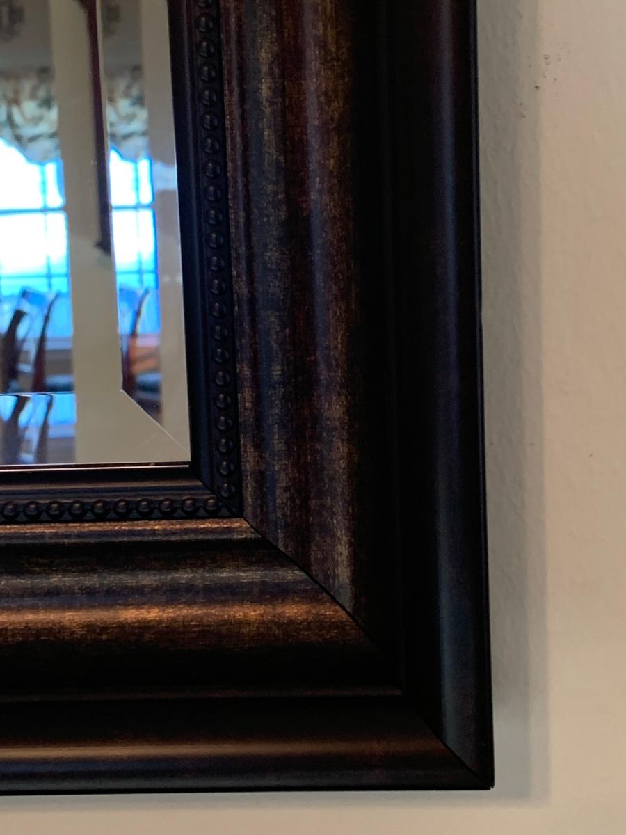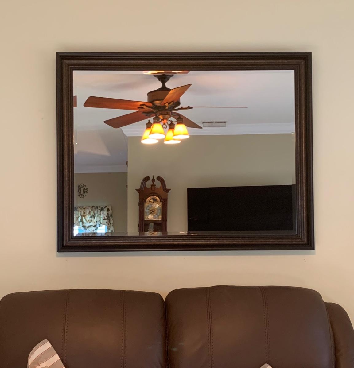 45x 35 inches. Large modern accent mirror, with black w/copper tones. Please see all pictures as they are the best representation of the items. The pictures show condition, measurements if taken, and what is included in the lot. Due to the large amount that we photograph and the time frame, we are not always able to take measurements. All items unless noted, are pre-owned and have been used. If you purchased furniture, you must bring help. We do not allow one person to carry large furniture out on their own. Bring help, tools and a truck for the safety of our client’s homes, and your personal safety. Any damages that result to the property including walls, and floors due to moving of the furniture will be charged to the buyer. Company policy. Thank you.