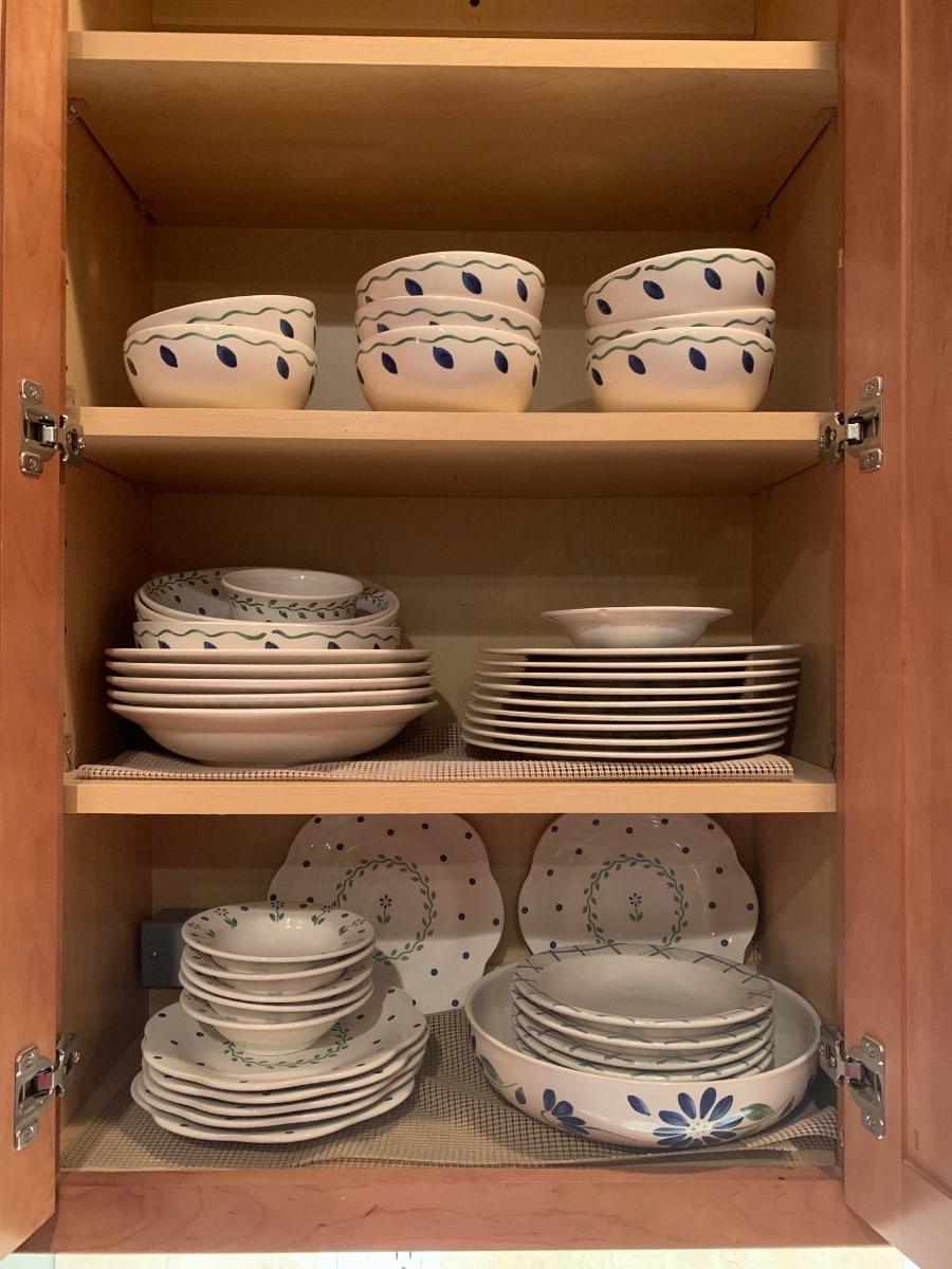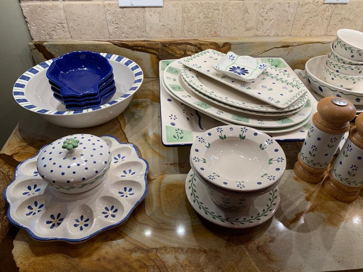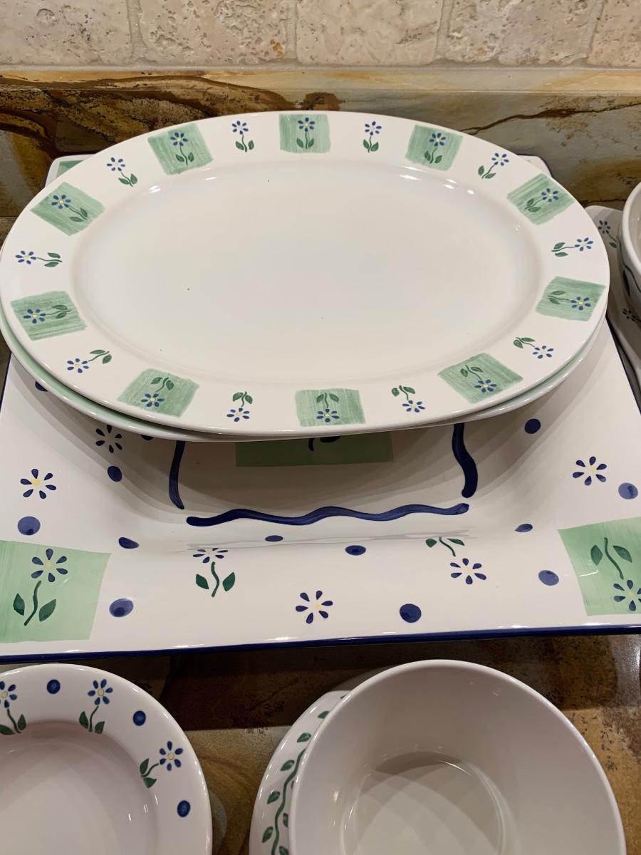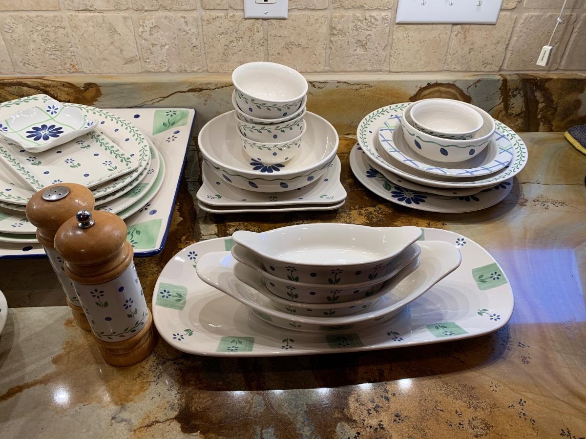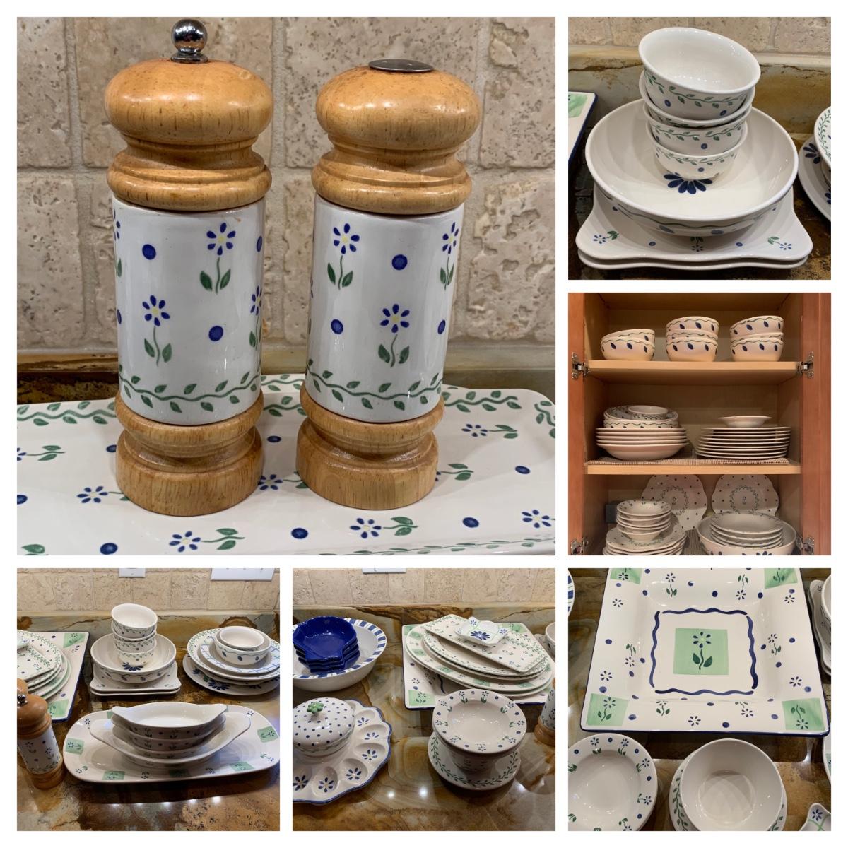 Lovely lot of mixed blue, green, and white dish sets by Pfaltzgraff including patterns such as Clover Hill and Springwood. These are pre-owned and do show surface scuffs from use. All dishes in the cabinet do have scuffs/crazing however the dishes shown or the counter do not show much wear or none at all.