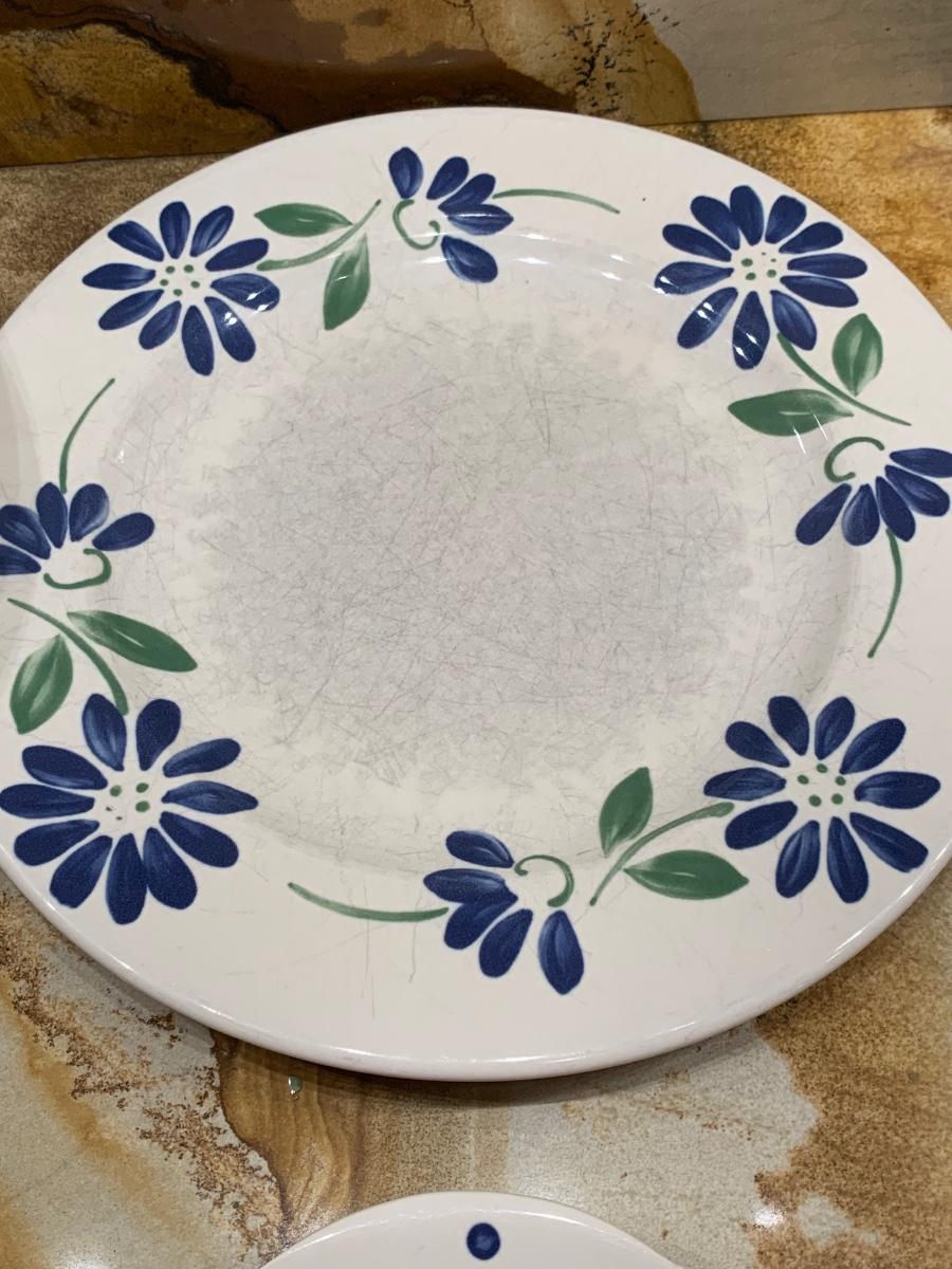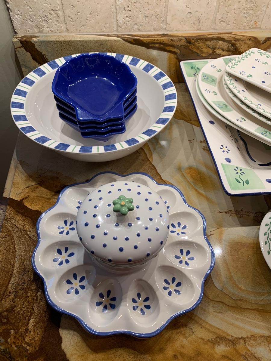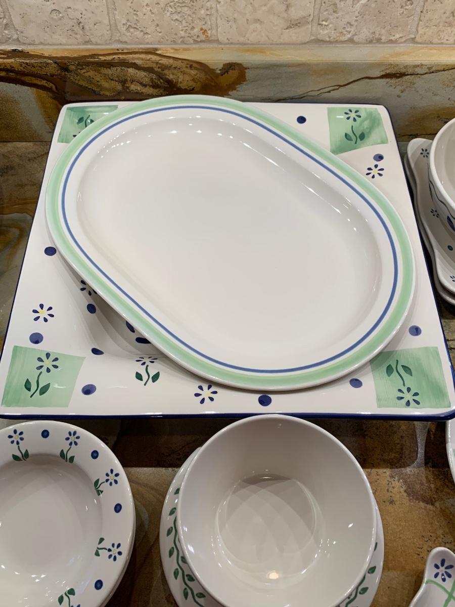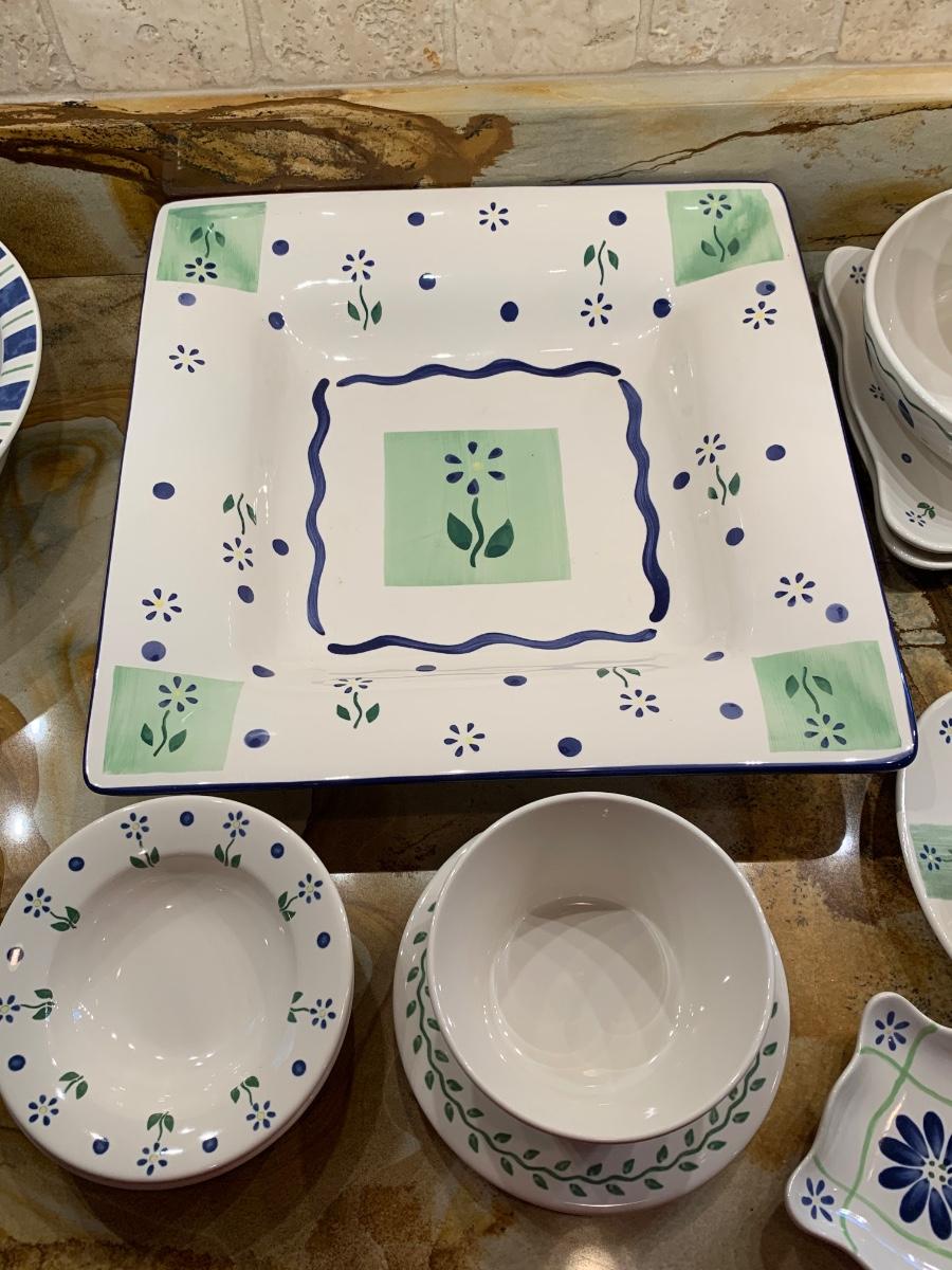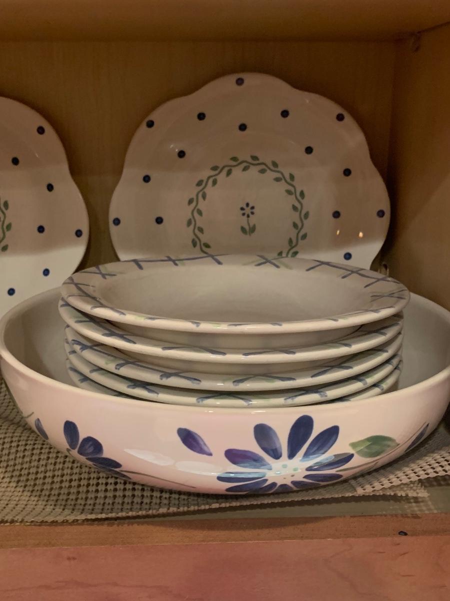 Lovely lot of mixed blue, green, and white dish sets by Pfaltzgraff including patterns such as Clover Hill and Springwood. These are pre-owned and do show surface scuffs from use. All dishes in the cabinet do have scuffs/crazing however the dishes shown or the counter do not show much wear or none at all.