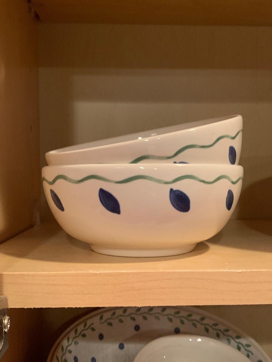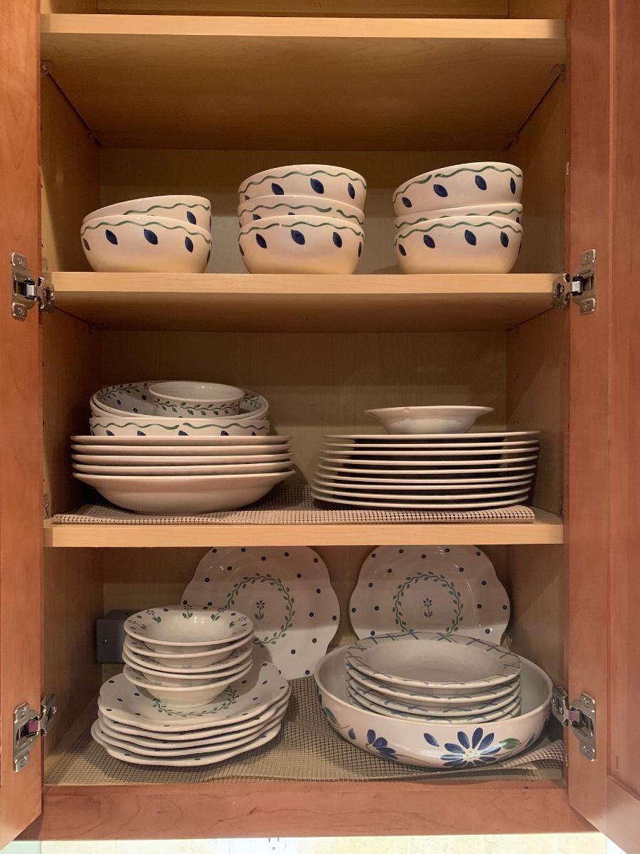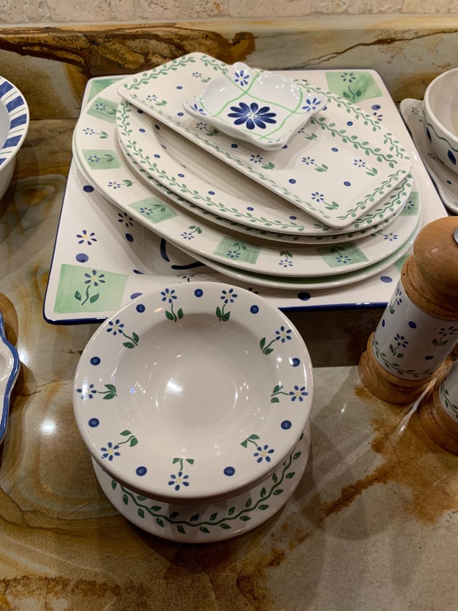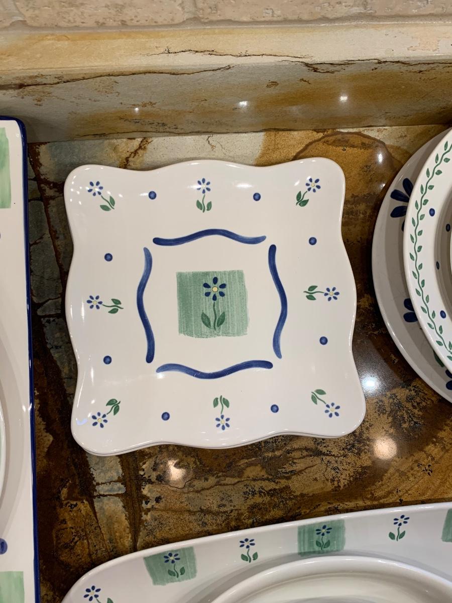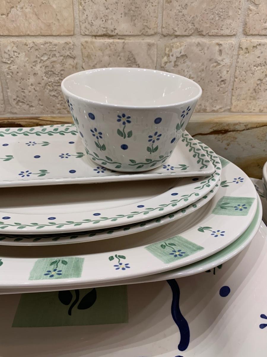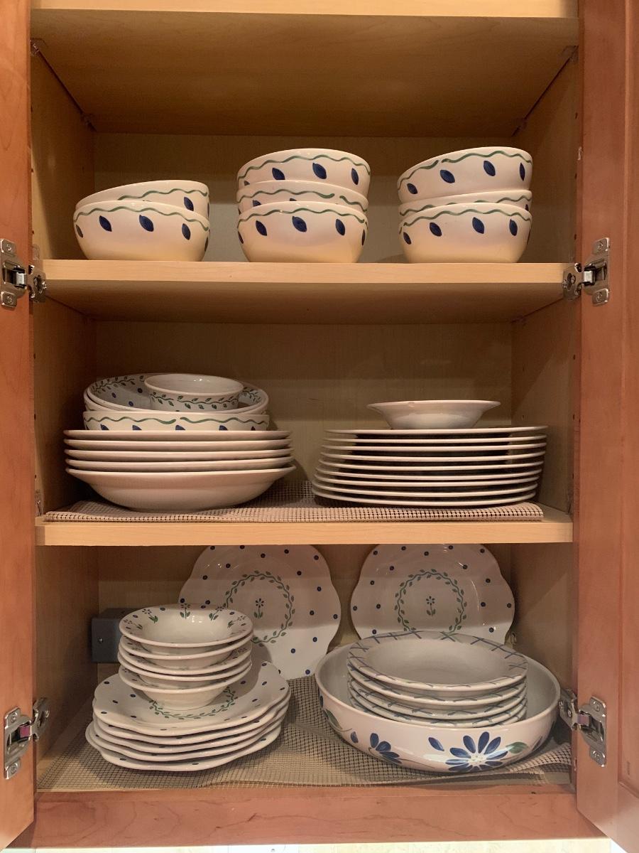 Lovely lot of mixed blue, green, and white dish sets by Pfaltzgraff including patterns such as Clover Hill and Springwood. These are pre-owned and do show surface scuffs from use. All dishes in the cabinet do have scuffs/crazing however the dishes shown or the counter do not show much wear or none at all.