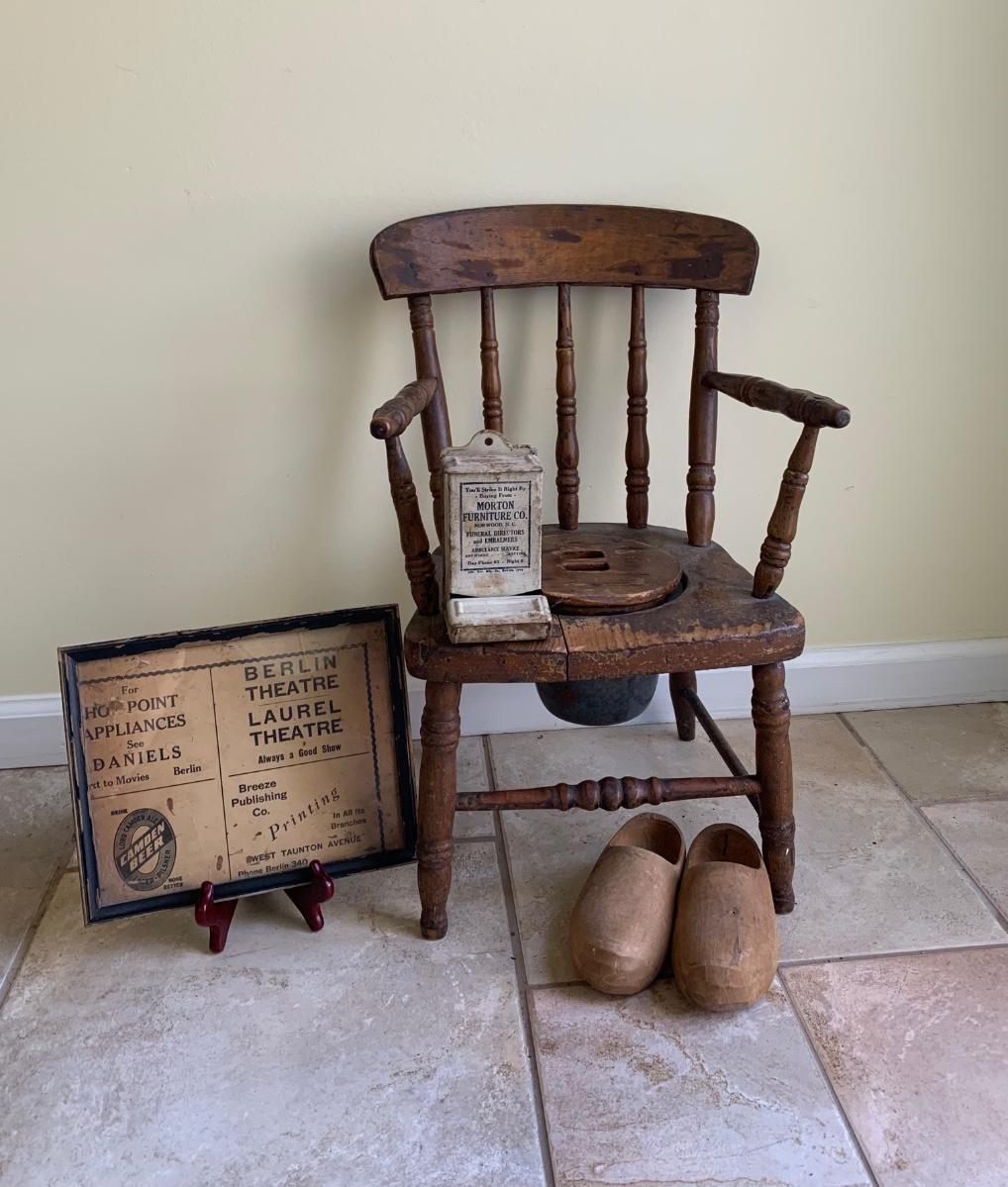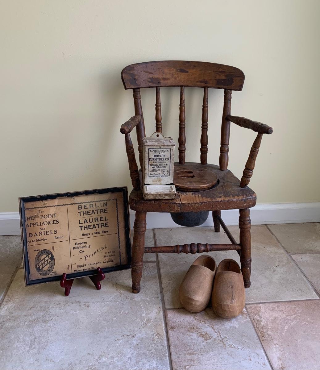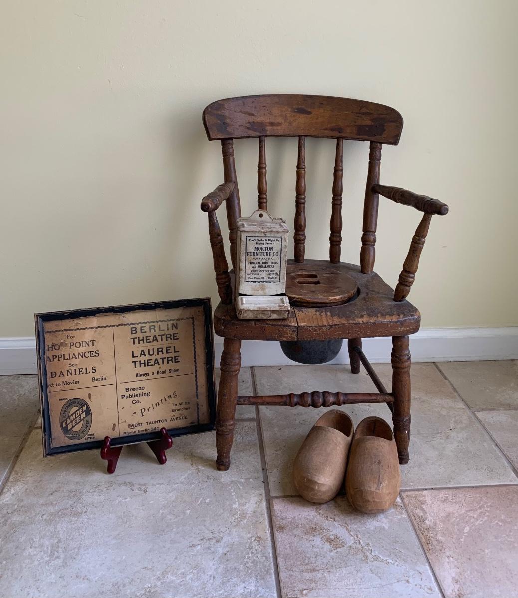 Nice primitive lot of items including: framed theatre advertisement, childs potty chair with pail/wood lid, wood shoes, and advertising match holder. All show wear due to age and use. Please see all pictures as they are the best representation of the items. The pictures show condition, measurements if taken, and what is included in the lot. Due to the large amount that we photograph and the time frame, we are not always able to take measurements. All items unless noted, are pre-owned and have been used. If you purchased furniture, you must bring help. We do not allow one person to carry large furniture out on their own. Bring help, tools and a truck for the safety of our client’s homes, and your personal safety. Any damages that result to the property including walls, and floors due to moving of the furniture will be charged to the buyer. Company policy. Thank you.