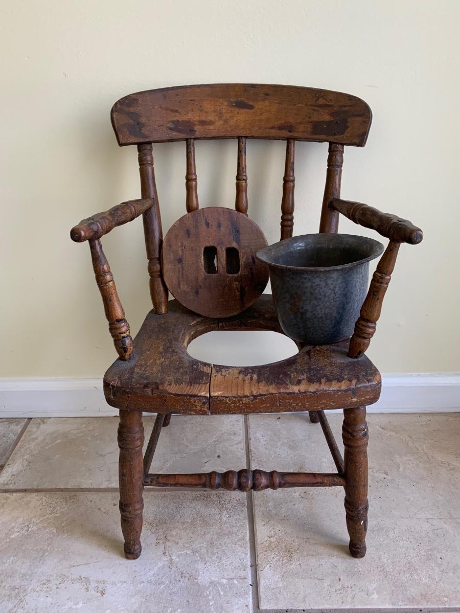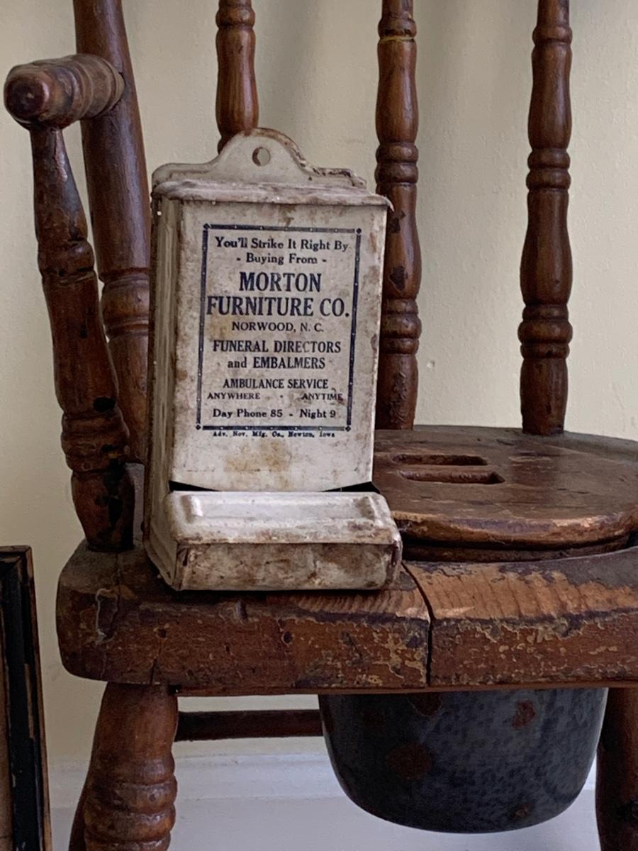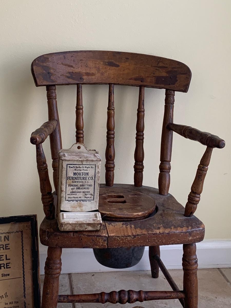 LOT 69: Primitive Lot: Advertising Wall Match Holder, Childs Potty Chair and More