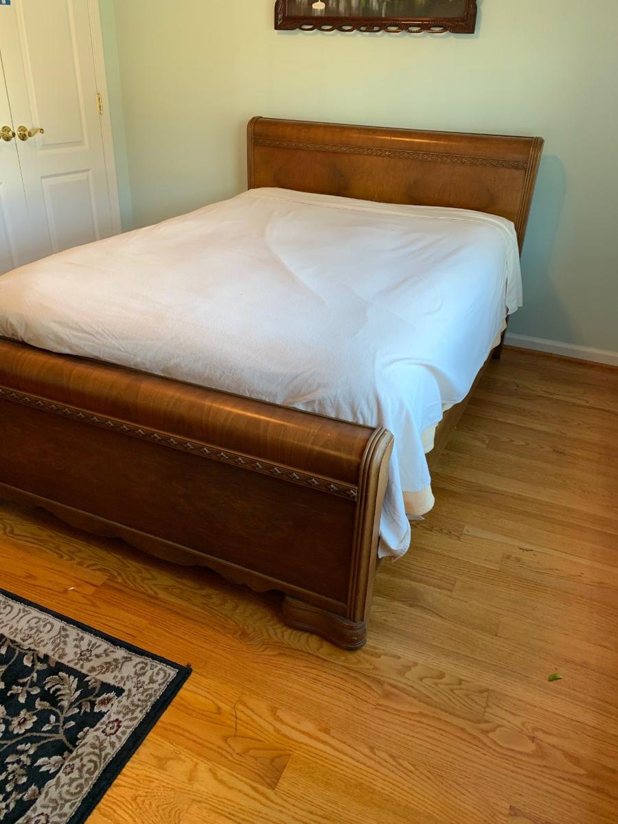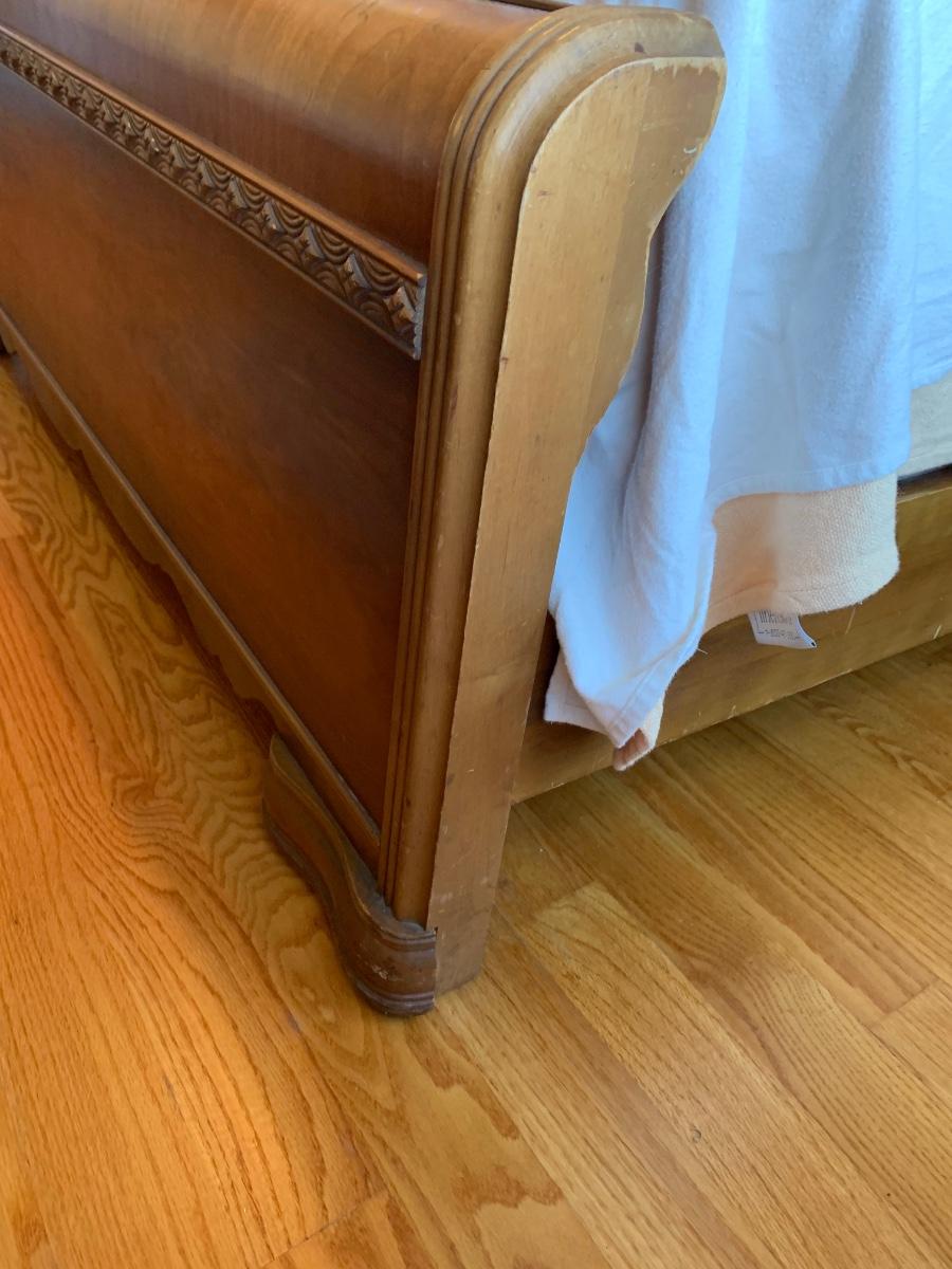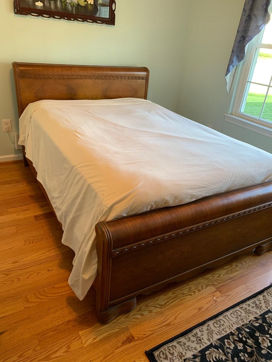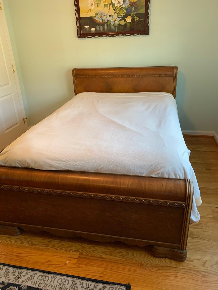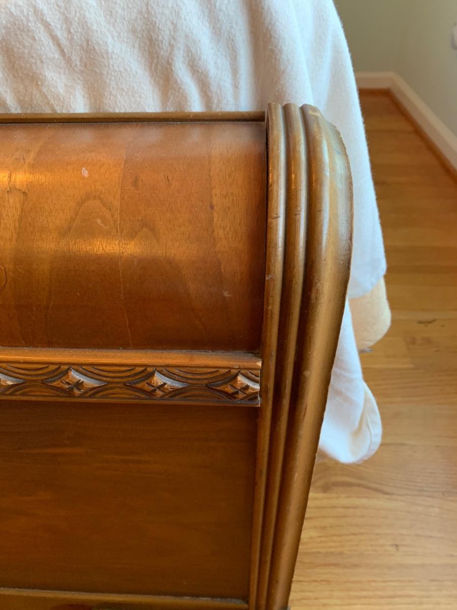 This is a lovely head & foot board set. Solid in function and design. Does have imperfections due to use and age such as: age marks to mirror, nicks, and scratches to wood.