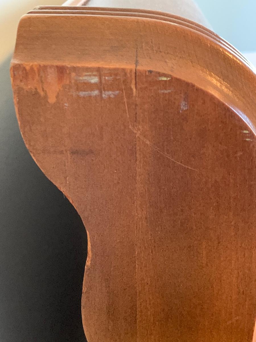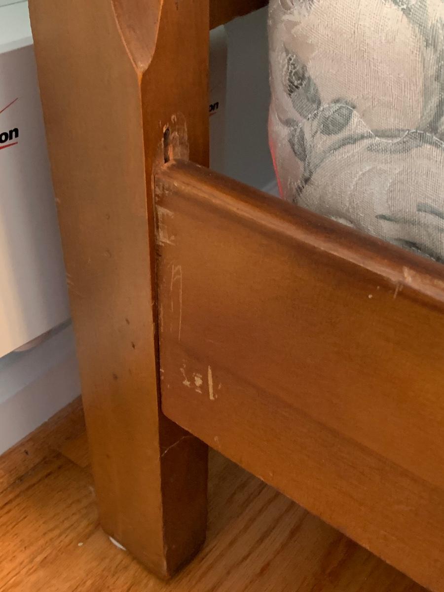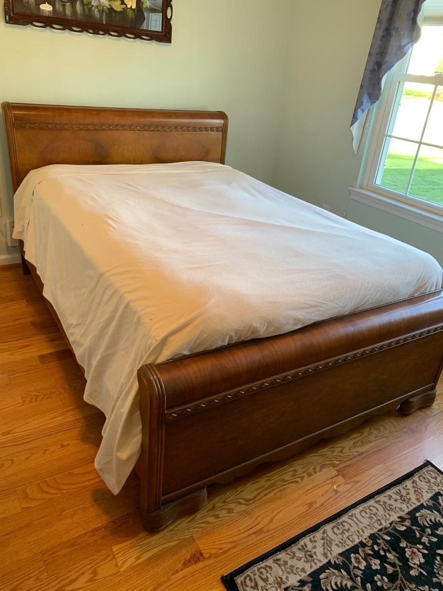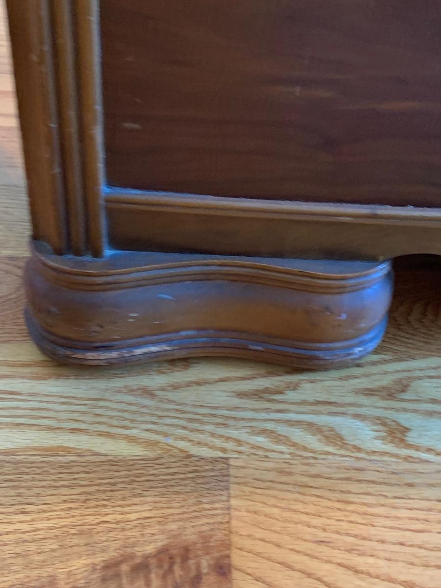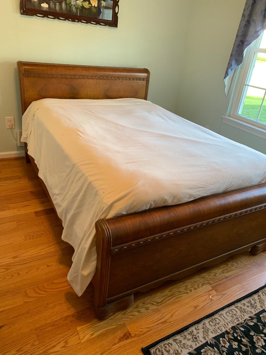 This is a lovely head & foot board set. Solid in function and design. Does have imperfections due to use and age such as: age marks to mirror, nicks, and scratches to wood.