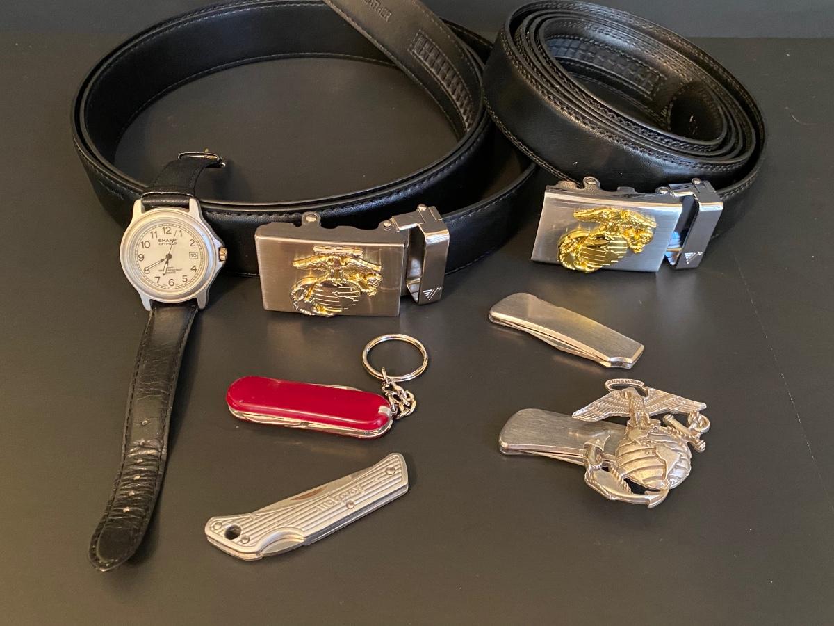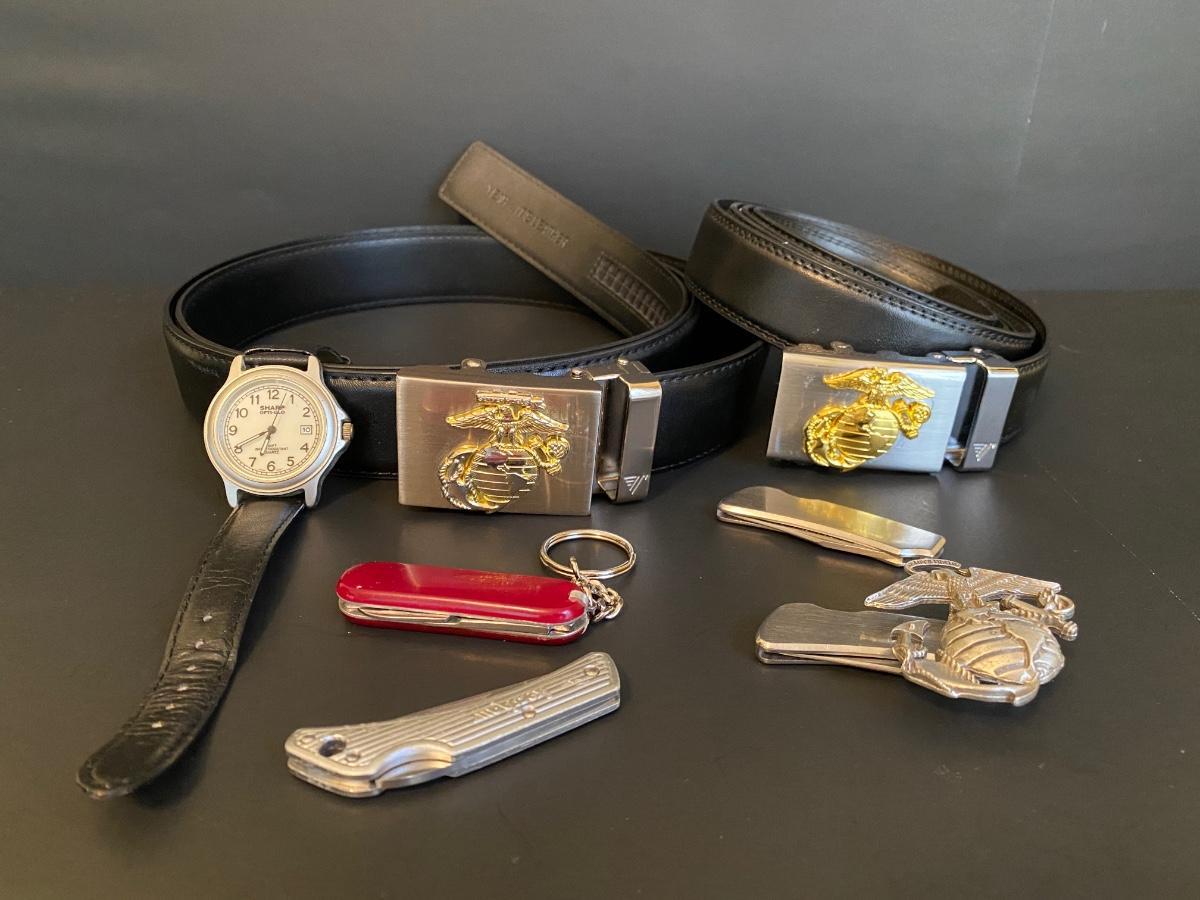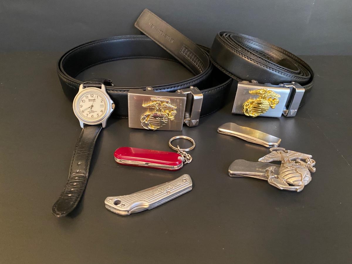 LOT C86: Dresser Finds: Marine Corps Belts, Watch, Pocket Knives and More