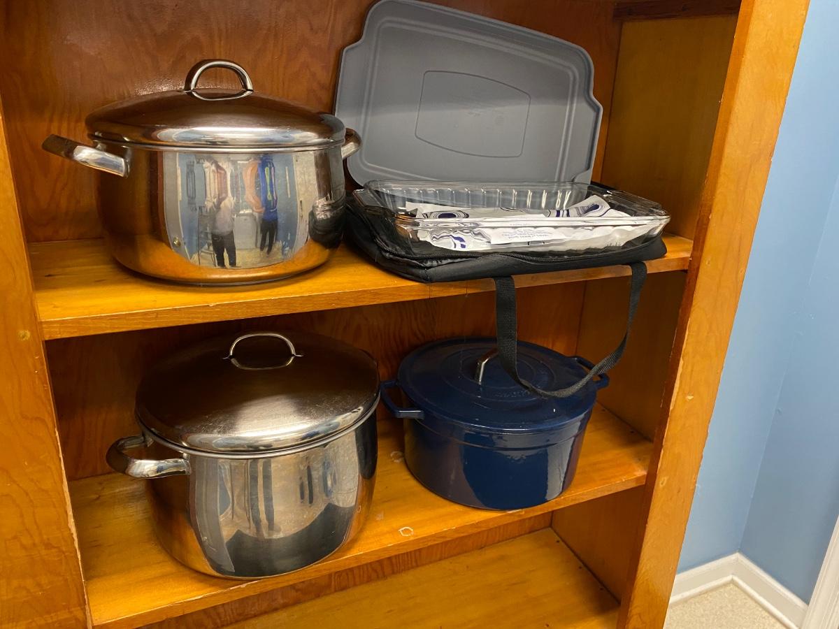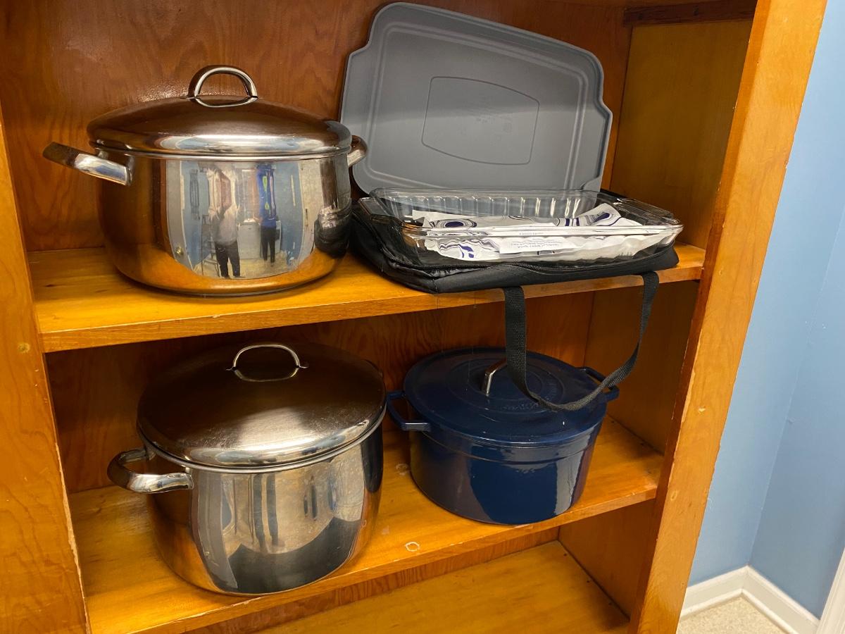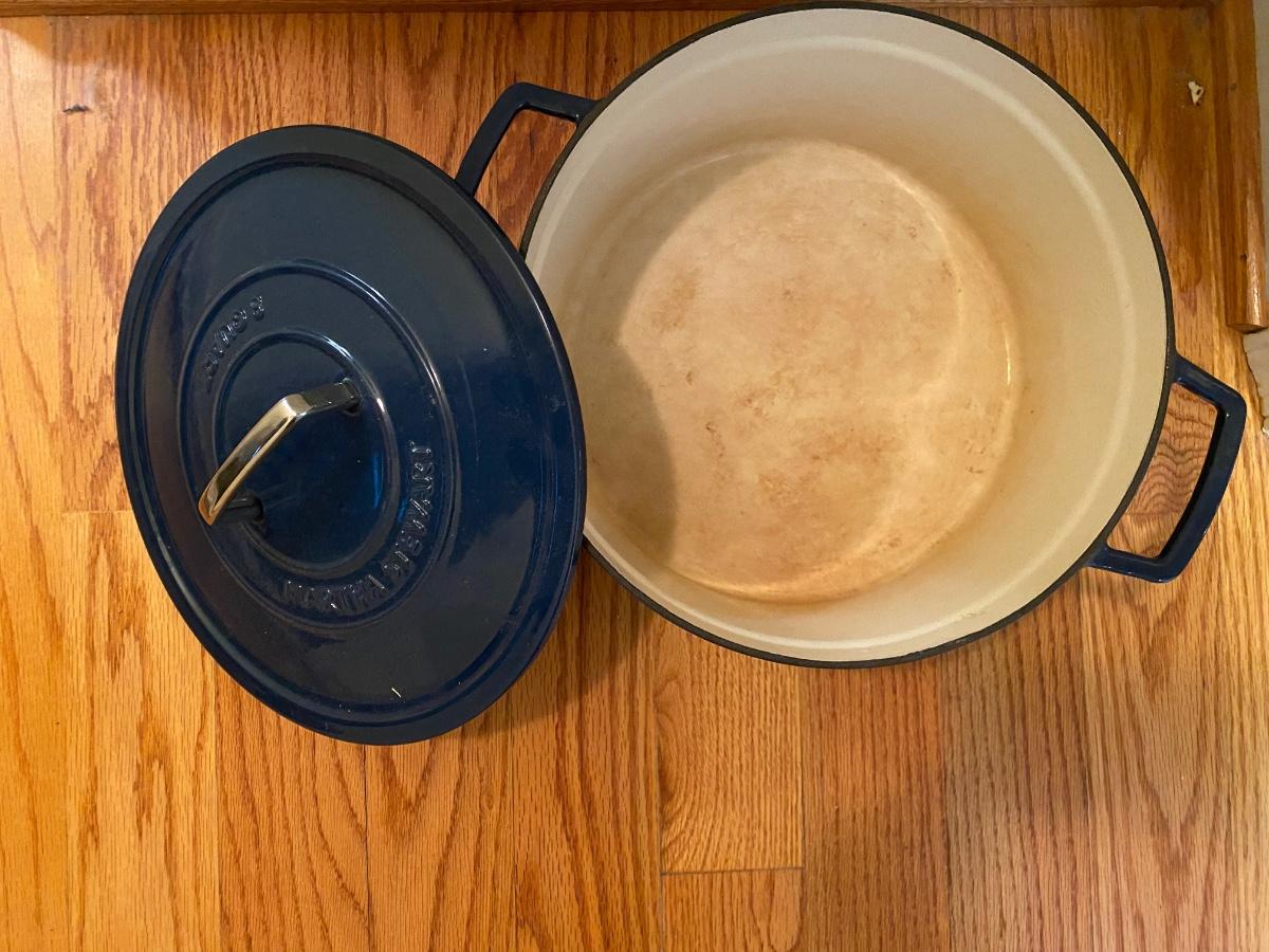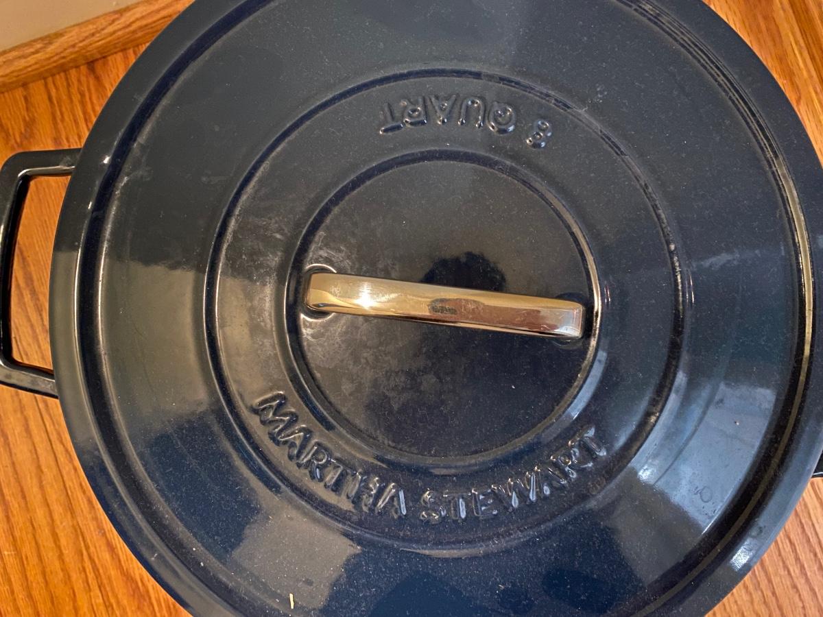 LOT C94: Martha Stewart Cast Iron Dutch Oven, Stockpots, and Anchor Hocking Travel Casserole