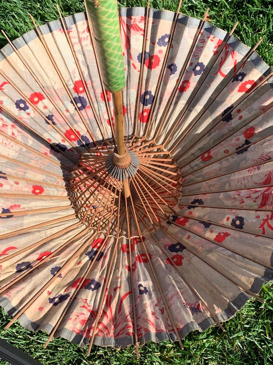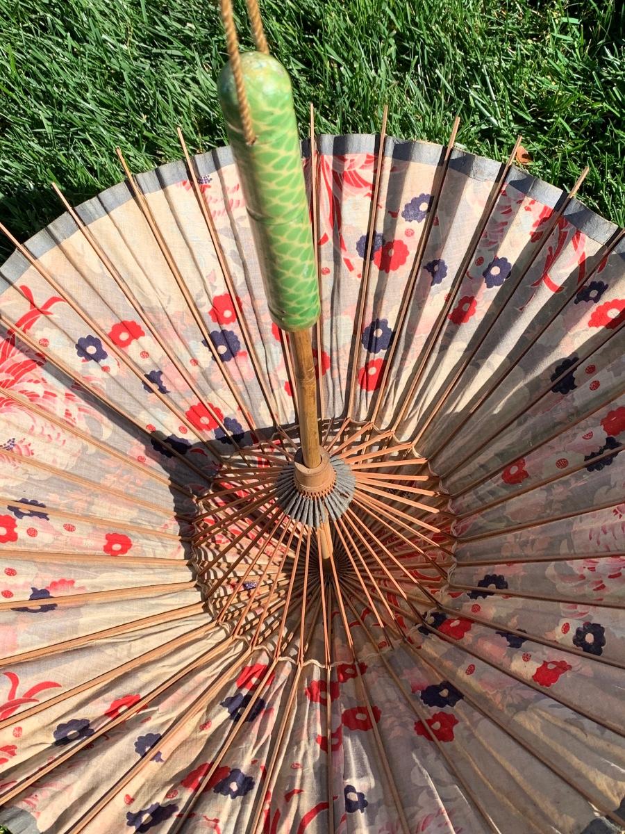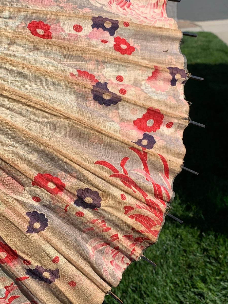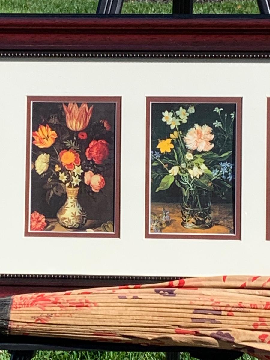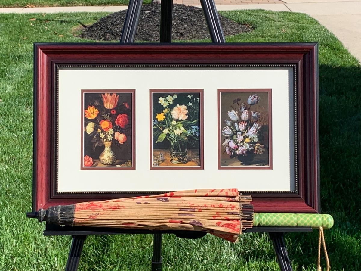LOT 135: Vintage Fabric Parasol and Framed Floral Prints