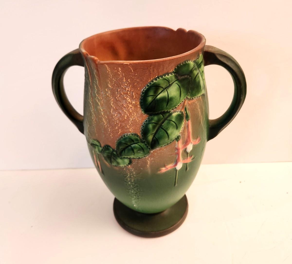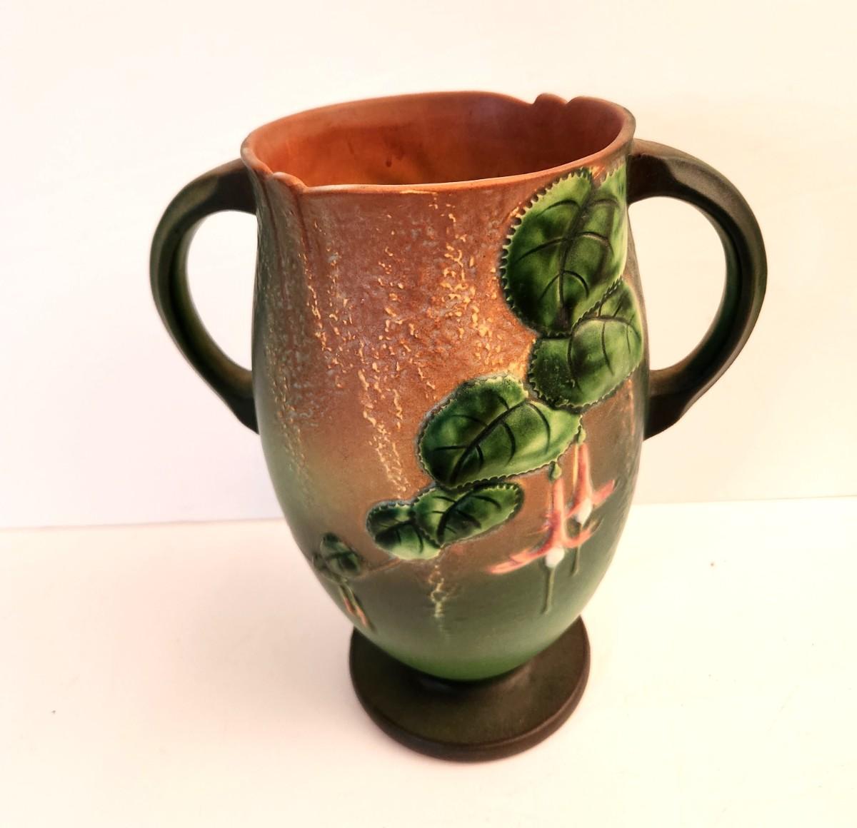 Love this one - vintage Roseville Vase in the "Fuchsia" pattern - 10" tall, 2 handles, good condition.