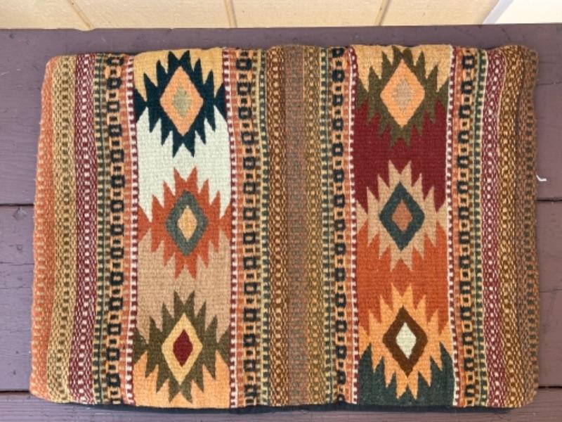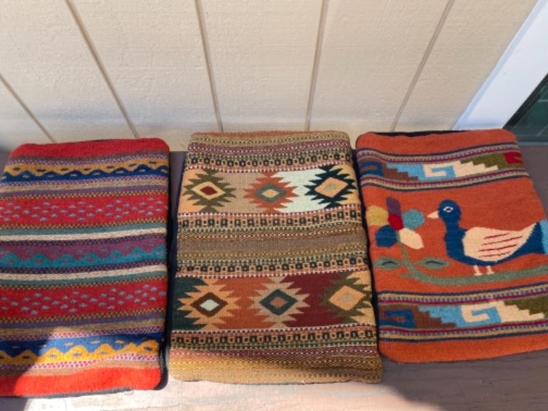 Lot 7LD. Three assorted folk art pillows sizes left to right: 19 1/2”L x 13”W, 20 1/2”L x 15”W, 19”L x 14 1/2”W“”$75