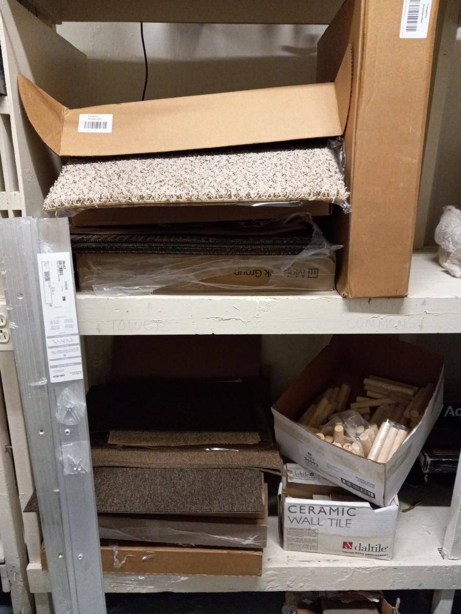 CARPET SQUARES -BOX OF WOOD PIECES AND MORE