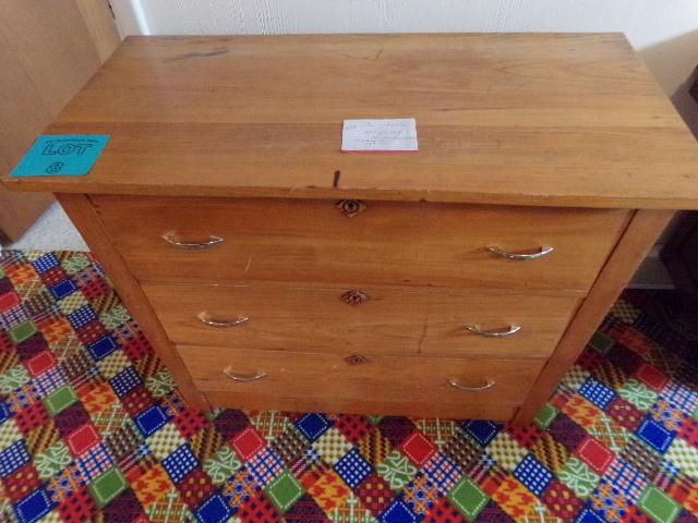 3 DRAWERS, SOLID WOOD DRESSER WITH WHEELS. IT IS IN GOOD CONDITION CONSIDERING THE AGE OF THIS DRESSER.