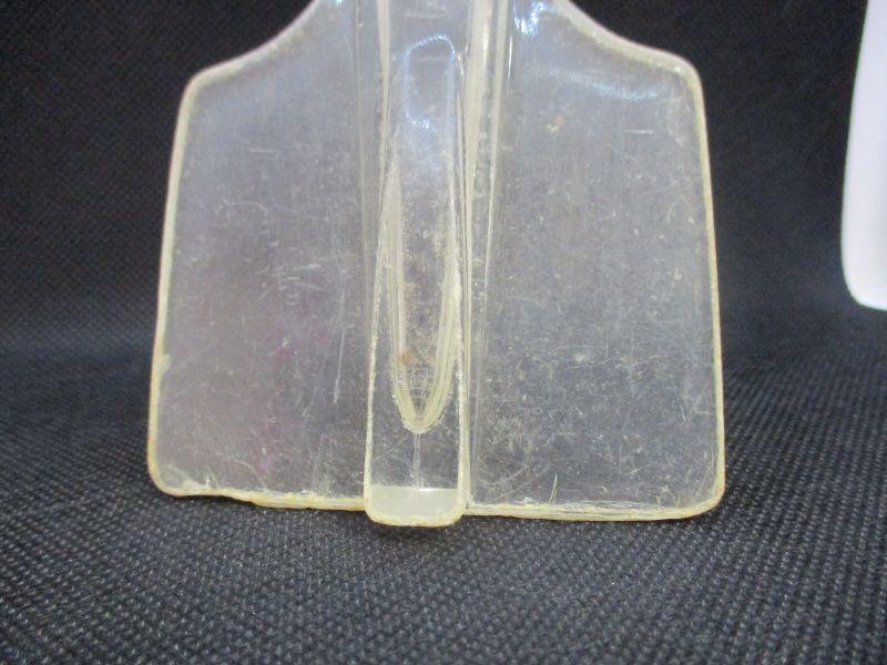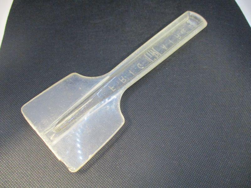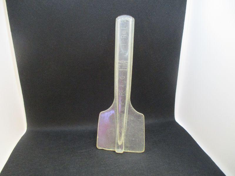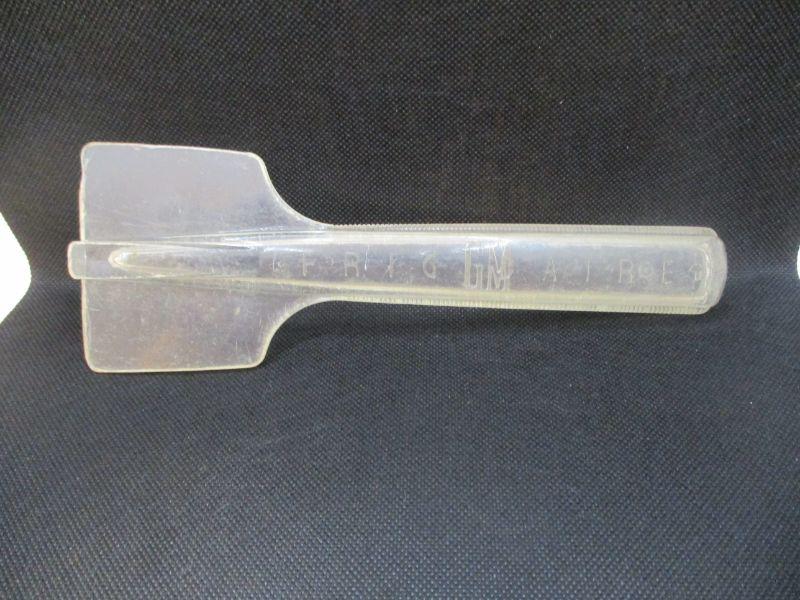 This is a hard plastic ice scraper that is about 9" in length. It shows signs that it was well used - the scraper end is a little chipped/rough and it is scratched. I found a couple online which indicate that these were distributed in the 1950s.