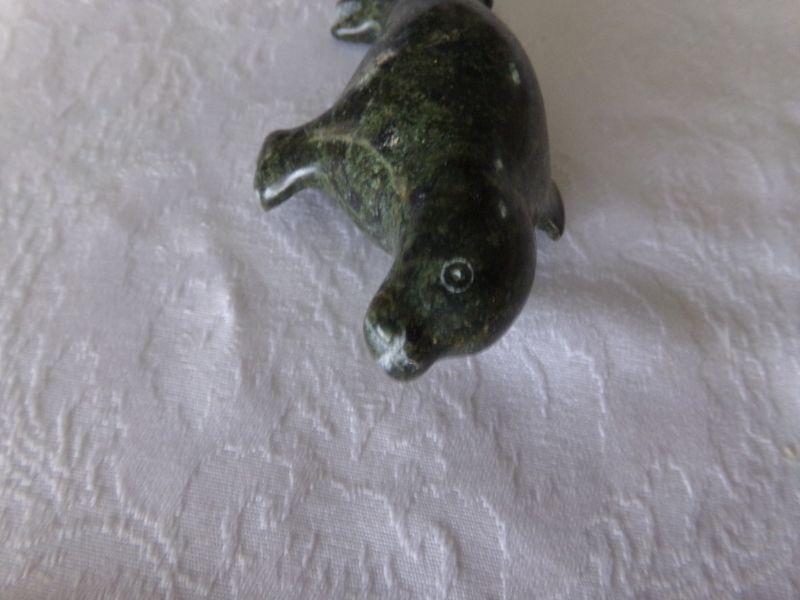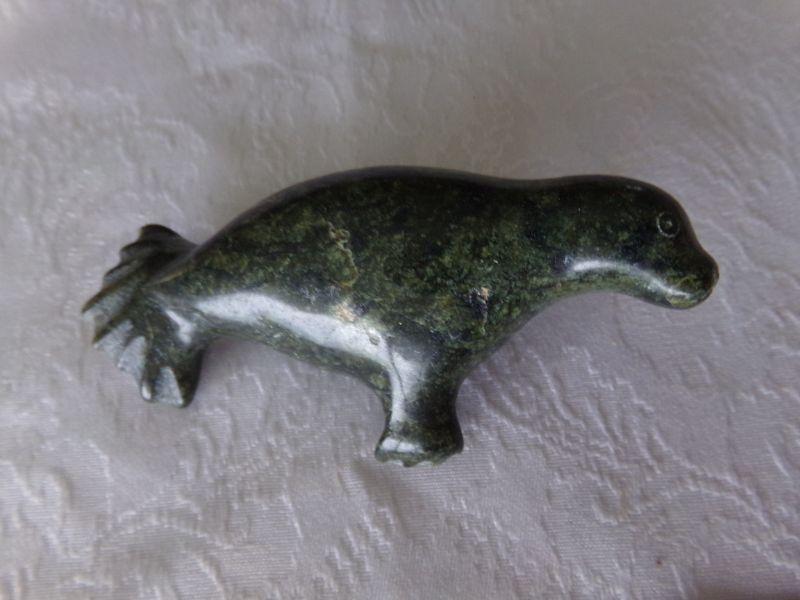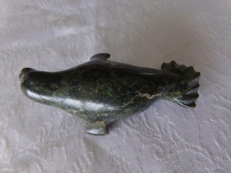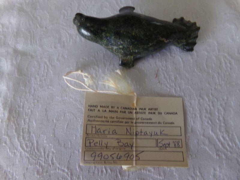 HAND MADE CARVED SEAL BY INUK ARTIST MARIA NIPTAYUK SEPT. '88 APPROX. 4" INCHES LONG.