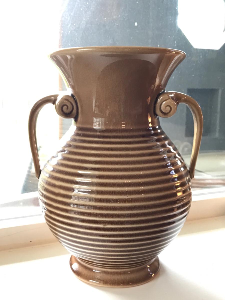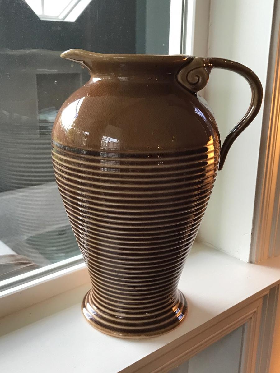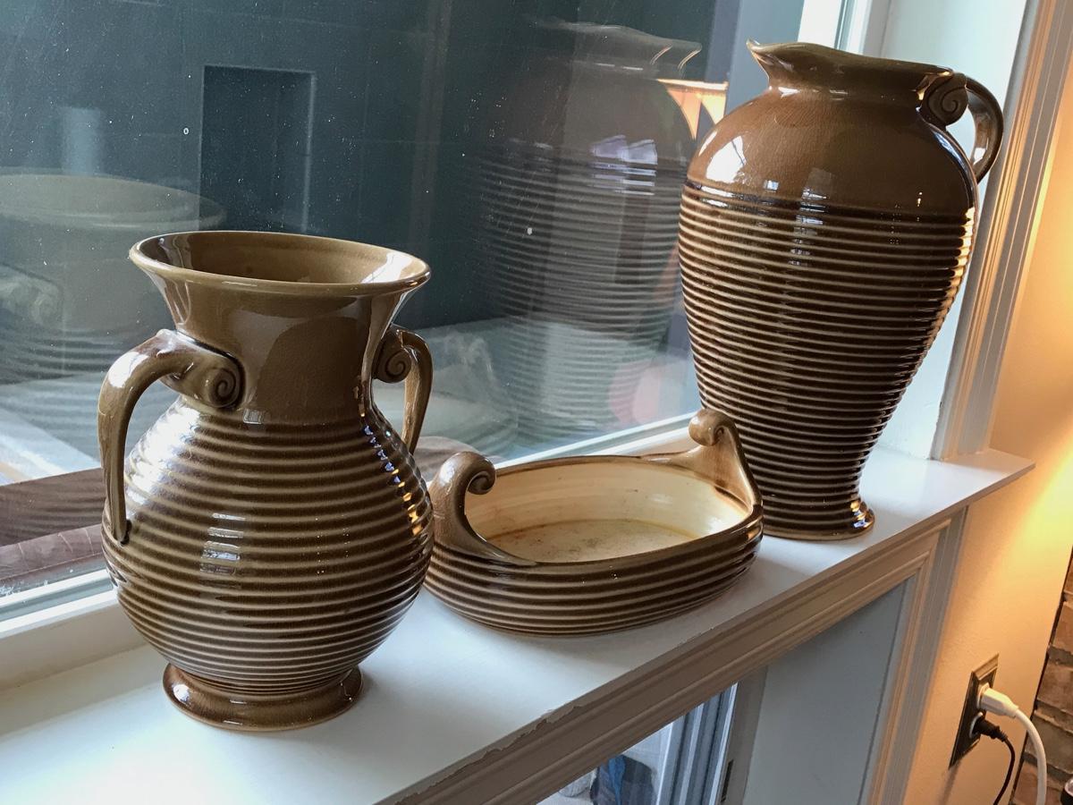 3 piece gold ringed ceramic set. Pitcher (14"H x 10"W), urn (9"H x 7"W), platter/low bowl (10.25"L x 6.75"W)