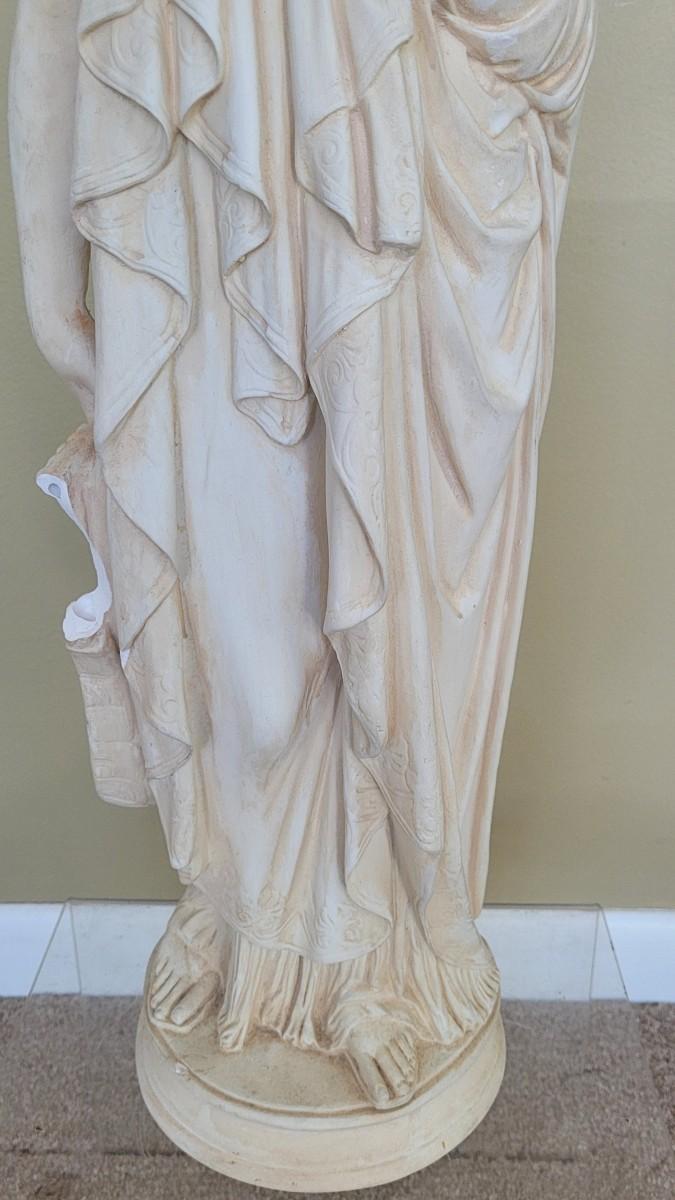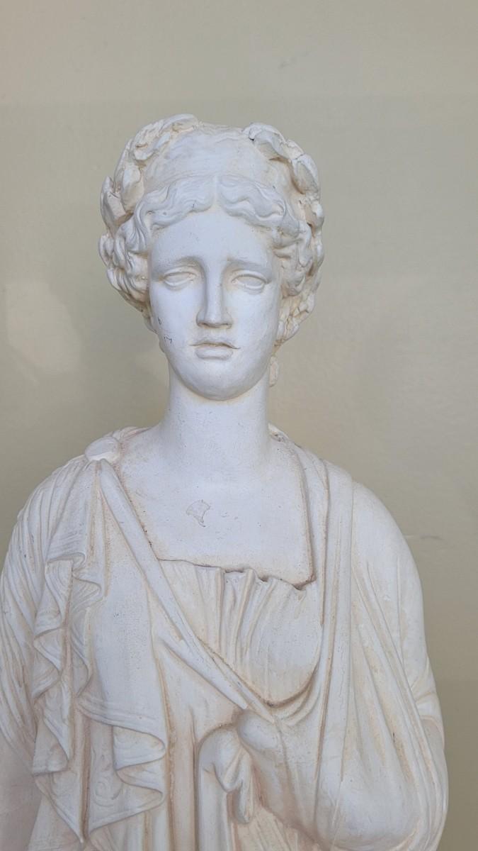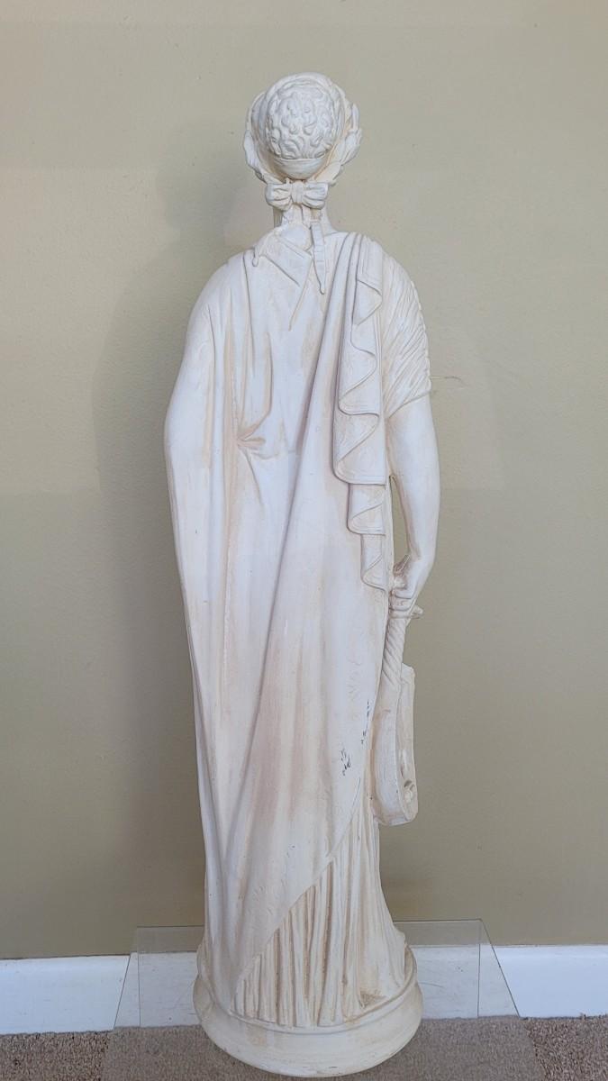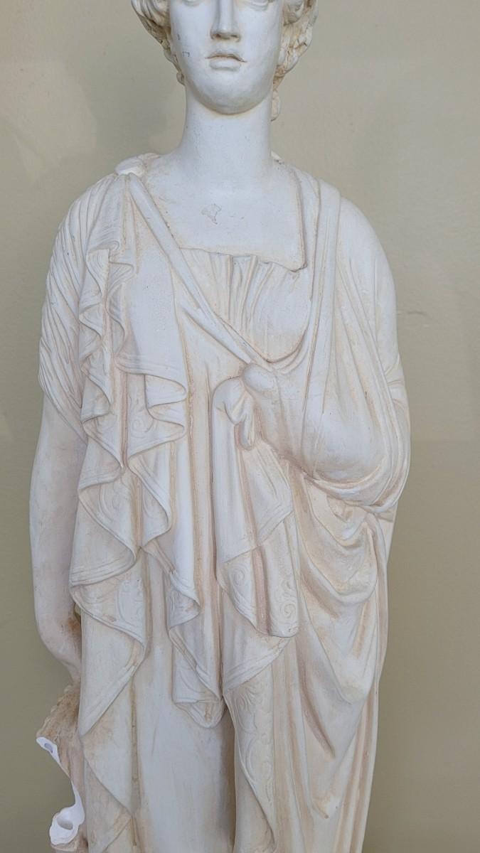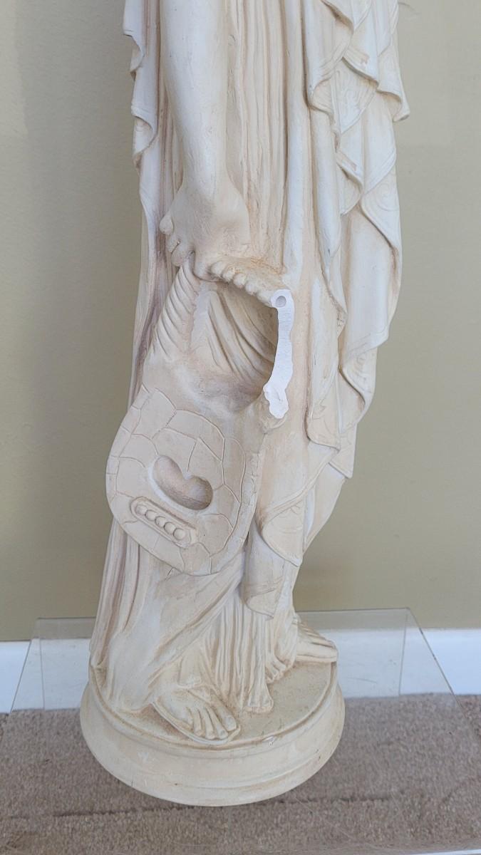 The music instrument she is holding has a break. The piece that is missing is not present. Still beautiful.