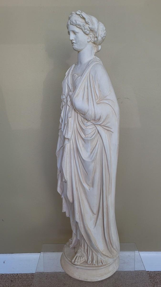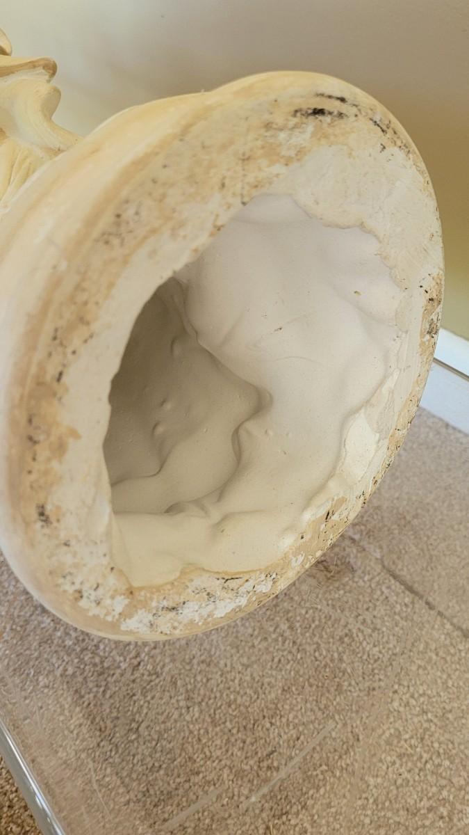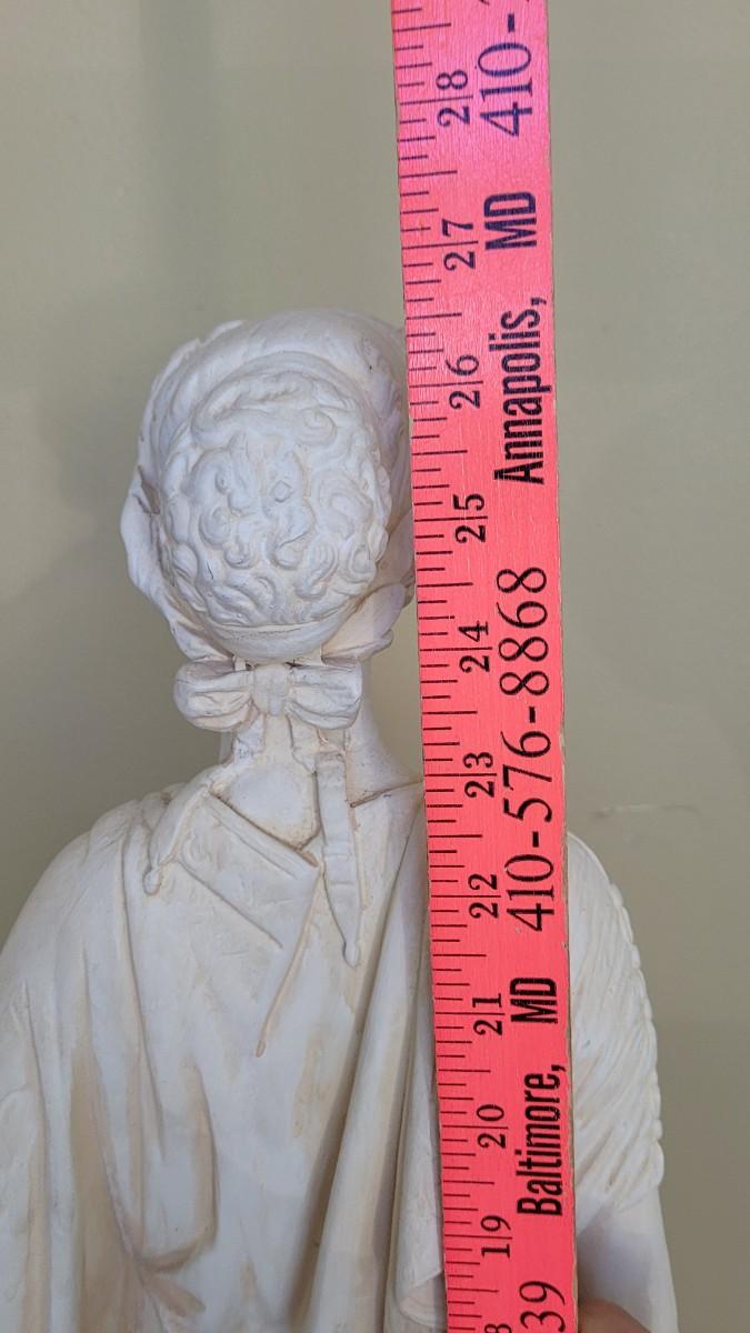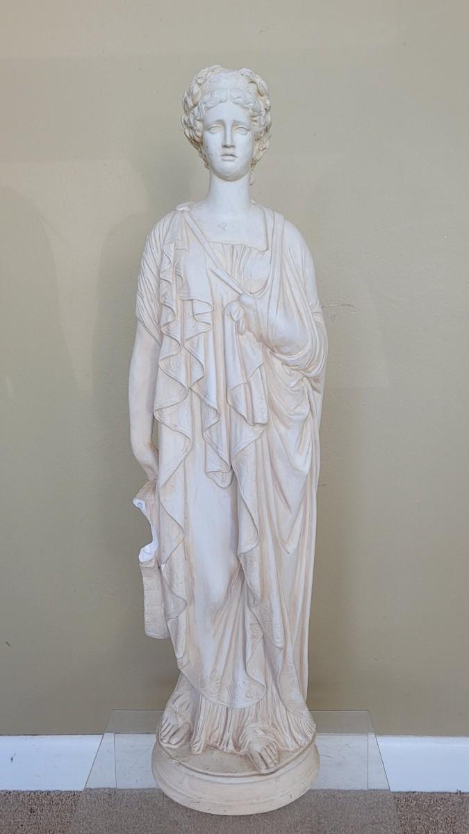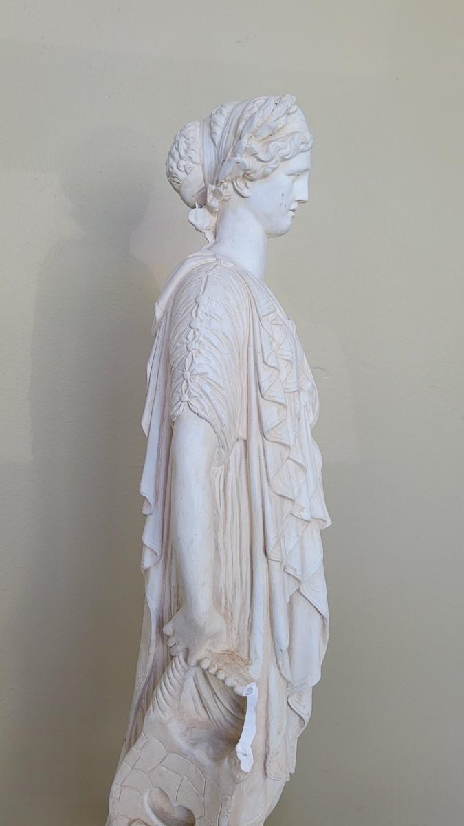 The music instrument she is holding has a break. The piece that is missing is not present. Still beautiful.