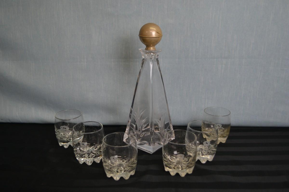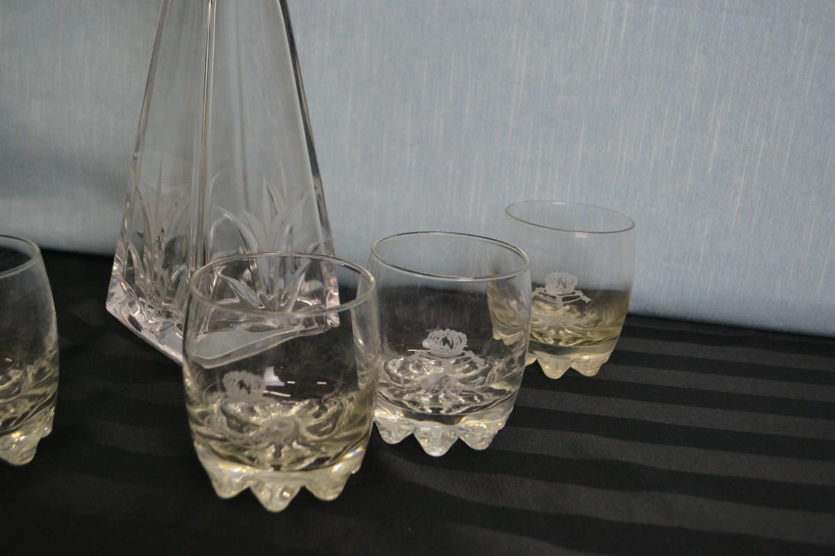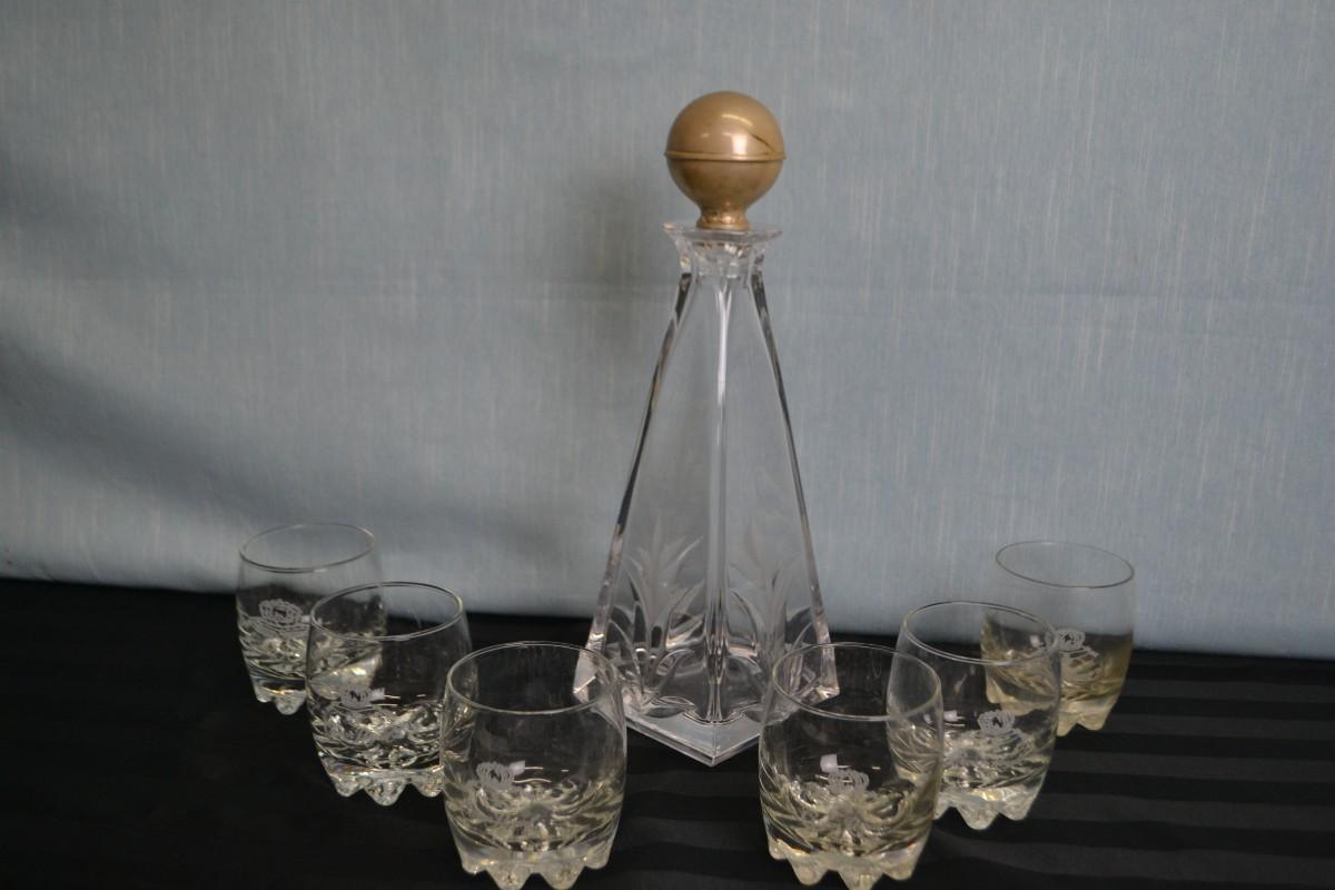 LOT 8. VINTAGE MARIO CIONI VINTAGE DECANTER AND CROWN ROYAL GLASSES