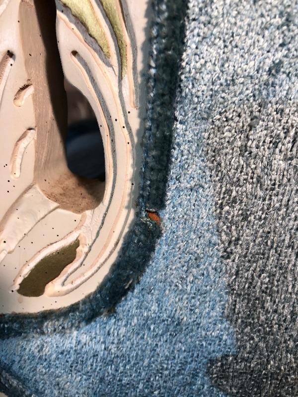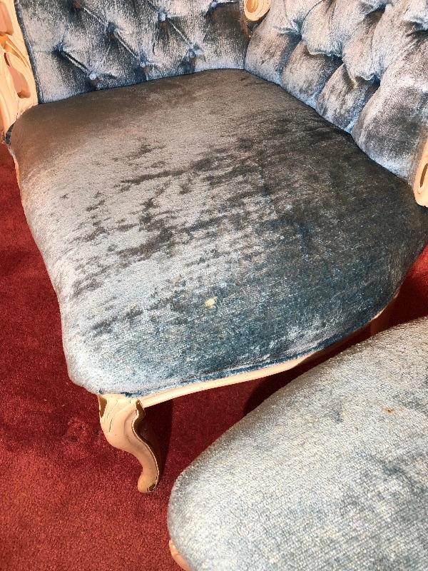 Small mark on one chair (wear and tear on cushion) and small blemish on upholstery on one chairs show in pictures.