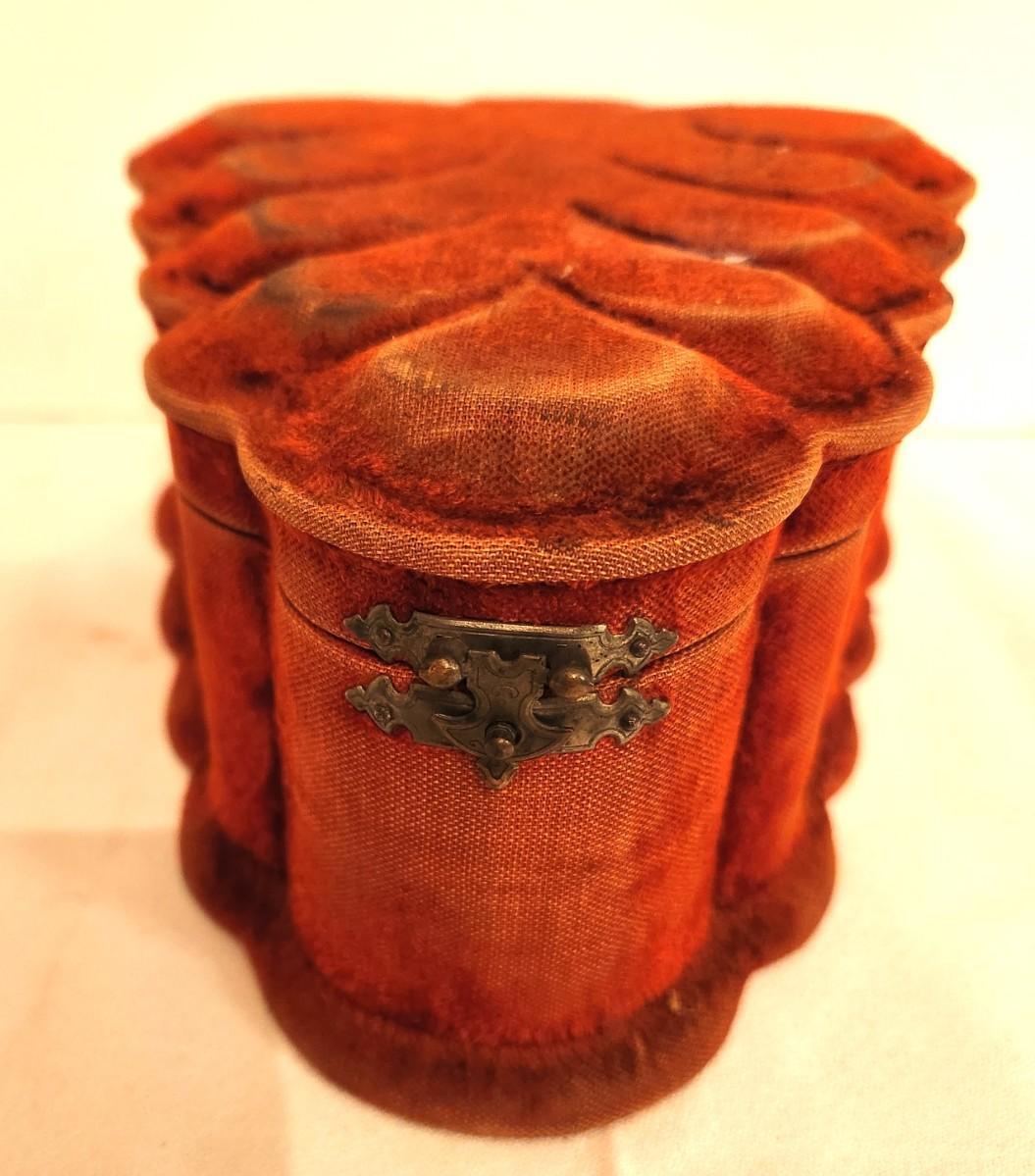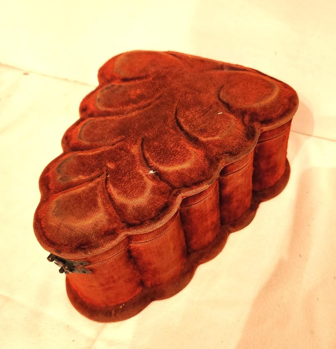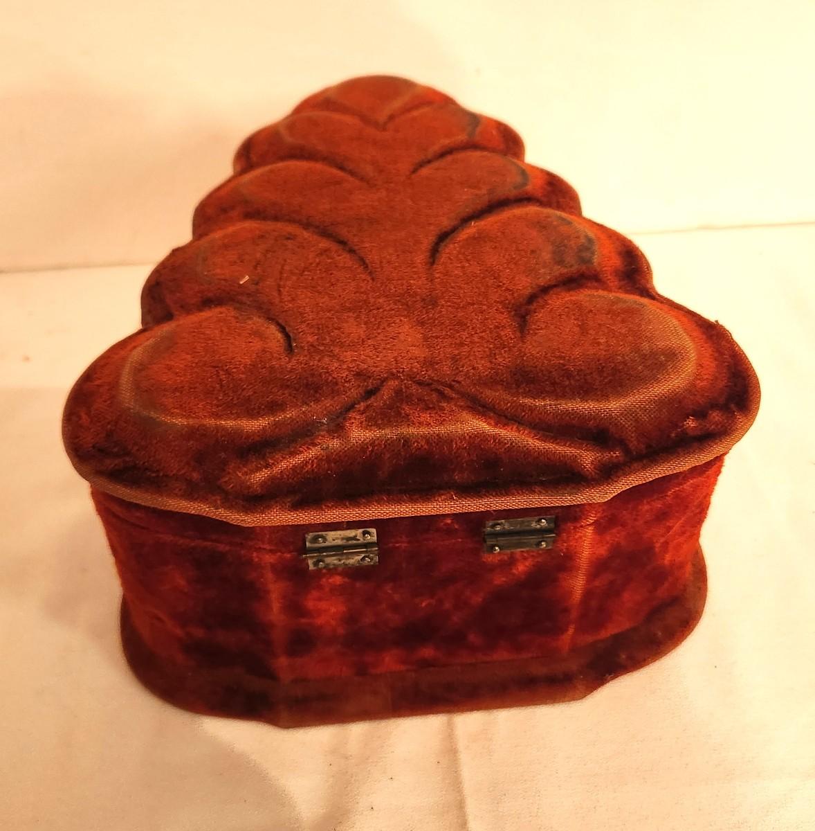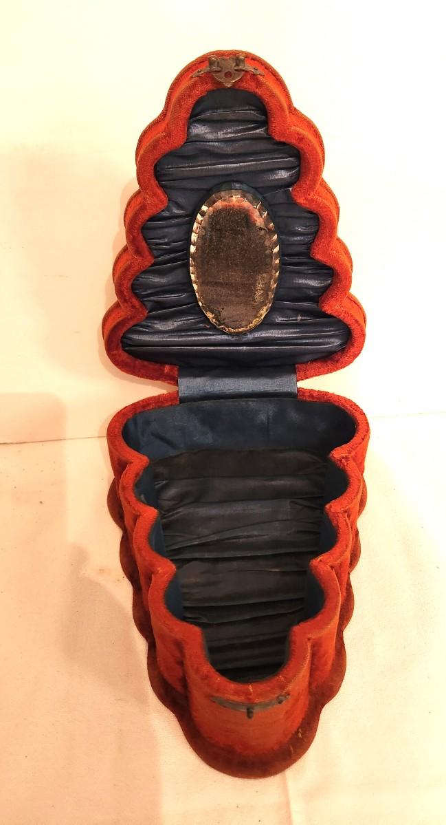Victorian era (ca. 1870) velveteen dresser/jewelry box - hinged/mirrored. Antique condition. 9.5" long, 4" tall.