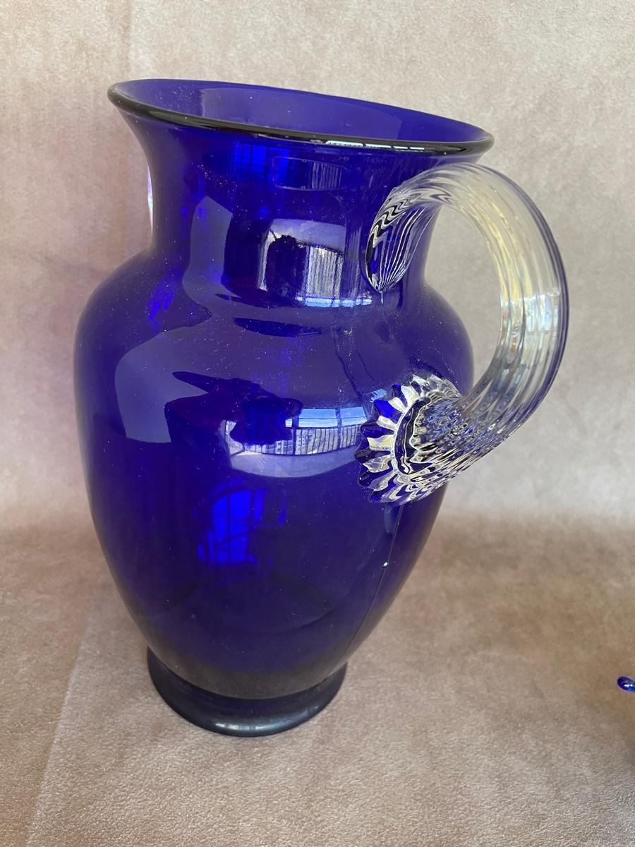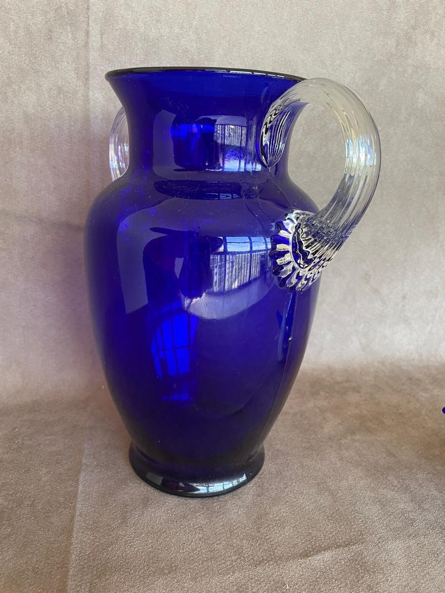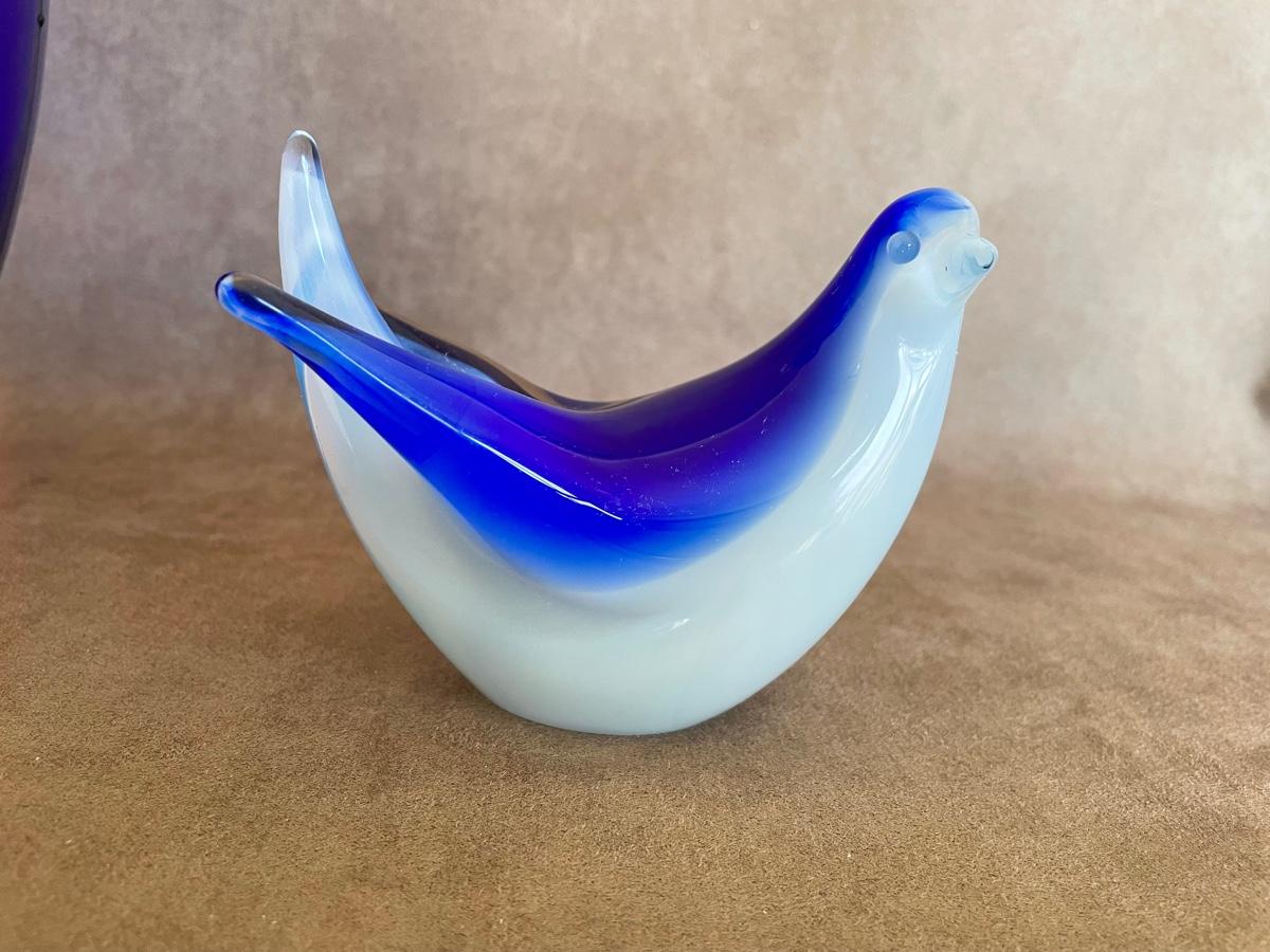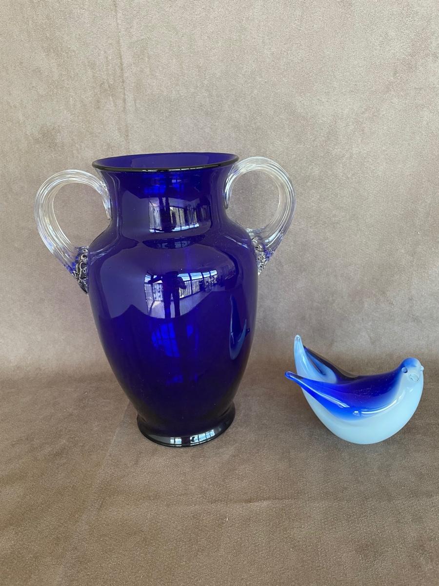 Cobalt blue vase with clear handles and a blown glass bird figurine