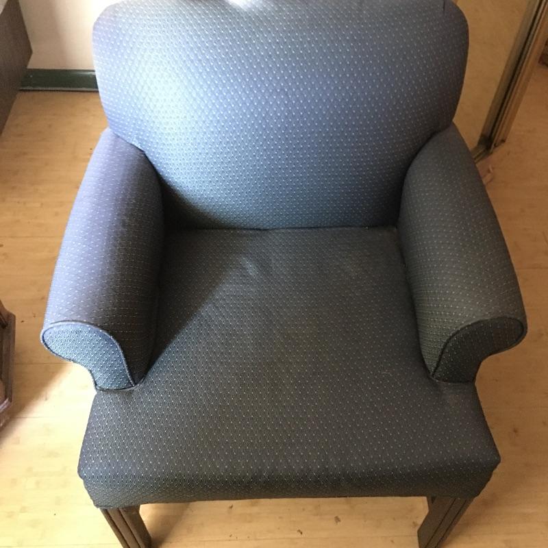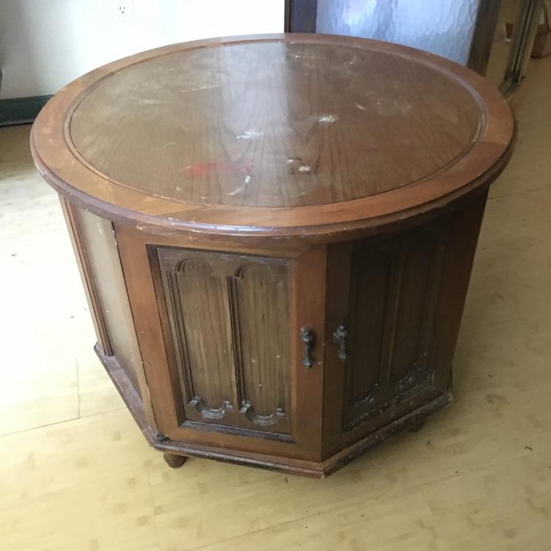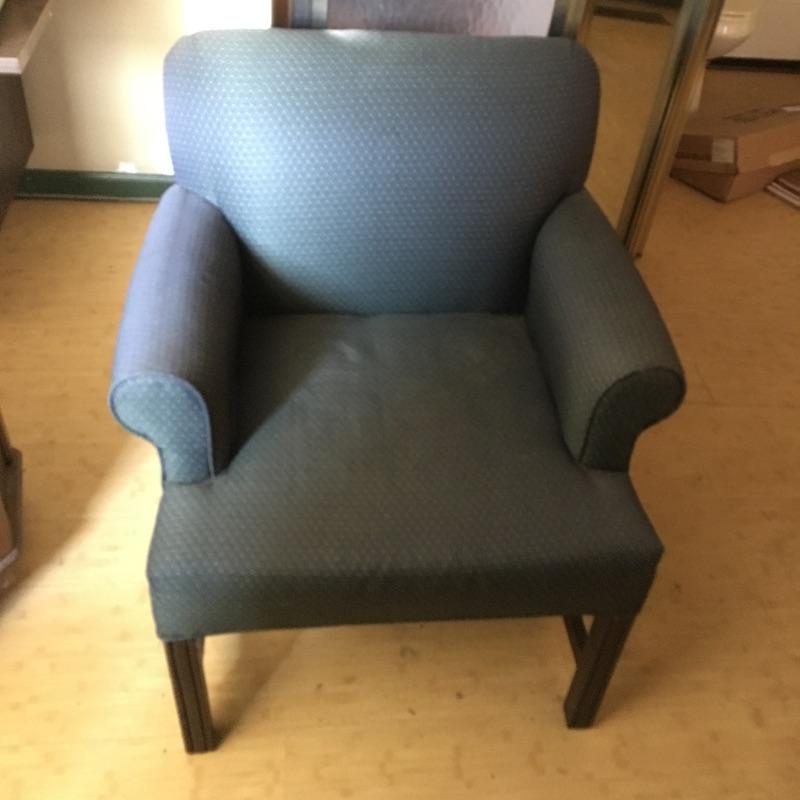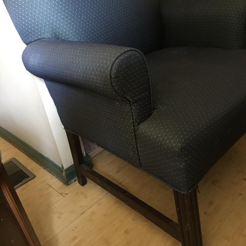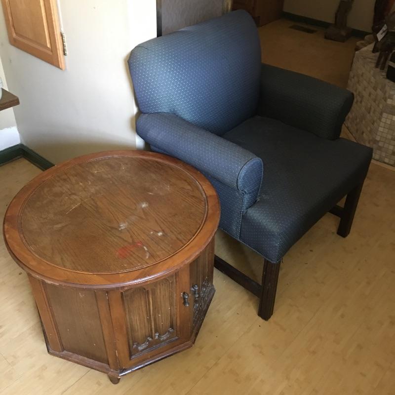 Armchair and side table. Lot includes footed side table with storage cabinet underneath and a armchair. Table is press board and is scratched and marked, chair has pet hair on it but no stains apparent, see pictures. Chair measures 27” x 30” x 35” with a 18.5” seat height.
