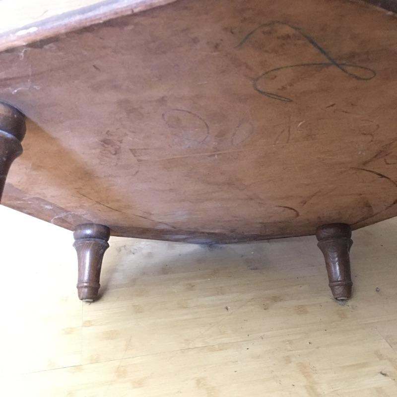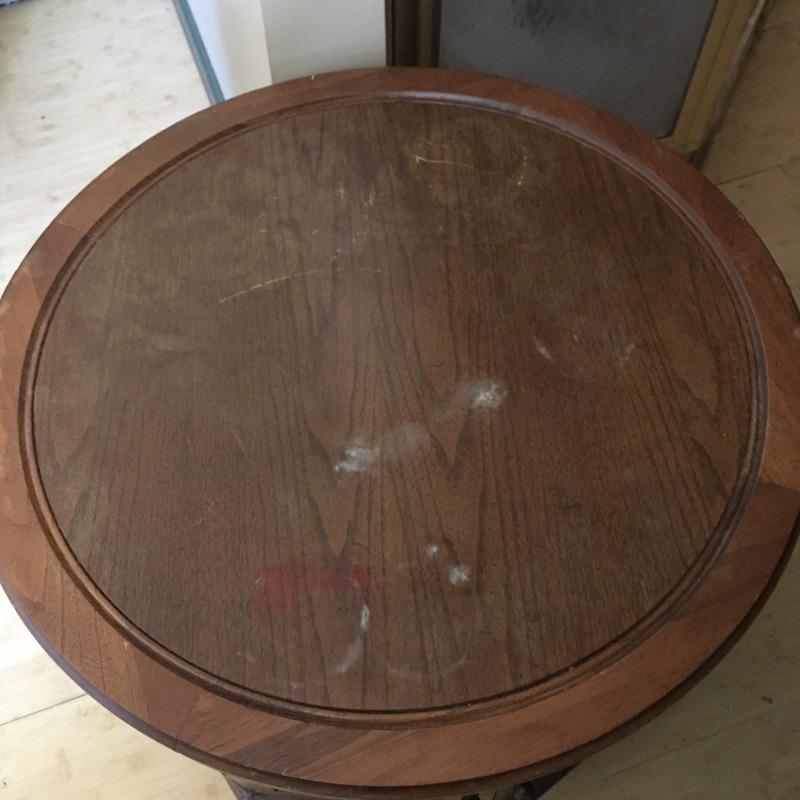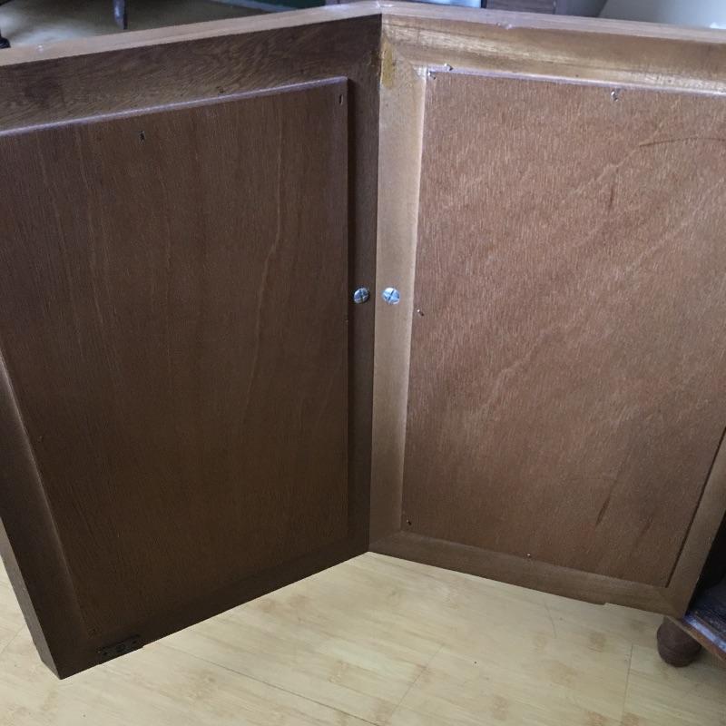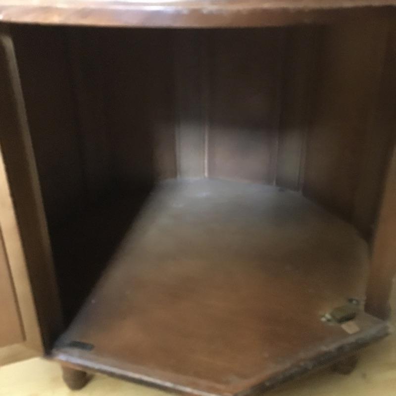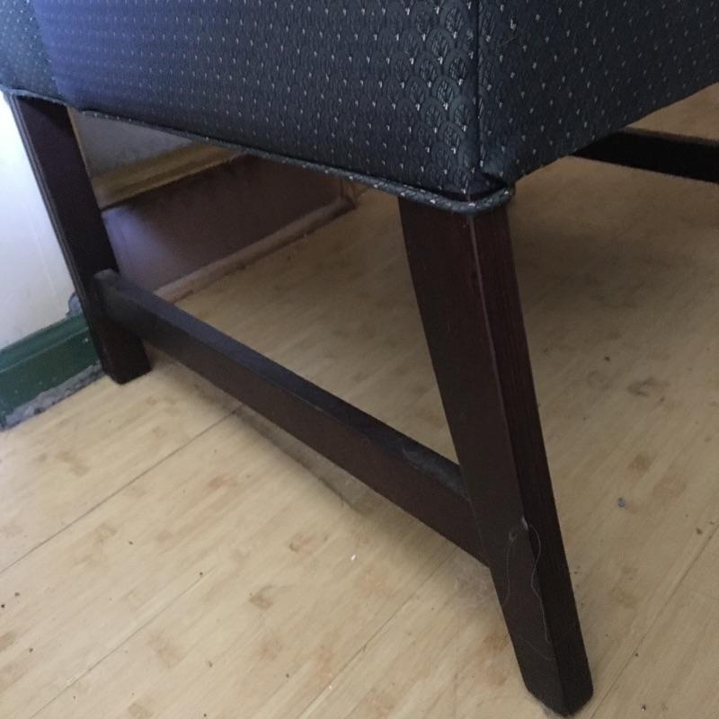 Armchair and side table. Lot includes footed side table with storage cabinet underneath and a armchair. Table is press board and is scratched and marked, chair has pet hair on it but no stains apparent, see pictures. Chair measures 27” x 30” x 35” with a 18.5” seat height.