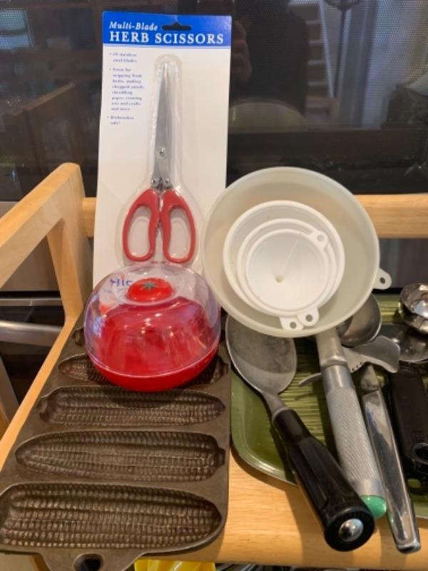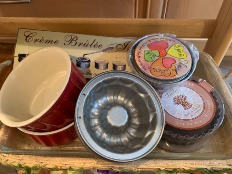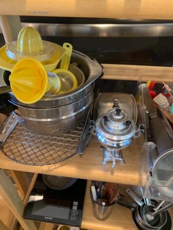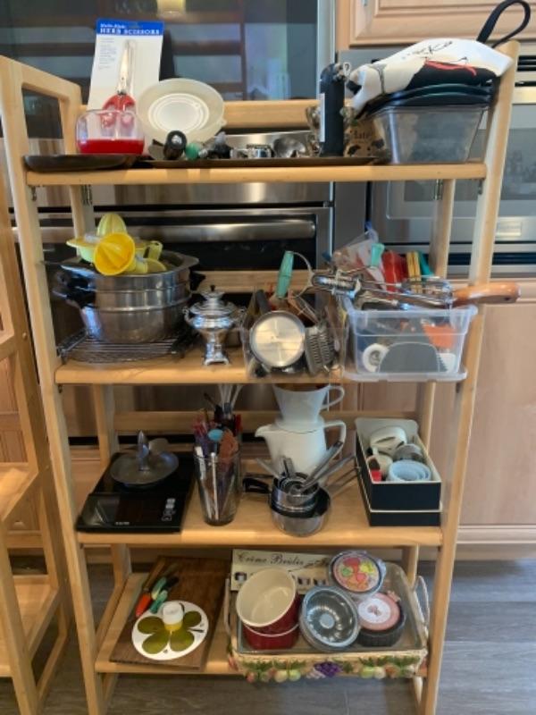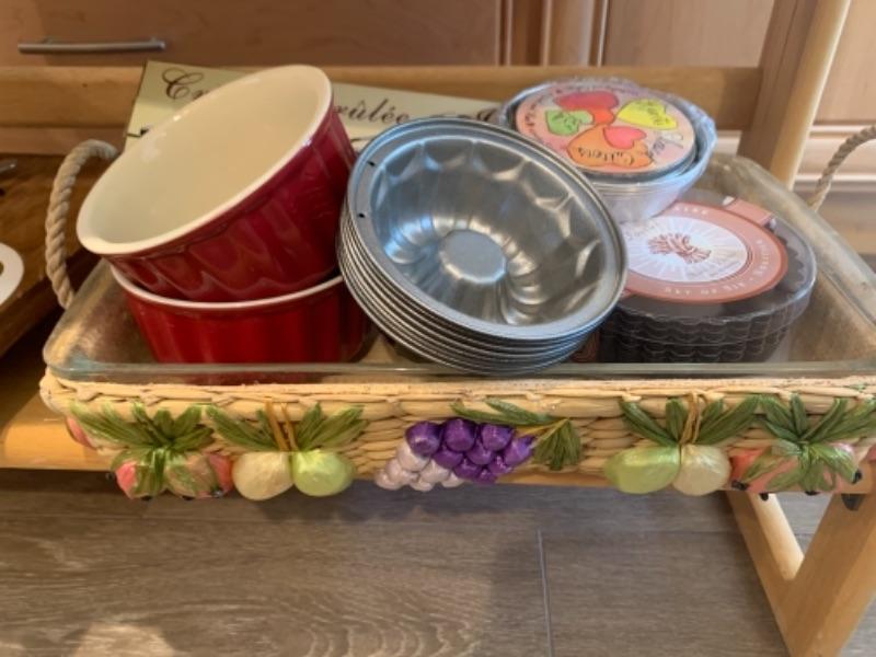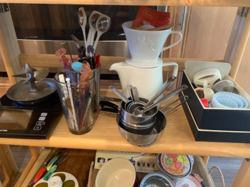 Lot 8. Assorted bakeware (some vintage), slow drip porcelain coffee pot, kitchen scale, cocktail stirrers, etc.--$65