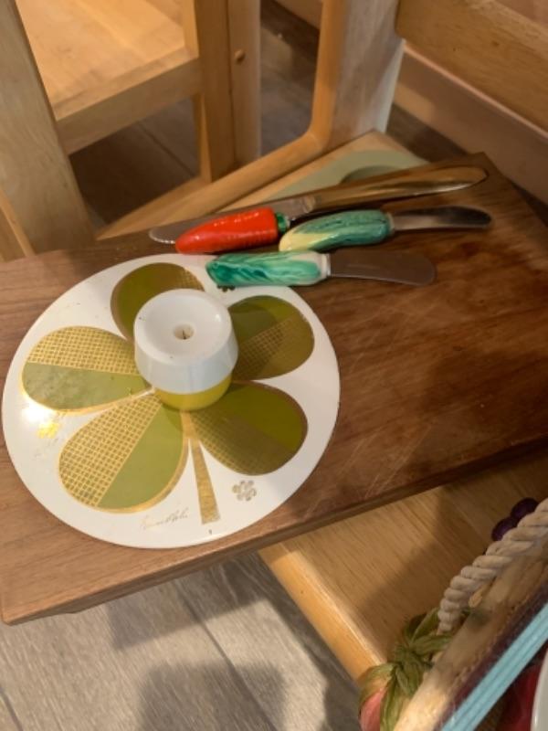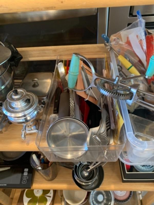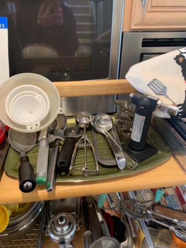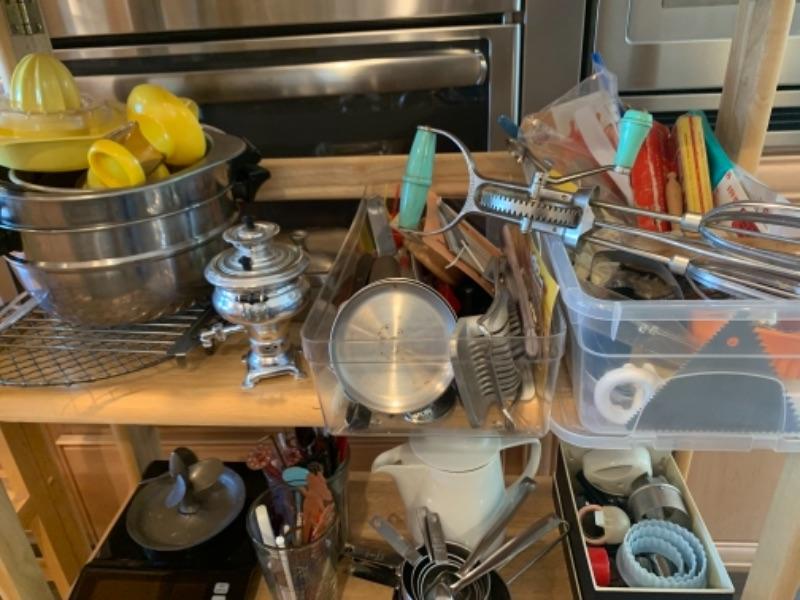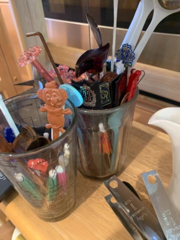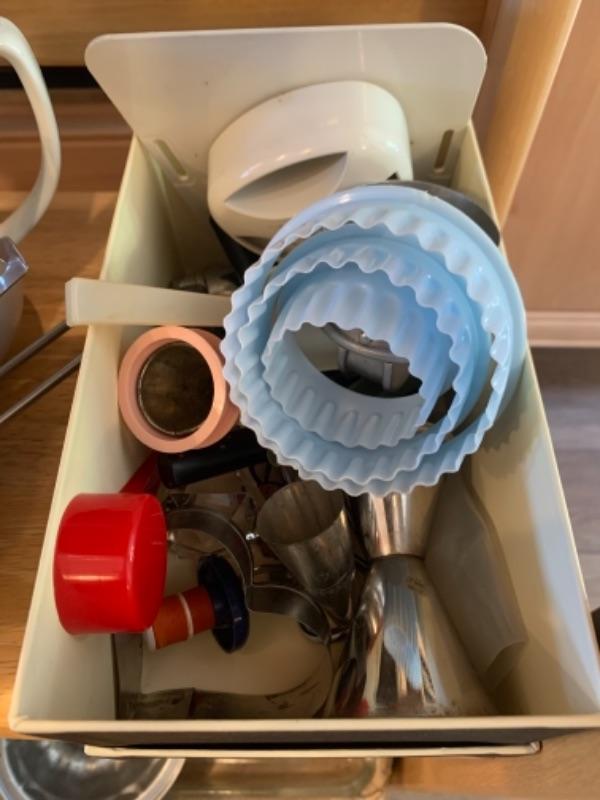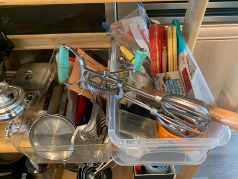 Lot 8. Assorted bakeware (some vintage), slow drip porcelain coffee pot, kitchen scale, cocktail stirrers, etc.--$65