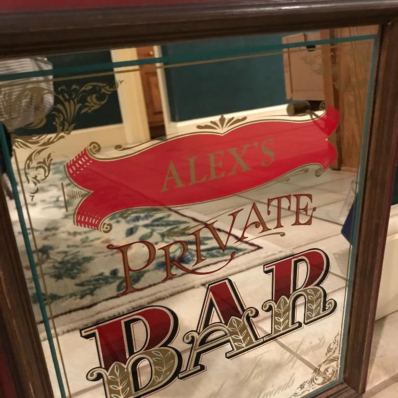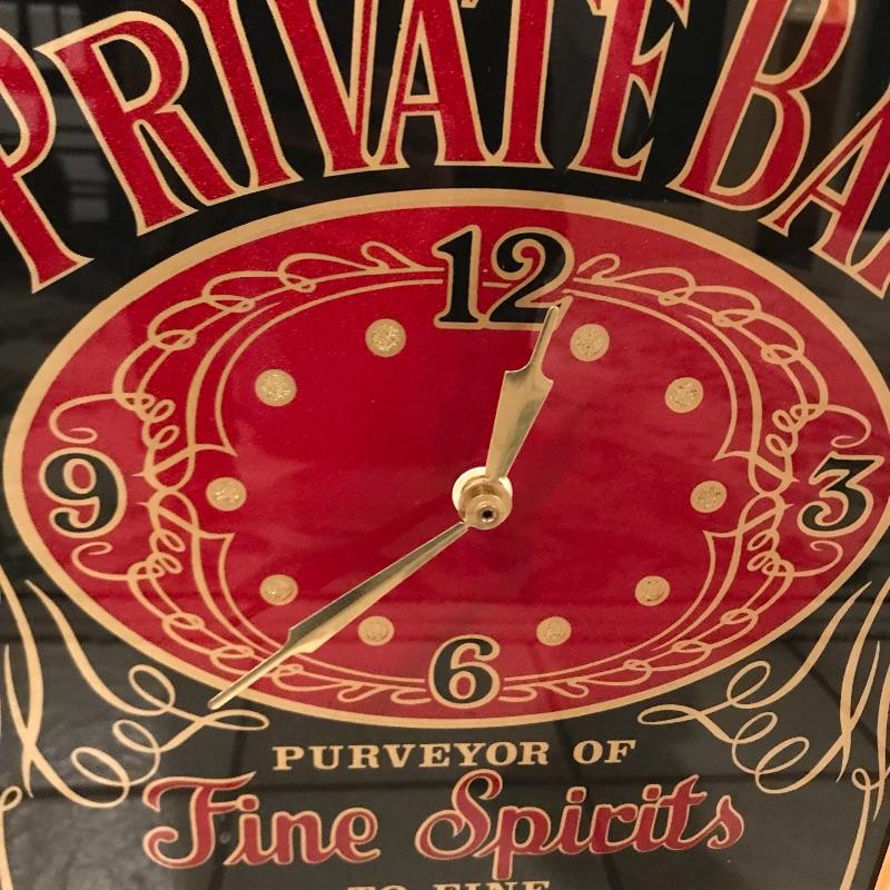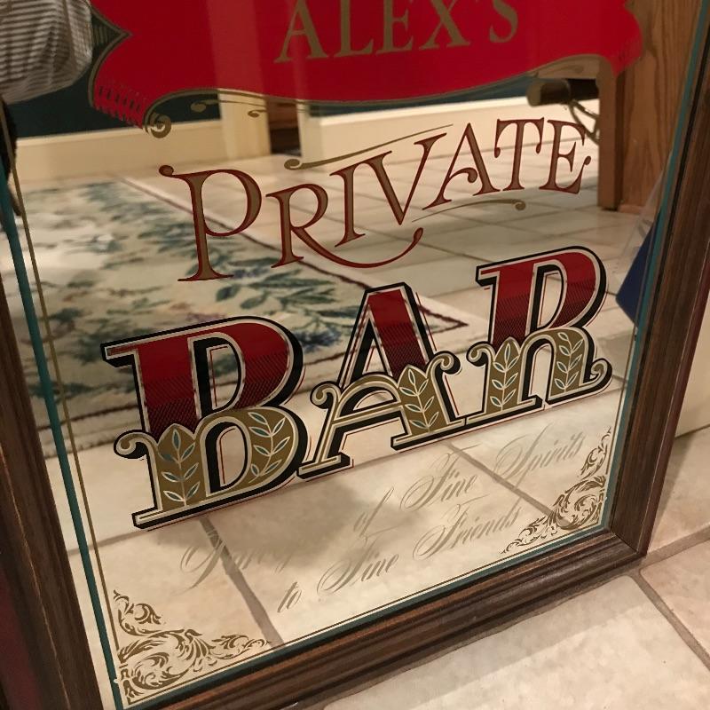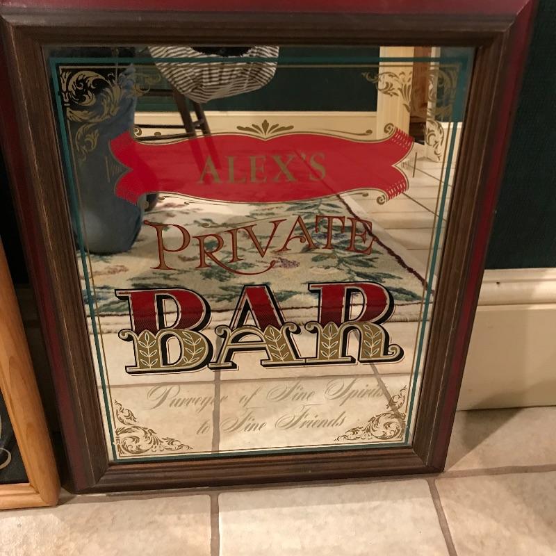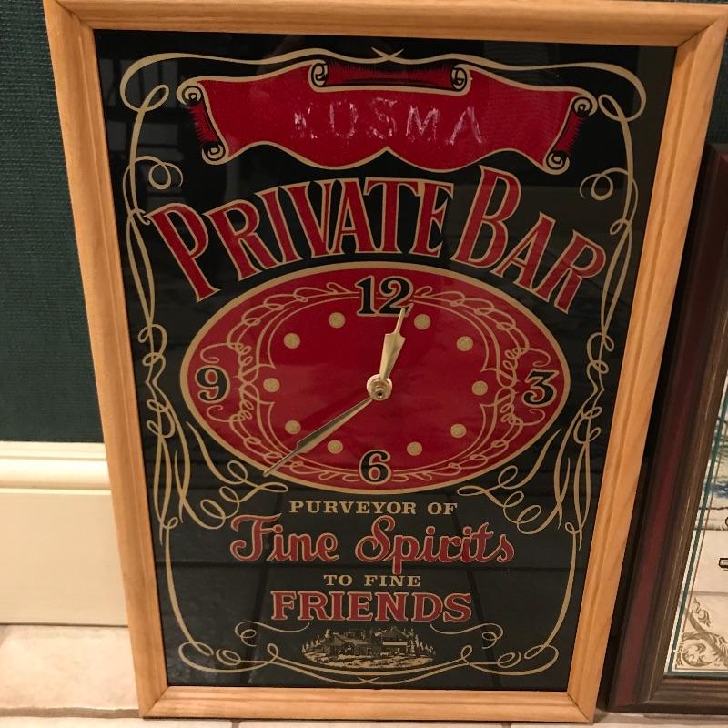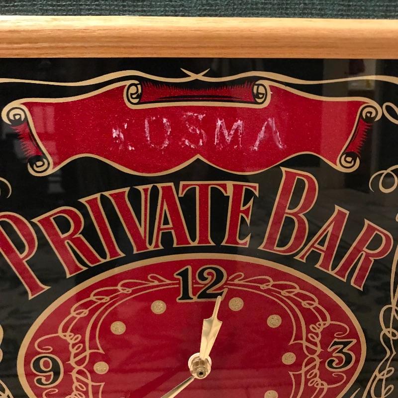 Lot includes two bar signs, one that reads “Alex’s Private Bar - Purveyor of Fine Spirits to Fine Friends,” and a larger one that has a clock and reads. “Kosma - Purveyor of Fine Spirits to Fine Friends.” “Kosma” is faded and could probably be rubbed off. Clock is battery operated and we can not verify if it works. Larger is approx. 19” x 13.5”. Shipping available but can be costly for artwork, so please contact UPS at 828-252-6930 with dimensions for rates prior to bidding.