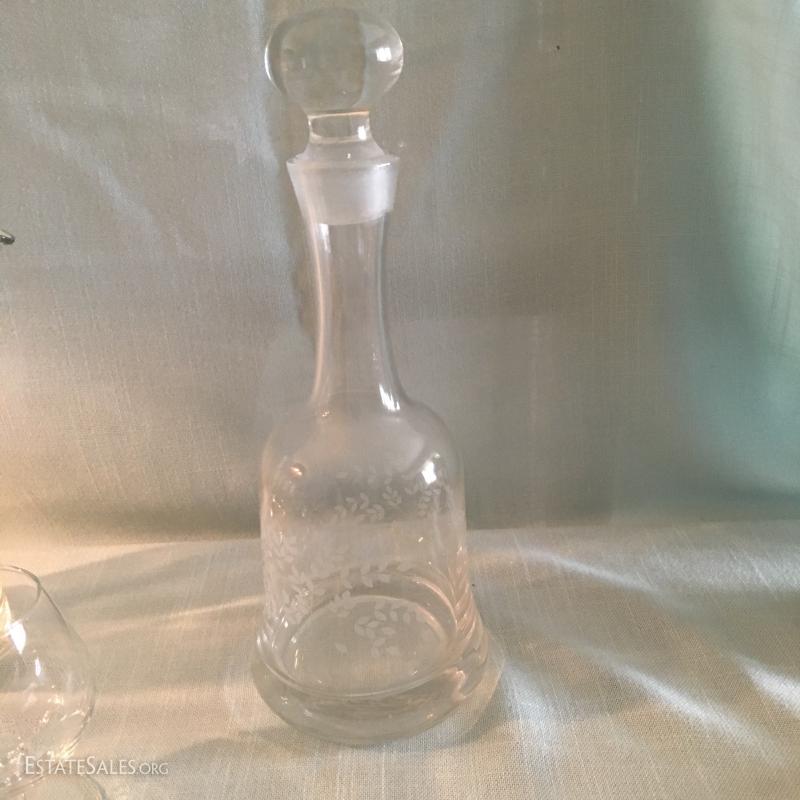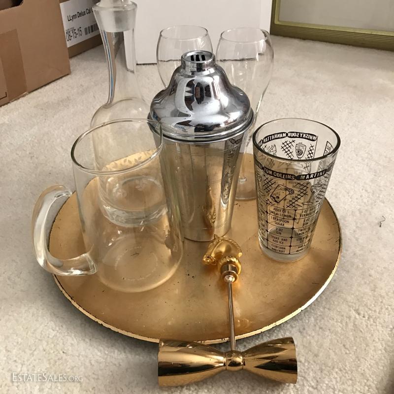 Over 23 pieces of barware including decanter, wine, cordial and champagne glasses, pitchers, shaker, measuring glass, platters and accessories. See photos for details.