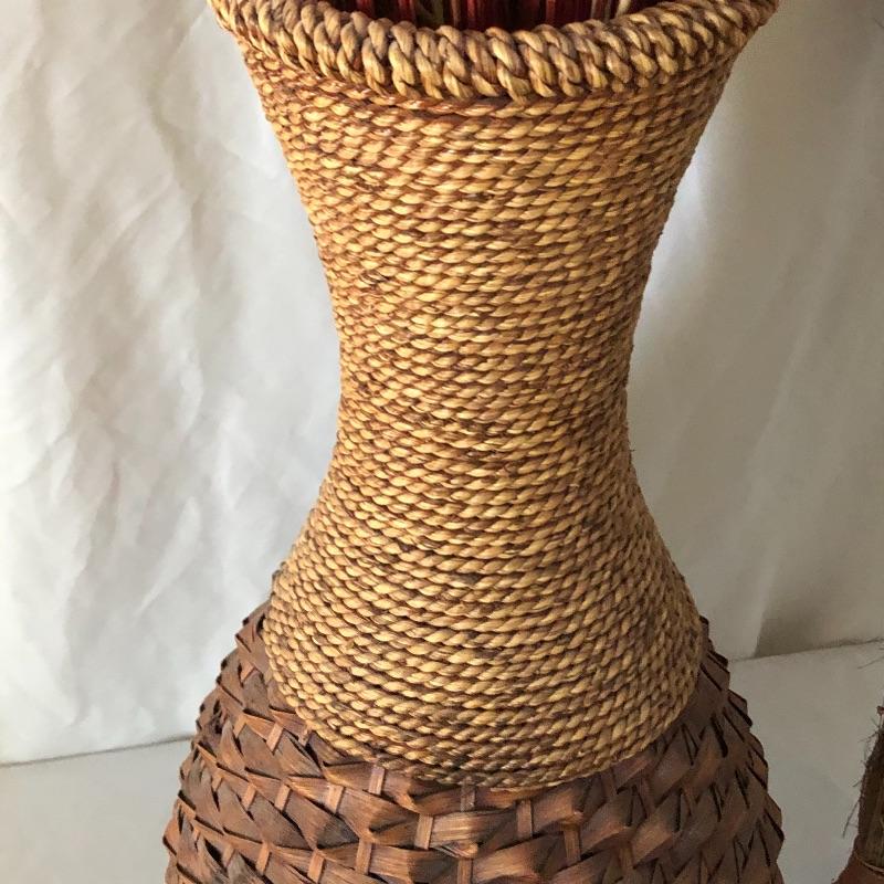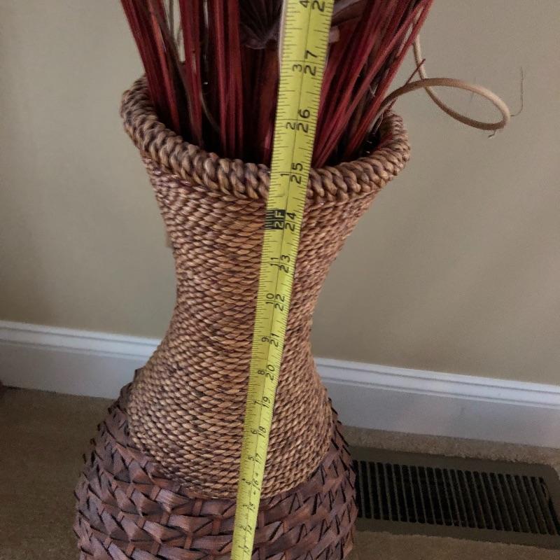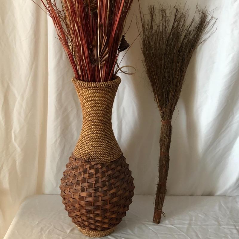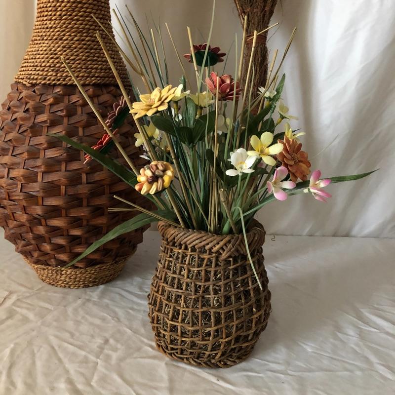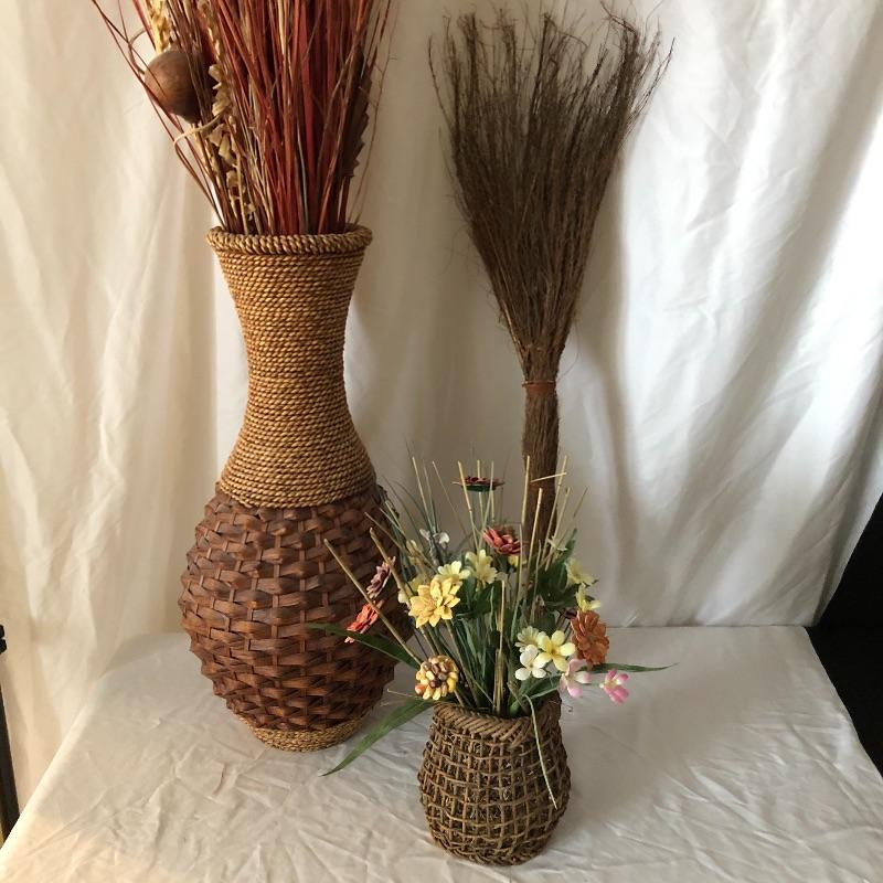 This trio of beauties will look great in any space. The tall basket contains faux reeds and grasses. This basket is worn with rope top and bottom. The smaller basket contains cute flowers made from flower seeds. Also included is an ornamental broom.