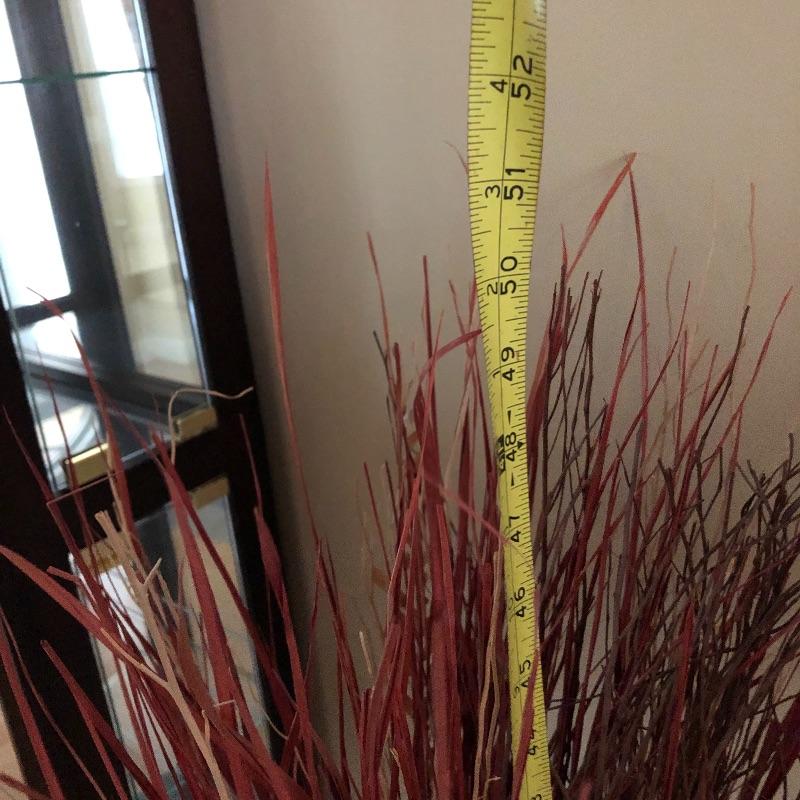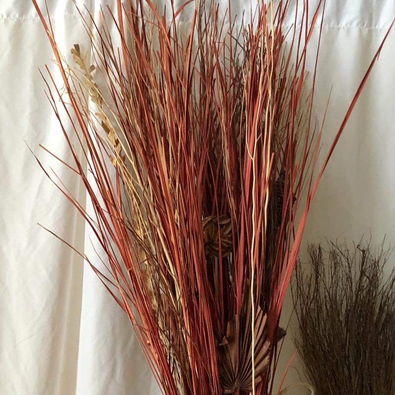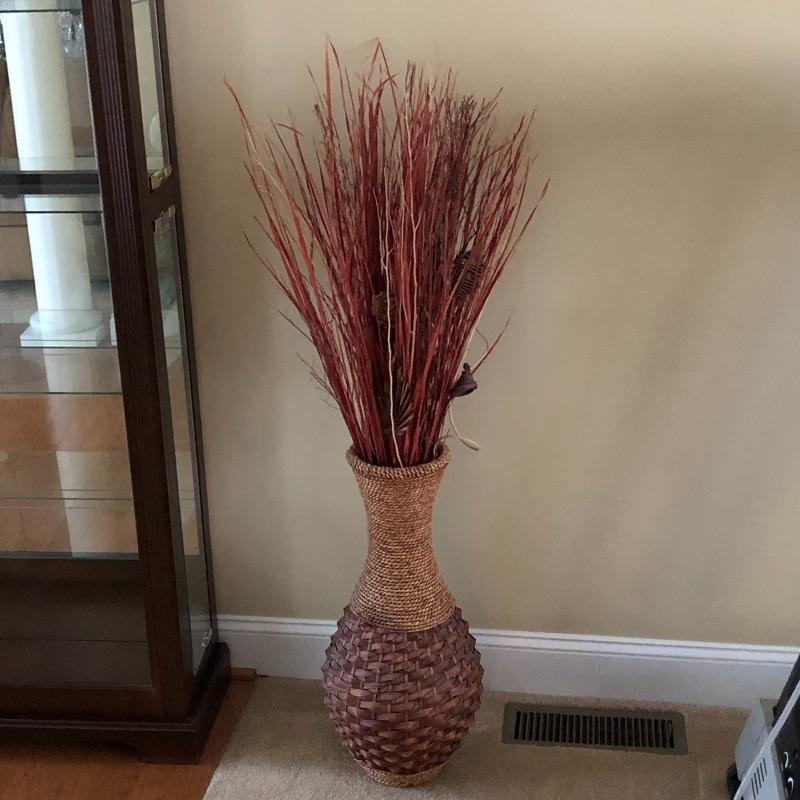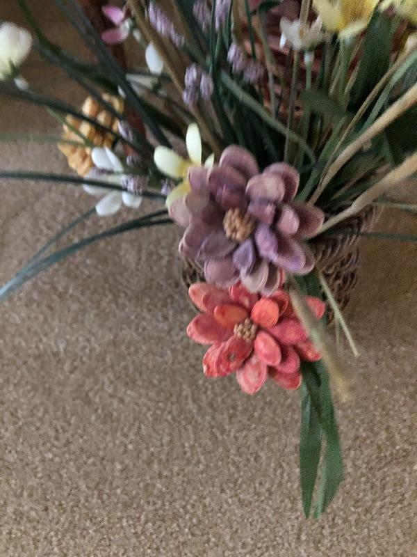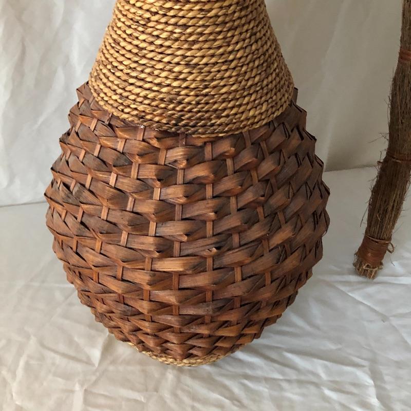 This trio of beauties will look great in any space. The tall basket contains faux reeds and grasses. This basket is worn with rope top and bottom. The smaller basket contains cute flowers made from flower seeds. Also included is an ornamental broom.