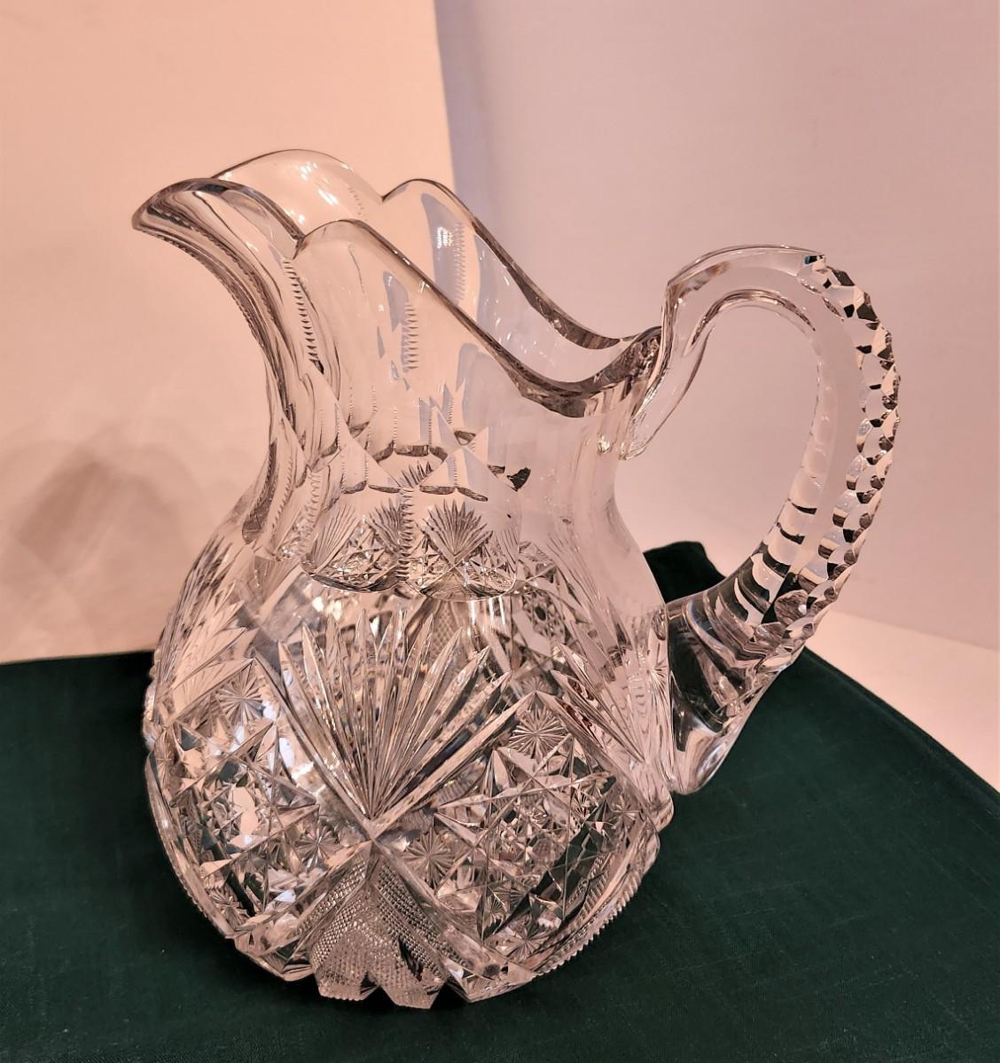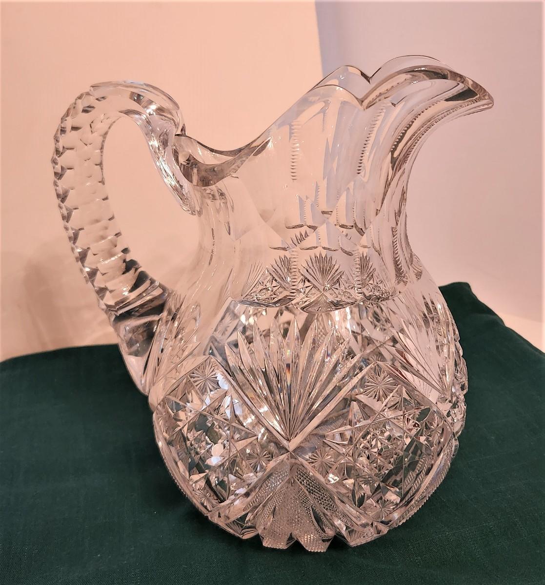 Photo does not do this piece justice - beautiful condition, cabinet kept. American cut/pressed glass pitcher - heavy - 9" tall. More cut glass will be coming up in later lots.