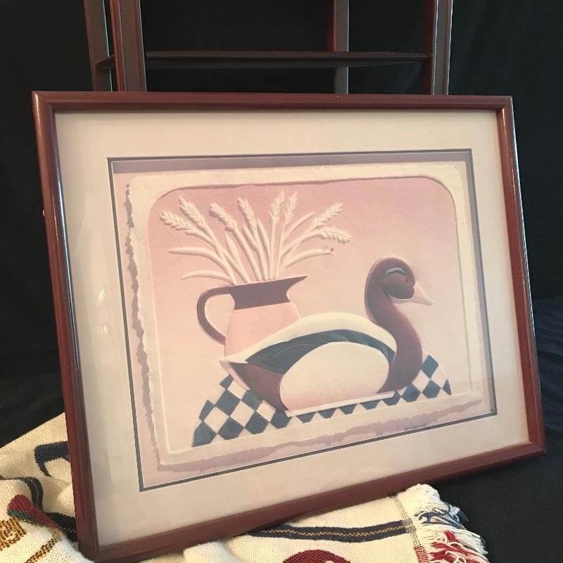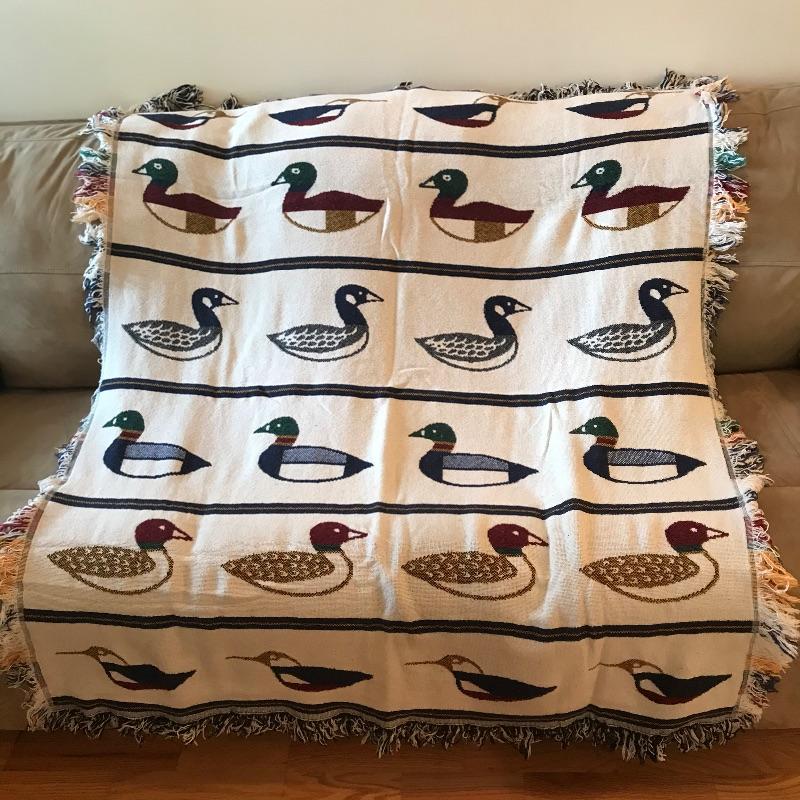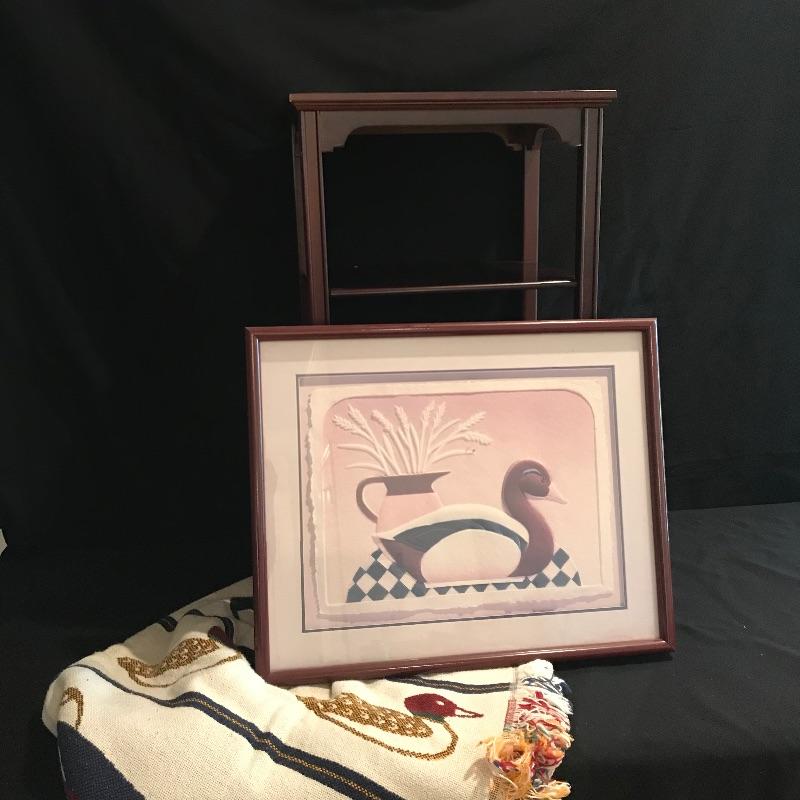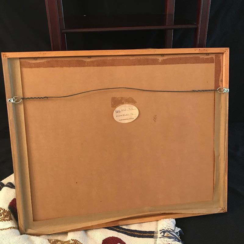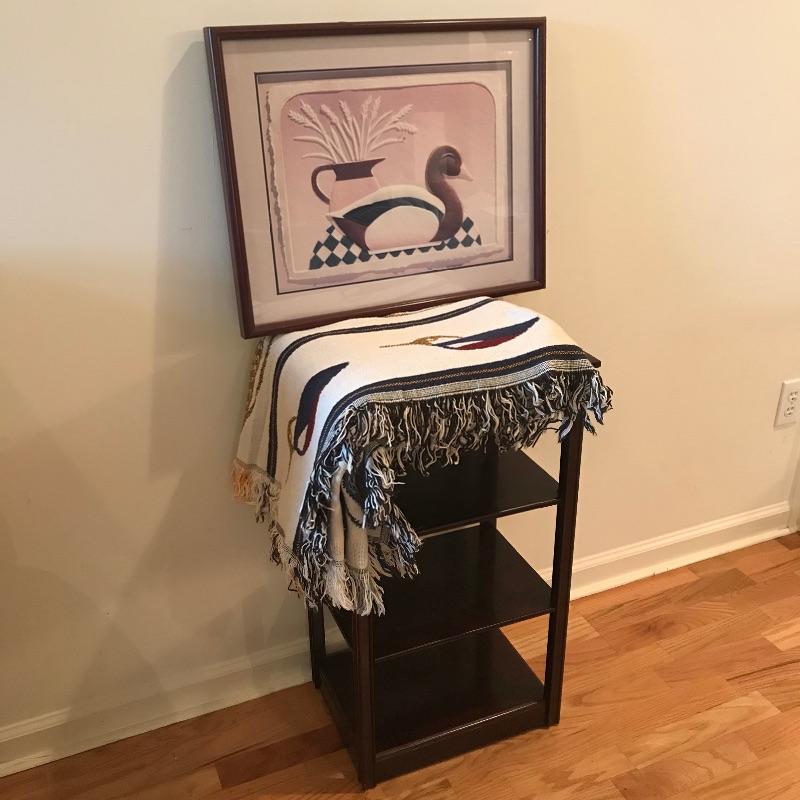 Perfect trio to add a splash of personality and color to your living room. First, another illusion style art print in a wooden frame. The art appears to have multiple layers at a glance. Upon further inspection, art and matting are all one print. The frame is wooden and has a tiny portion warped at the top, again, only noticeable when looking for it. We’ve included a nice 100% cotton couch throw and three tiered wooden table. The table is from the Bombay Company and appears to be solid wood, measuring 15” x 11” x 28.25”. The two shelves are set on dowels and all can be completely removed if you prefer. See photos. Local pick up only.