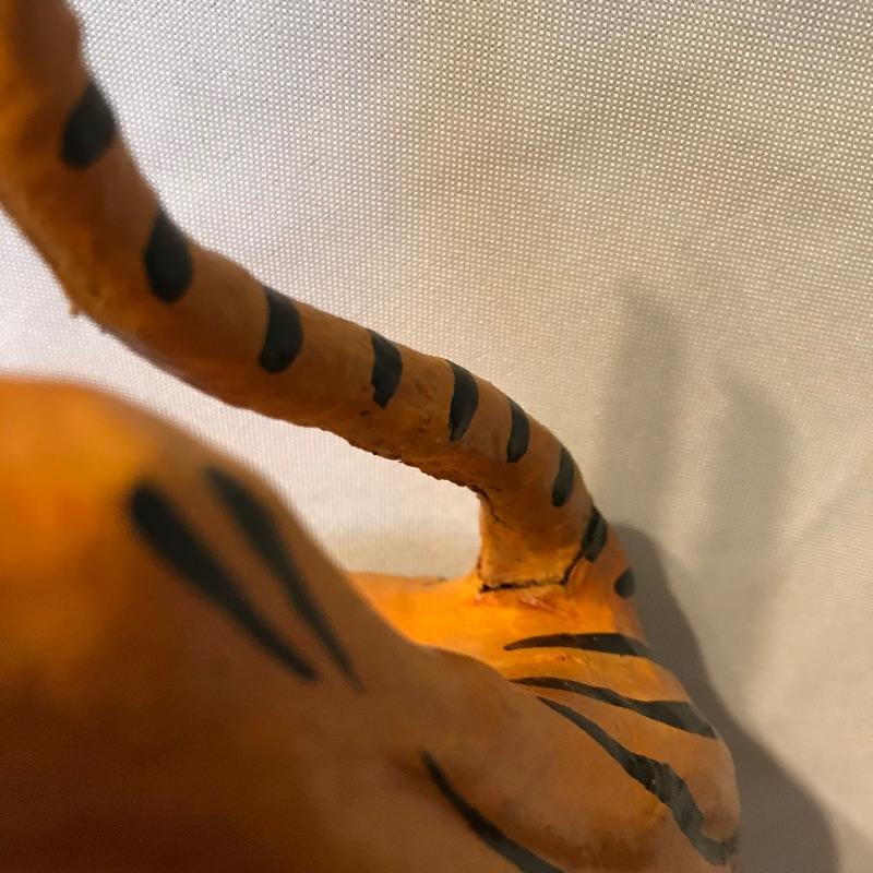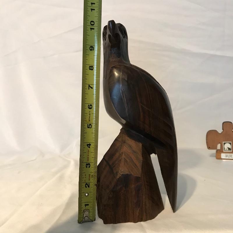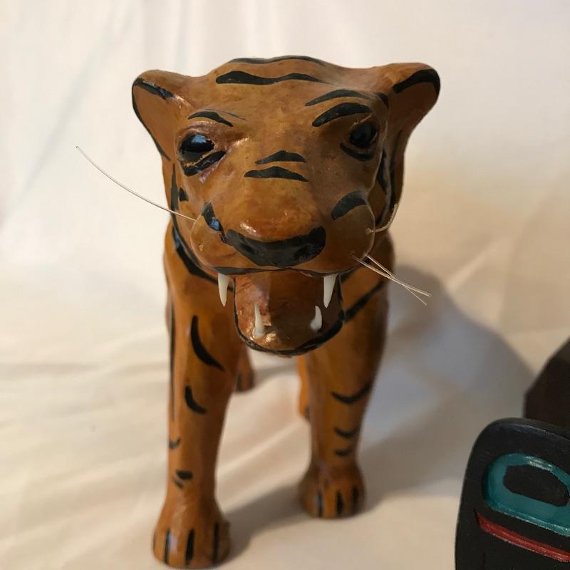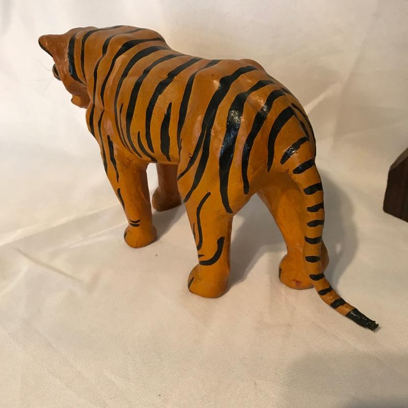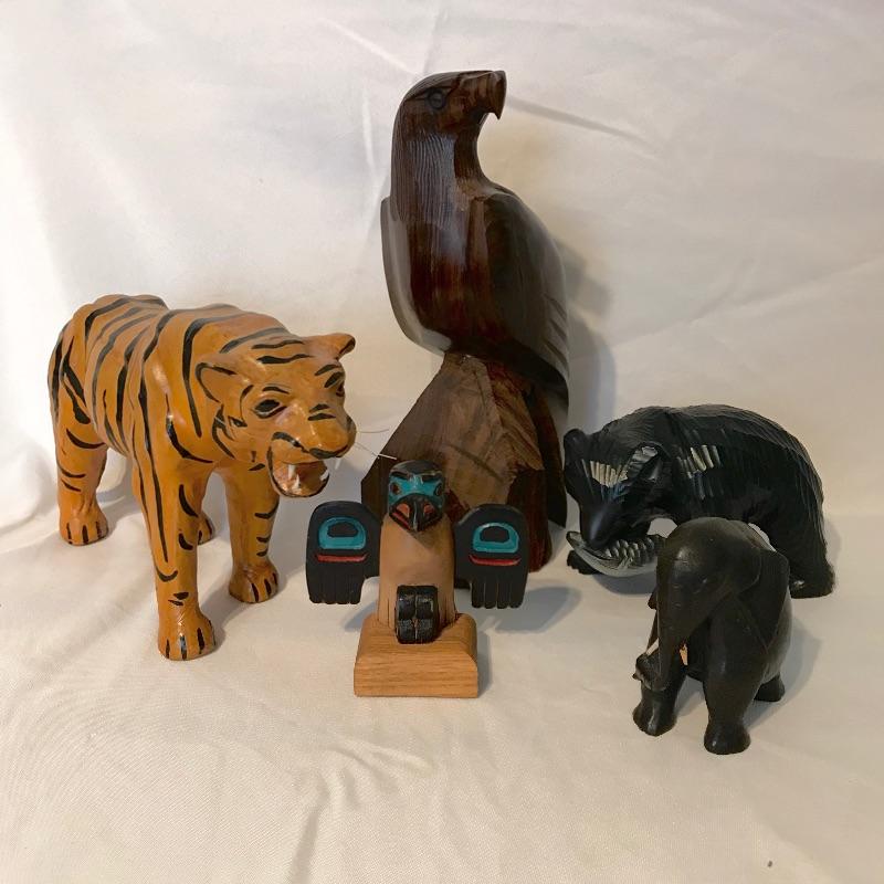 Outstanding collection of carved creatures. All statuettes are painted with the exception of the hawk that has a heavy wooden stance and smooth dark stain. Two have stickers stating place of origin. The hawk is a heavy wooden material and the tiger is a painted paper mache like material but sturdier. The rest appear to be made with a sturdy middleweight wood. The tiger has a small crack in the base of the tail, but it does not affect the tail’s integrity. See 2nd to last image. Shipping available.