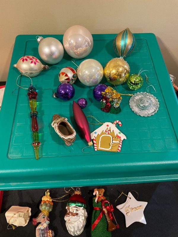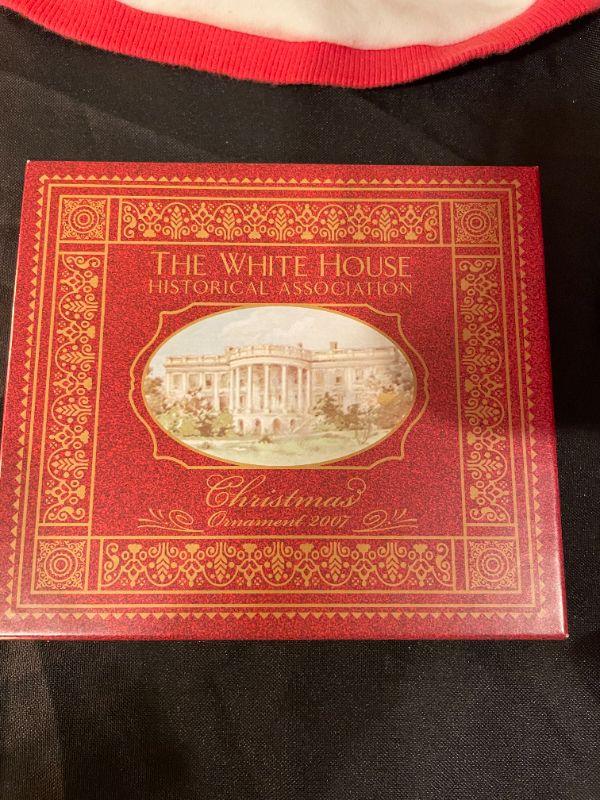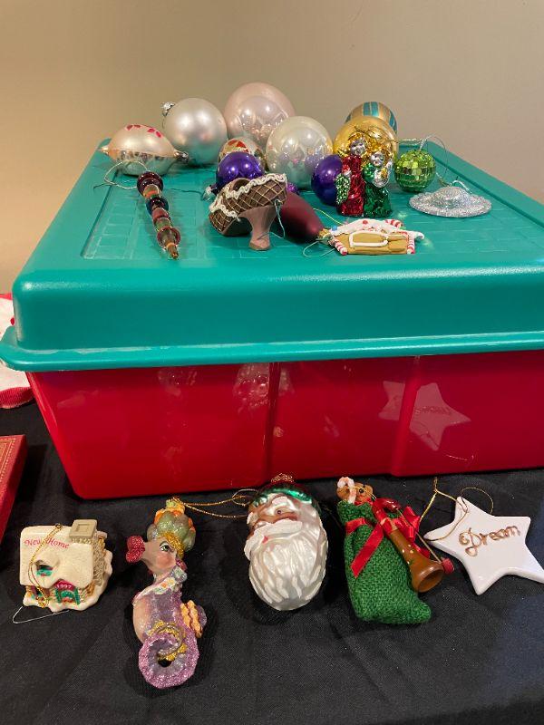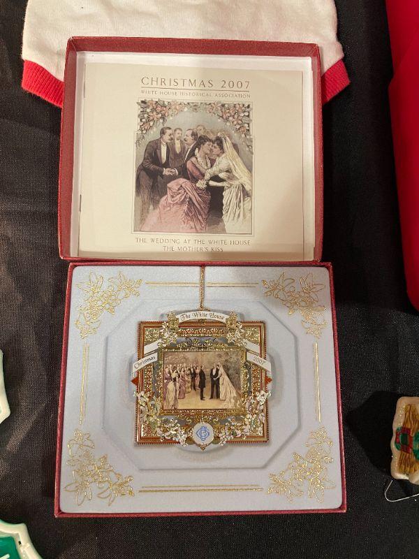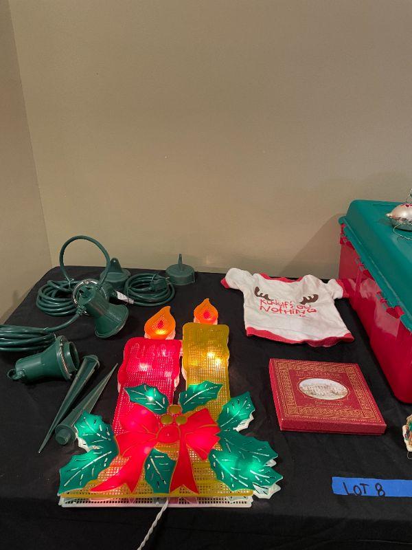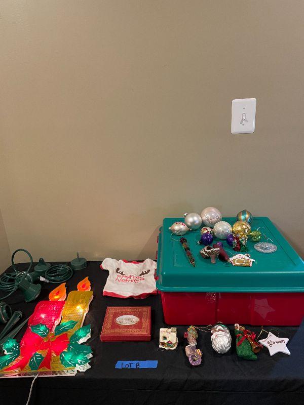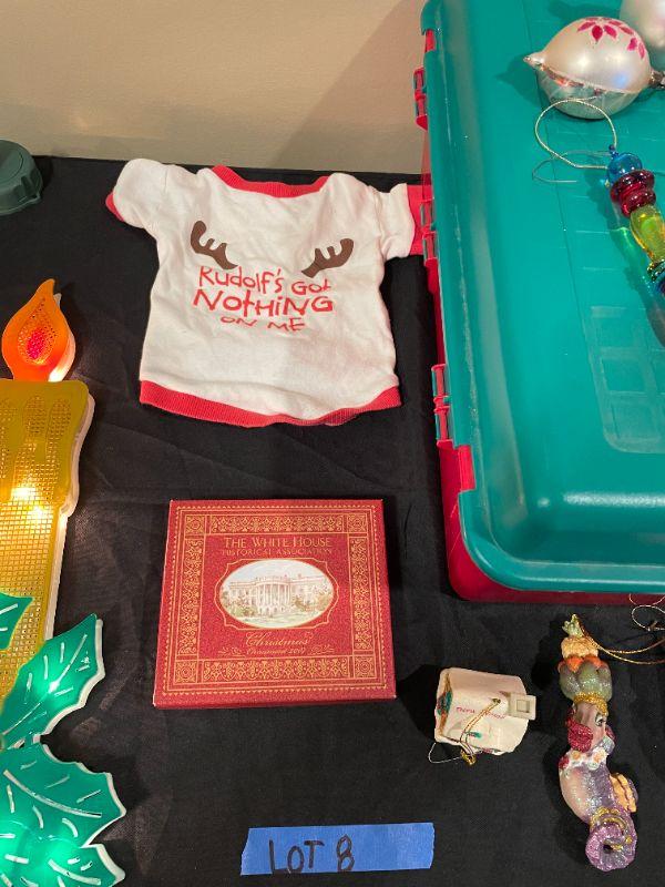 Lighted Hanging Candle, 2007 White House Ornament in Box, Assorted Ornaments including a Vintage Santa, Seahorse w/Lips, Angels, Outdoor Holiday Lighting and a Decorative Storage Box.