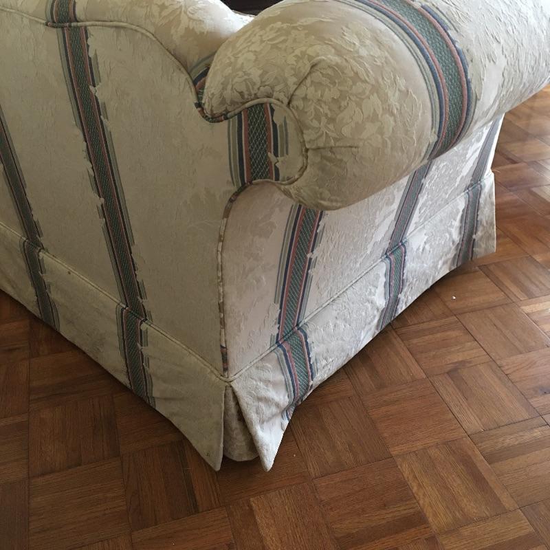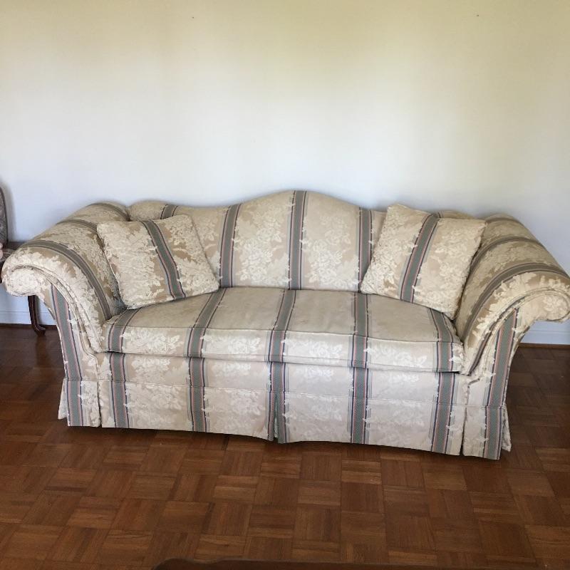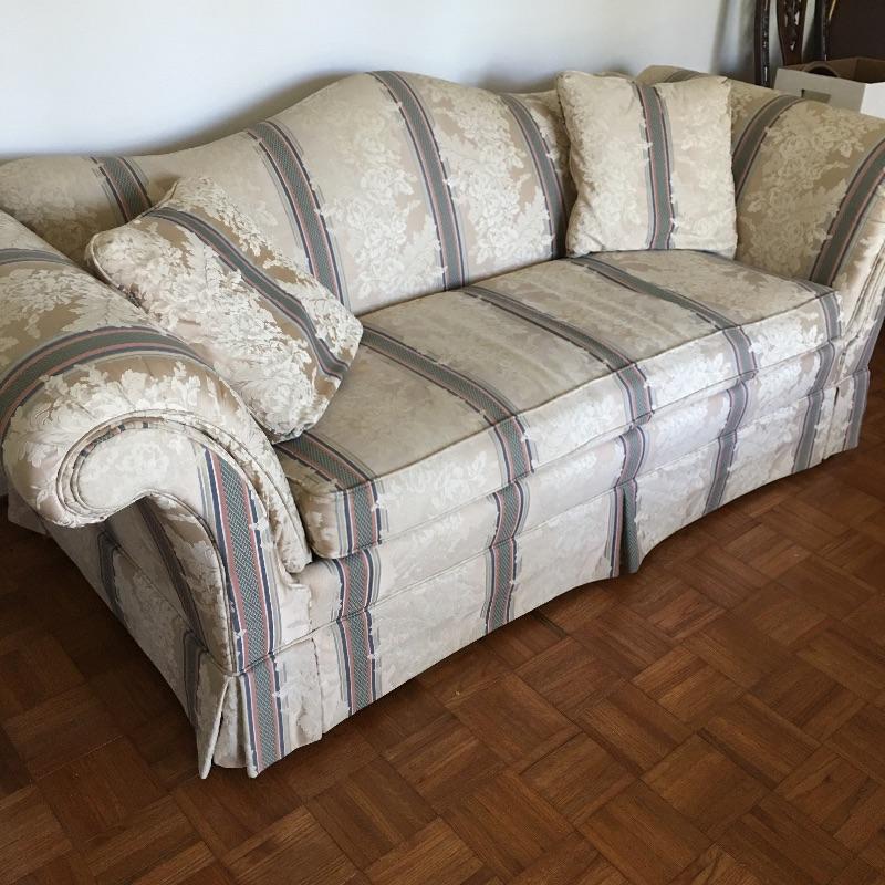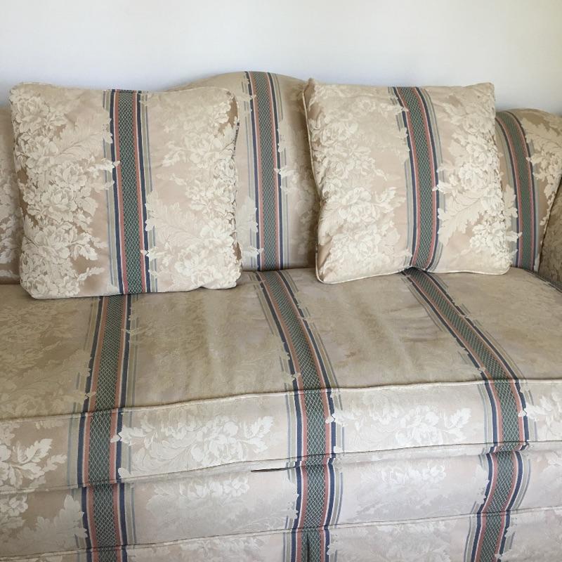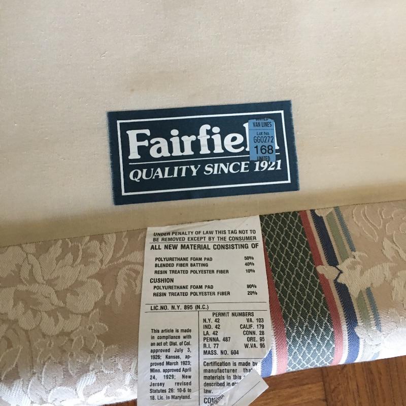 Fairfield couch with rolled arms and two matching throw pillows. Sit back and relax in this stylish and comfortable couch. Couch has a small defect on cushion and has foam around leg for transport and a cloth underside, see pictures.