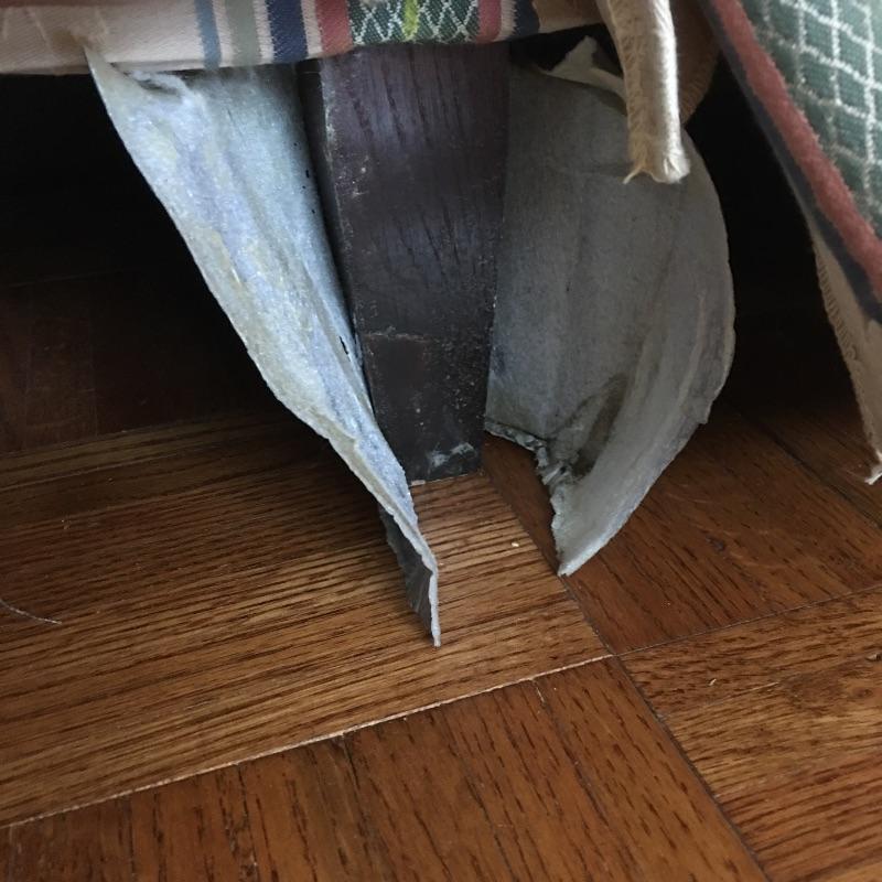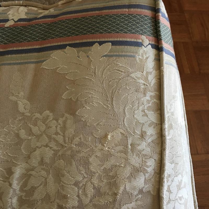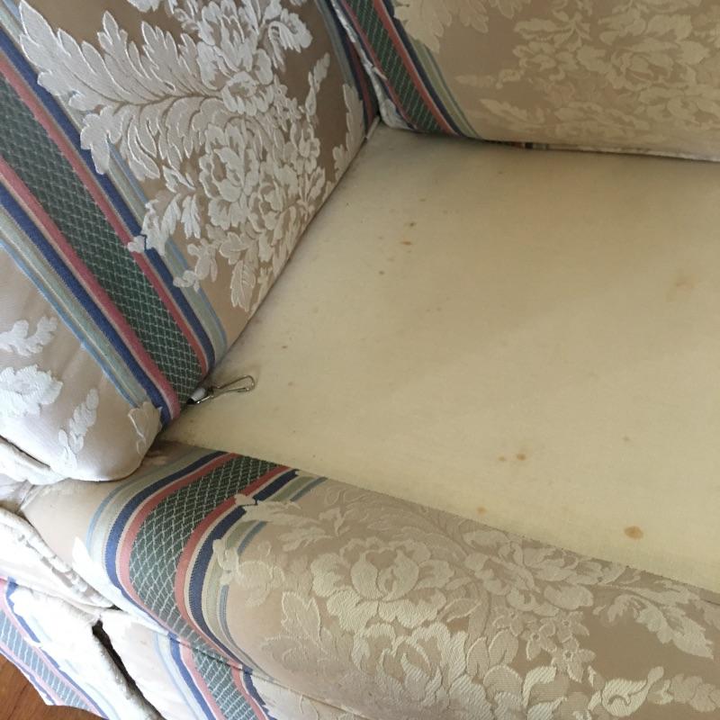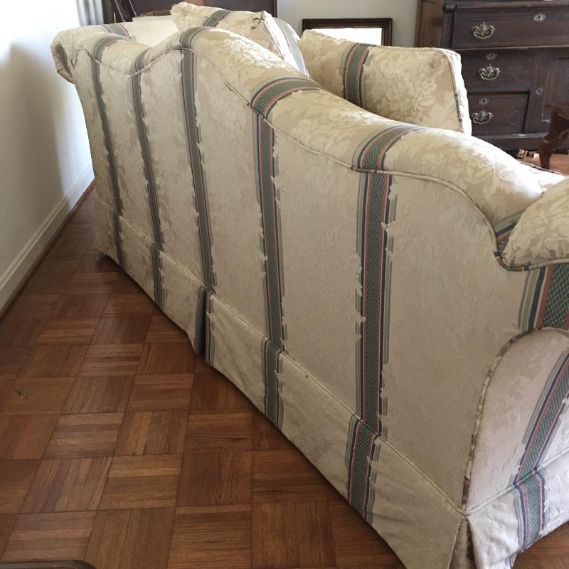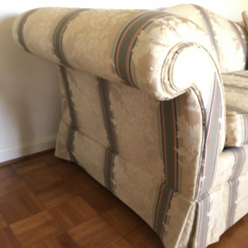 Fairfield couch with rolled arms and two matching throw pillows. Sit back and relax in this stylish and comfortable couch. Couch has a small defect on cushion and has foam around leg for transport and a cloth underside, see pictures.