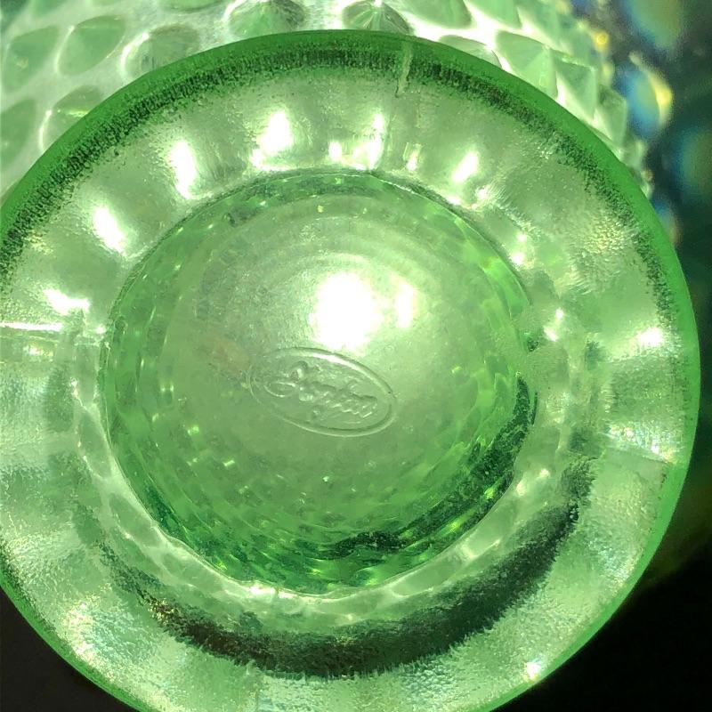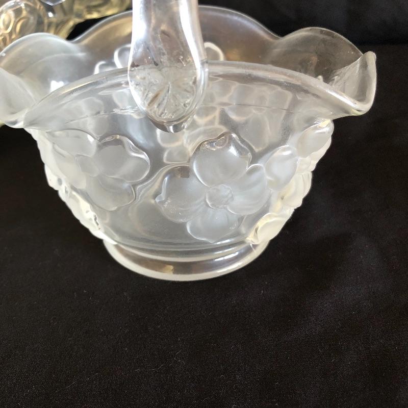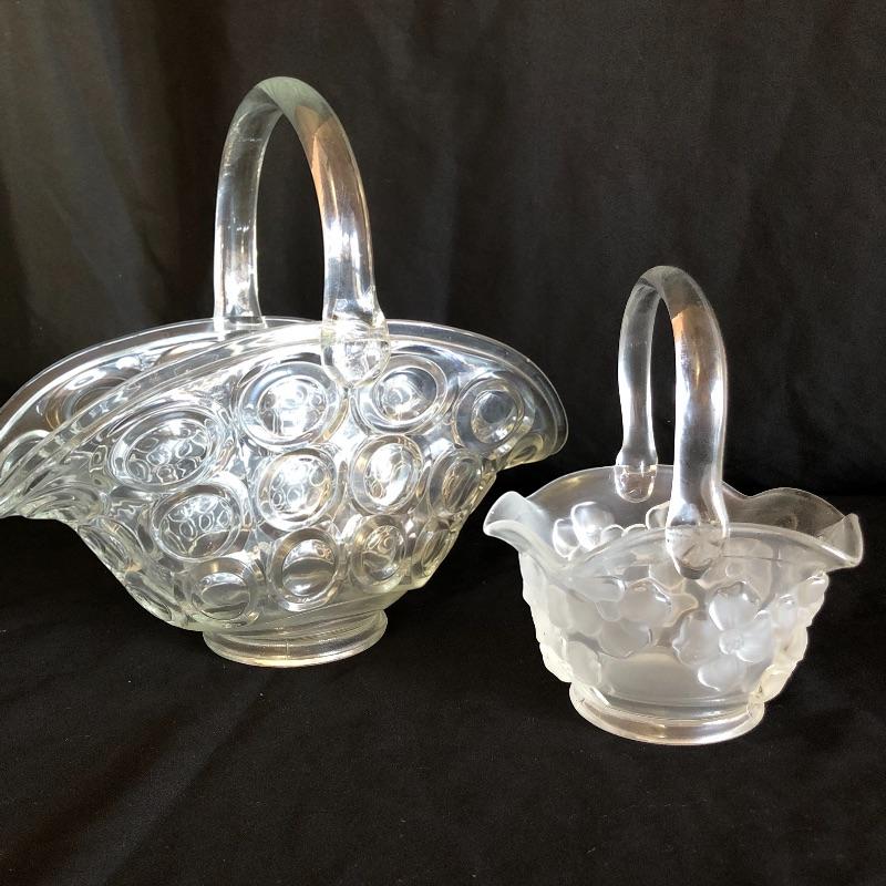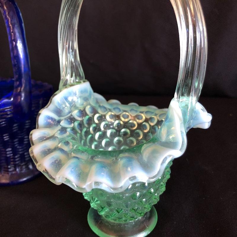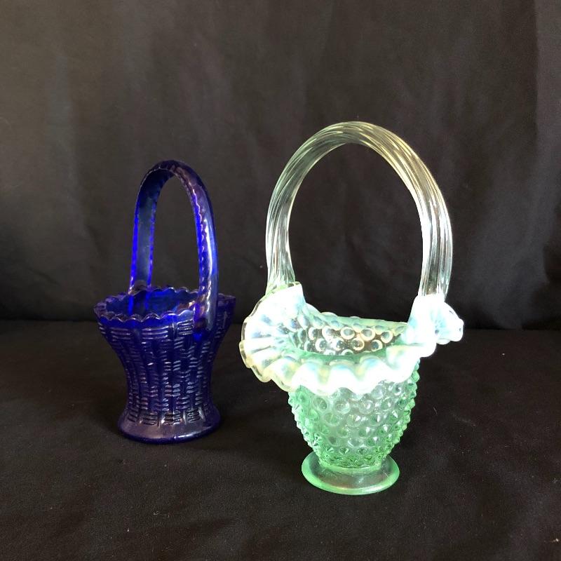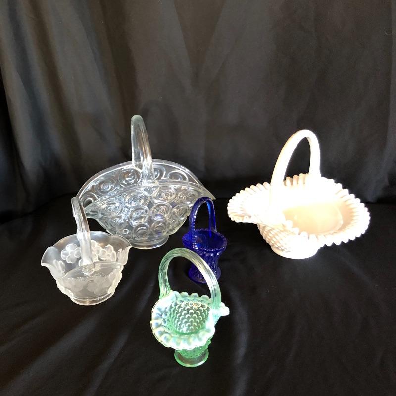 This pair of Fenton baskets includes one milk glasses one green glass basket both marked Fenton on bottom. Lot also includes two clear glass baskets and a blue glass basket. Milk glass basket measures 8” x 10” x 9.5”.