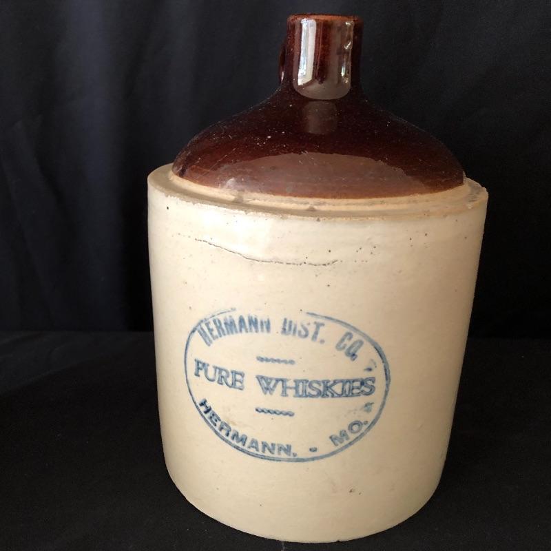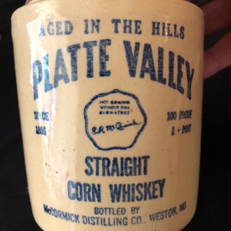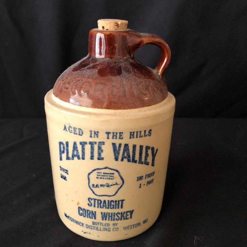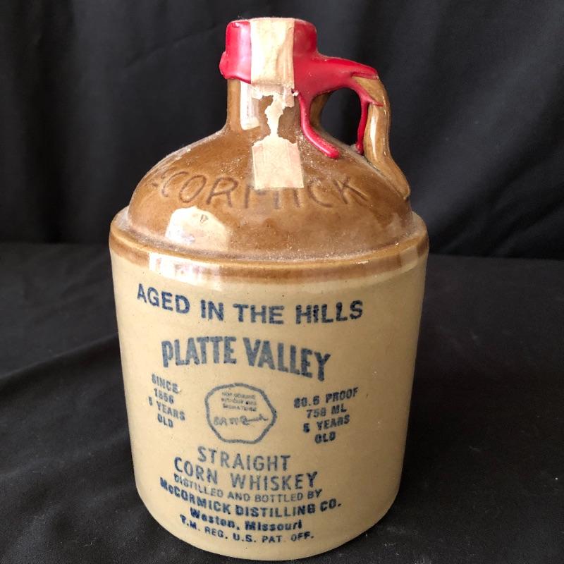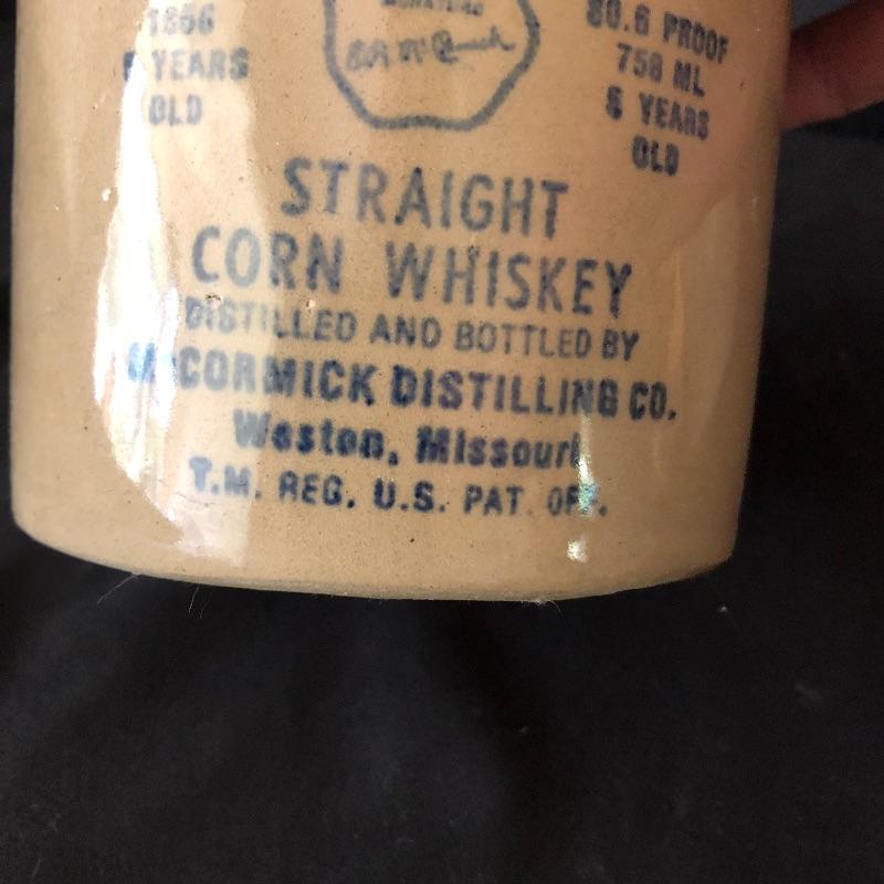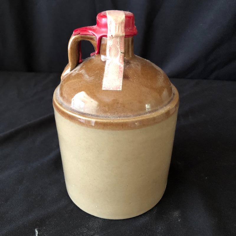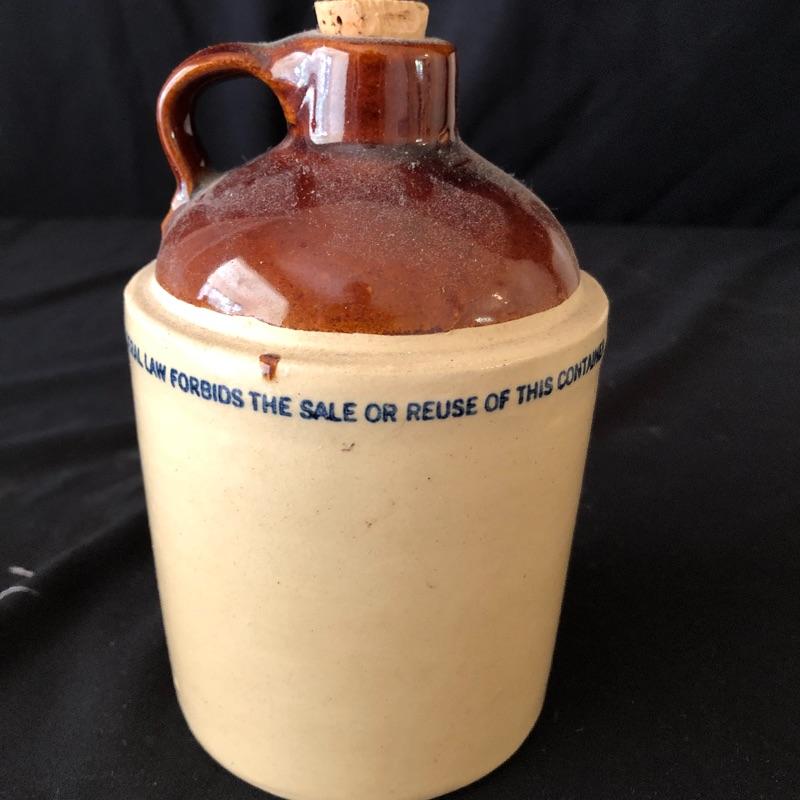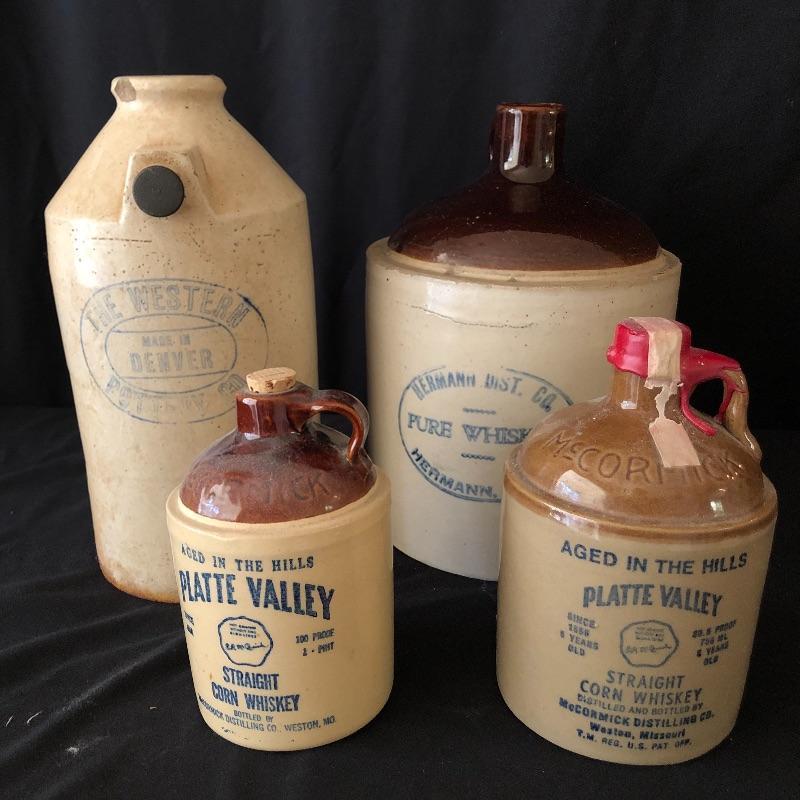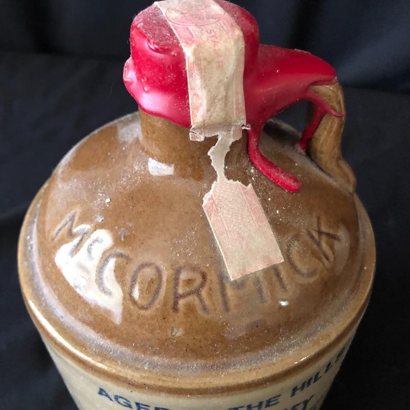 A nice assortment of vintage stoneware whisky jugs here. The largest jug measures 11” tall. The two smaller jugs are still cork sealed; the McCormick jug has unidentified liquid in it.
