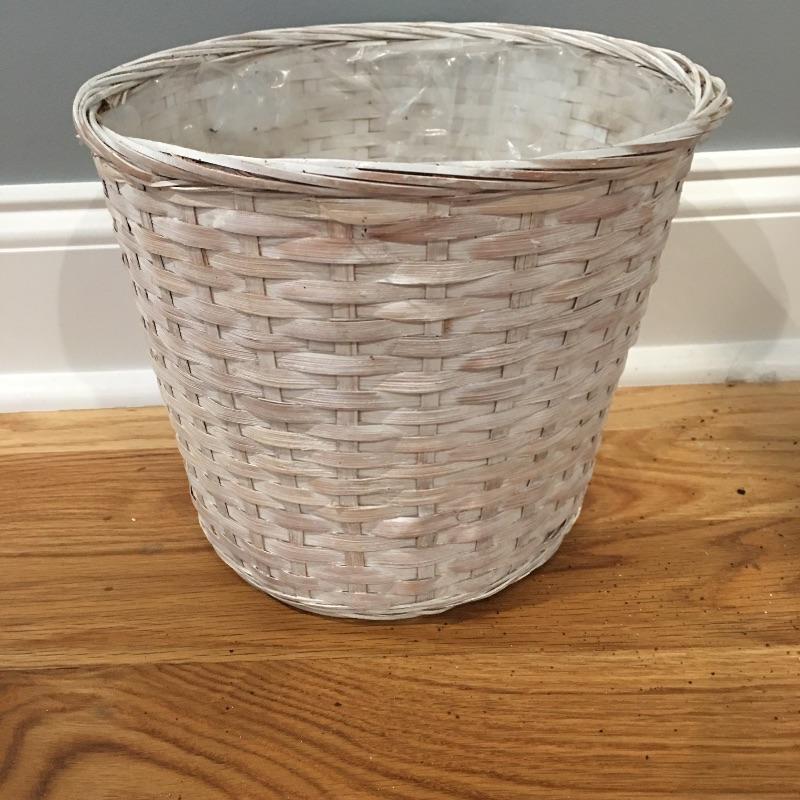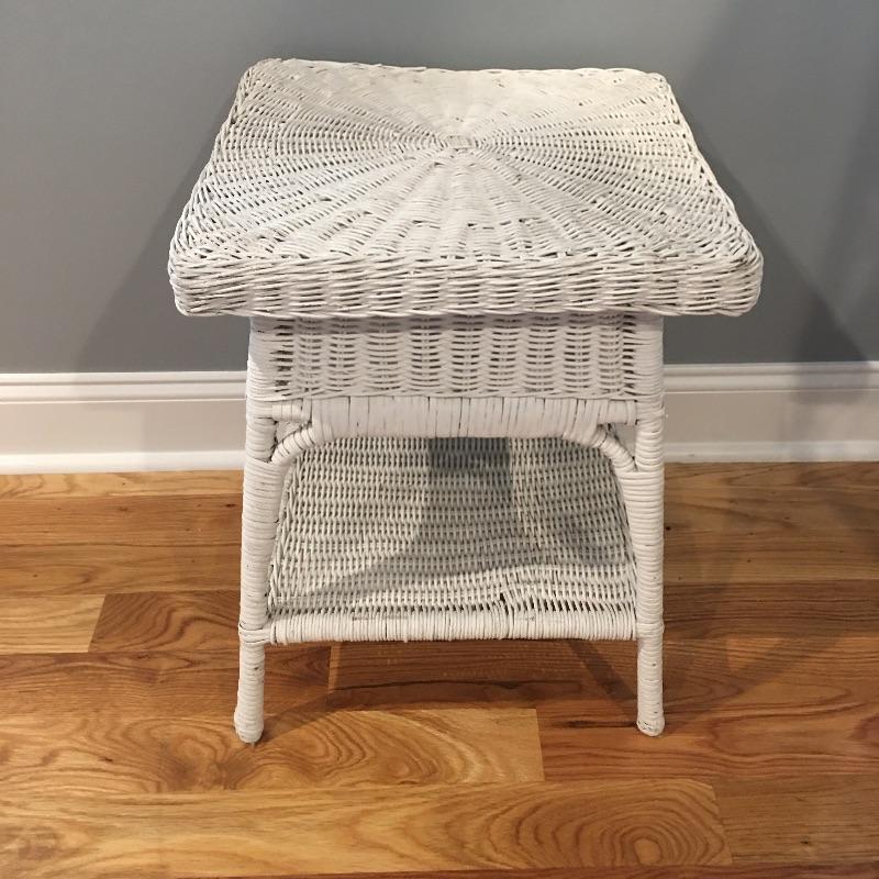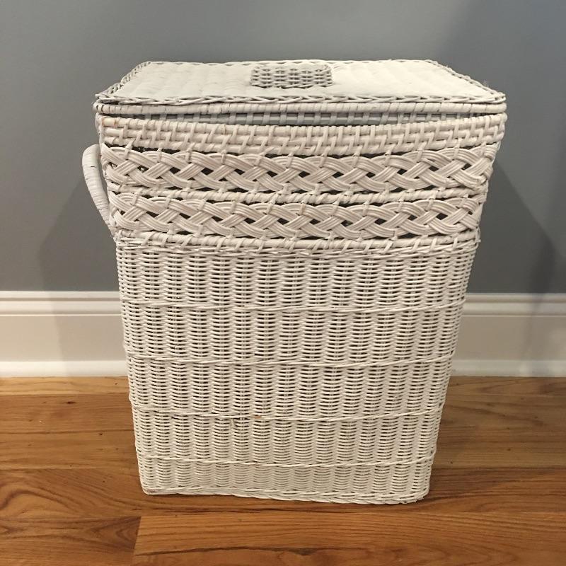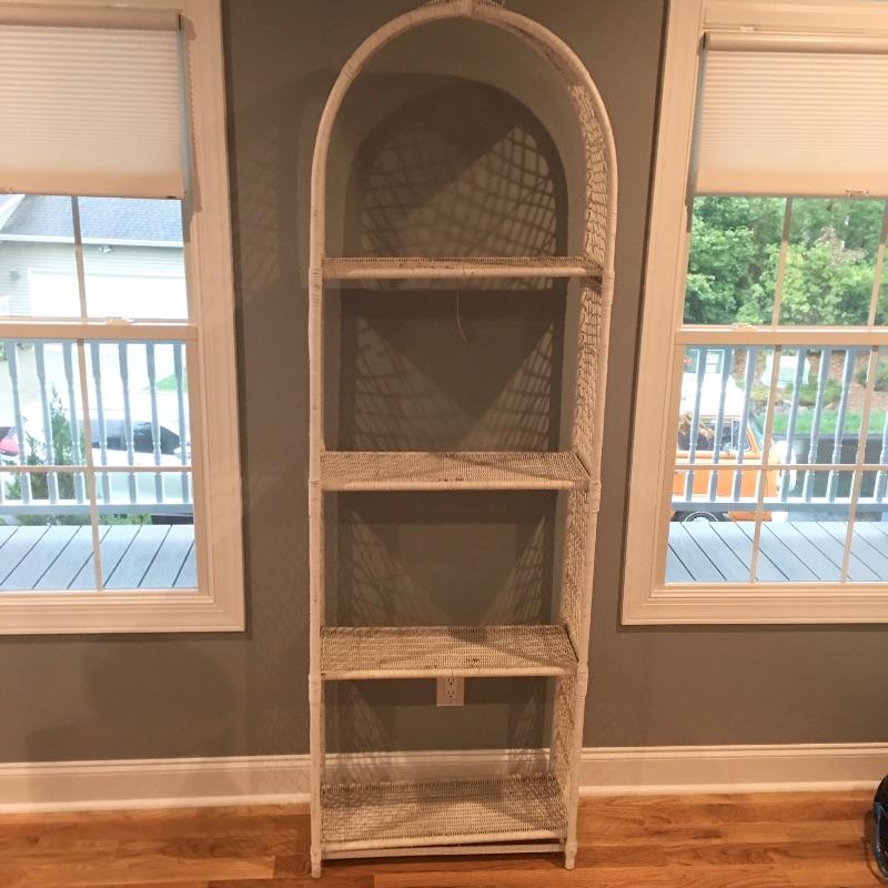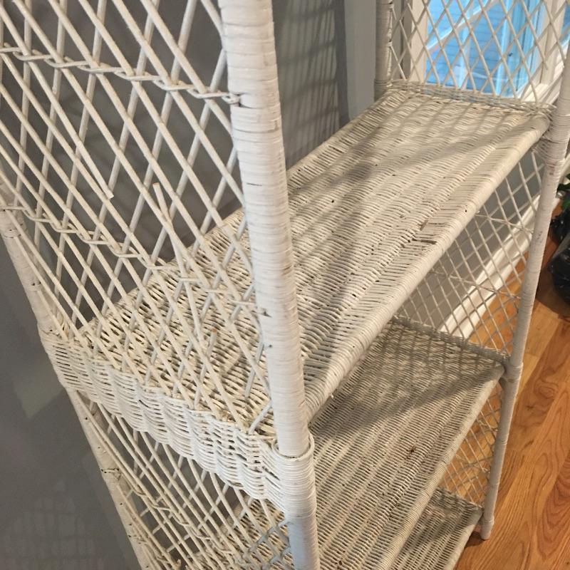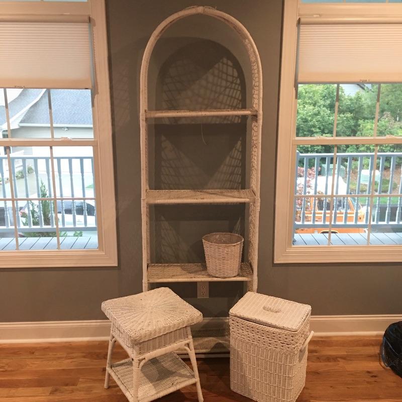 Four wicker pieces include a hamper, side table, wastebasket and four shelf unit. Give your house that beach feel with these white wicker pieces.