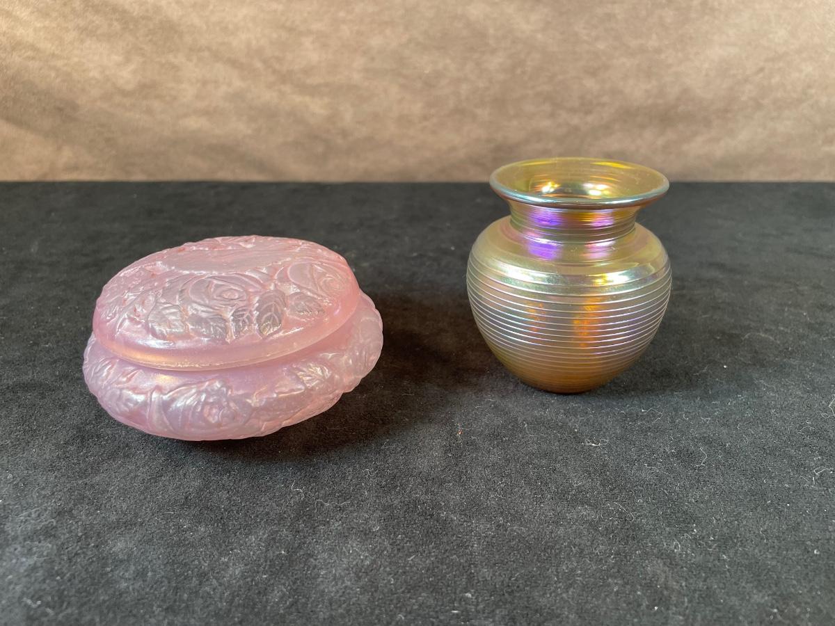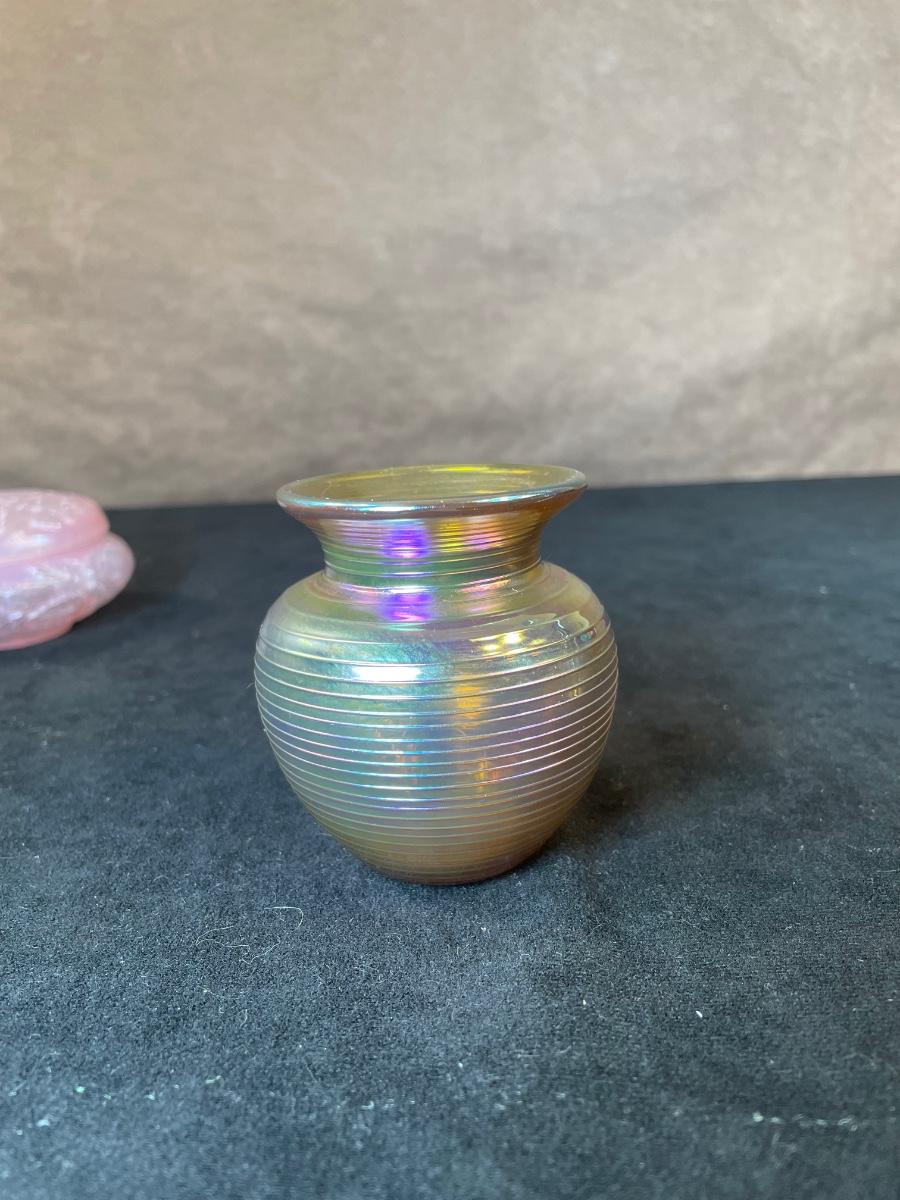 Iridescent pink art glass 3" tall vase by Grant Randolph 1984. Antique covered pin dish