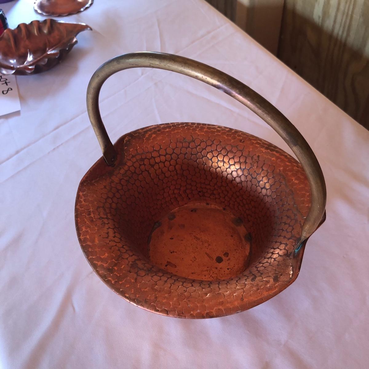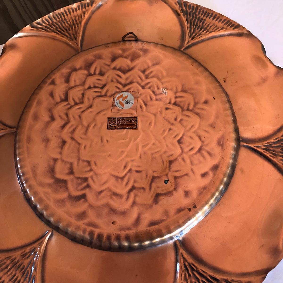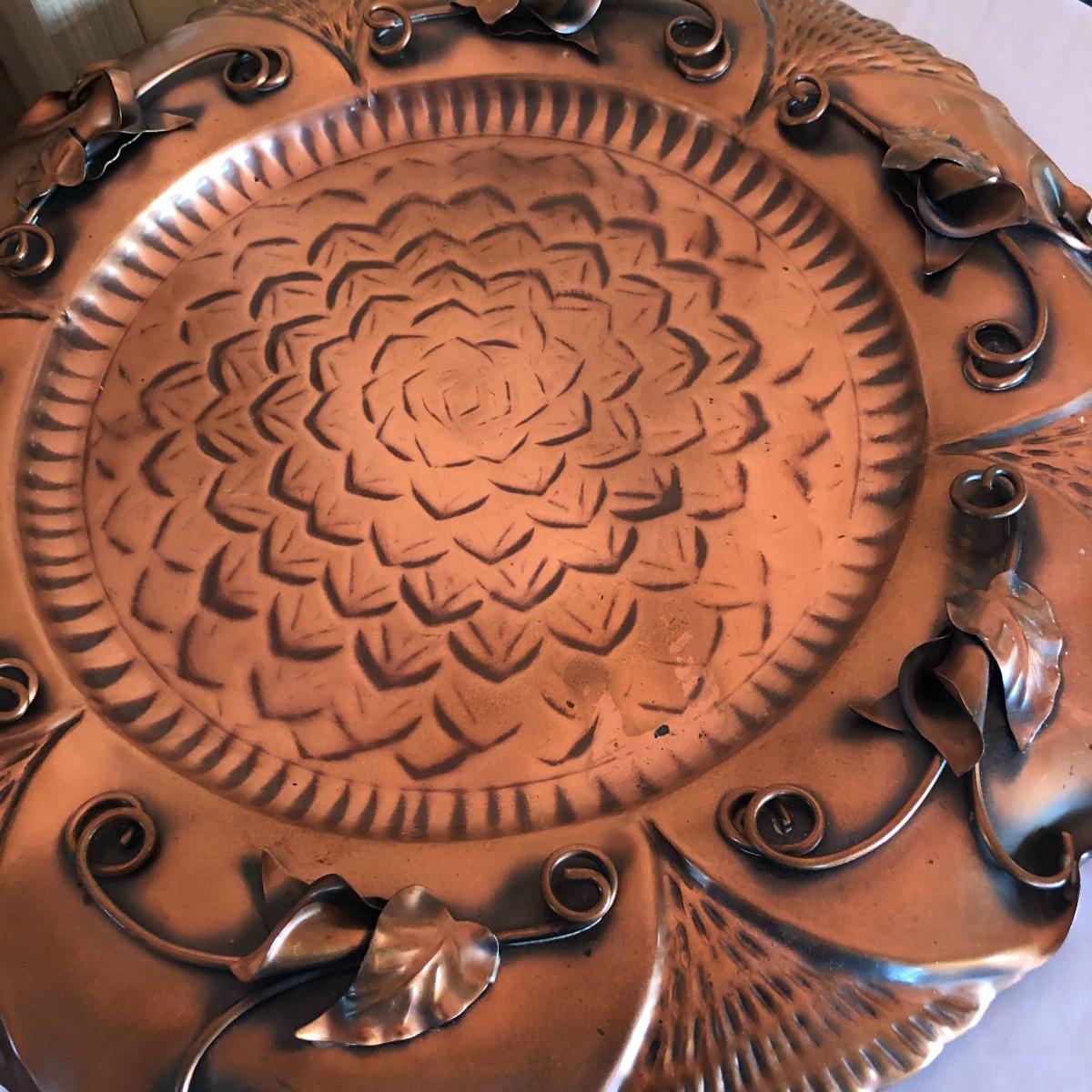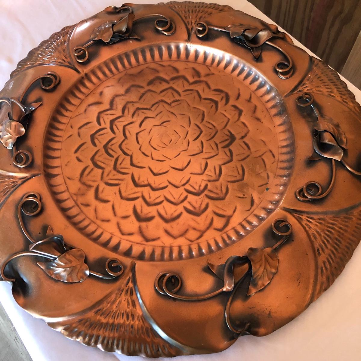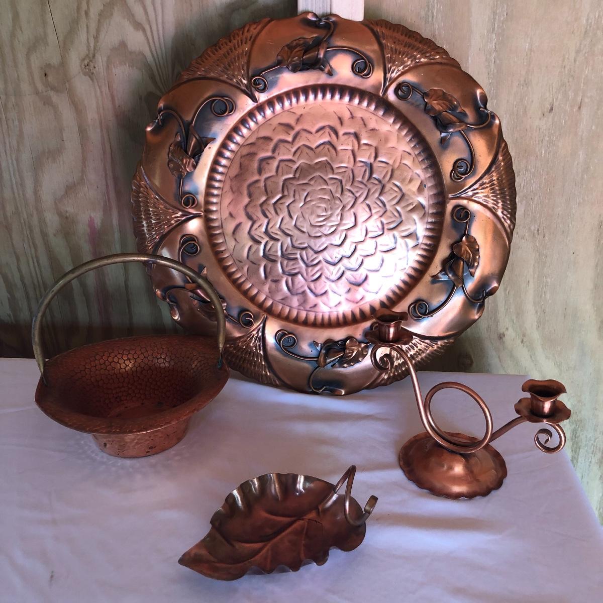 This copper group of four items will add a “pop” to your home! Enjoy a candle holder, leaf tray, basket and wall plate. The plate measures approximately 18” in diameter. Shipping Available.