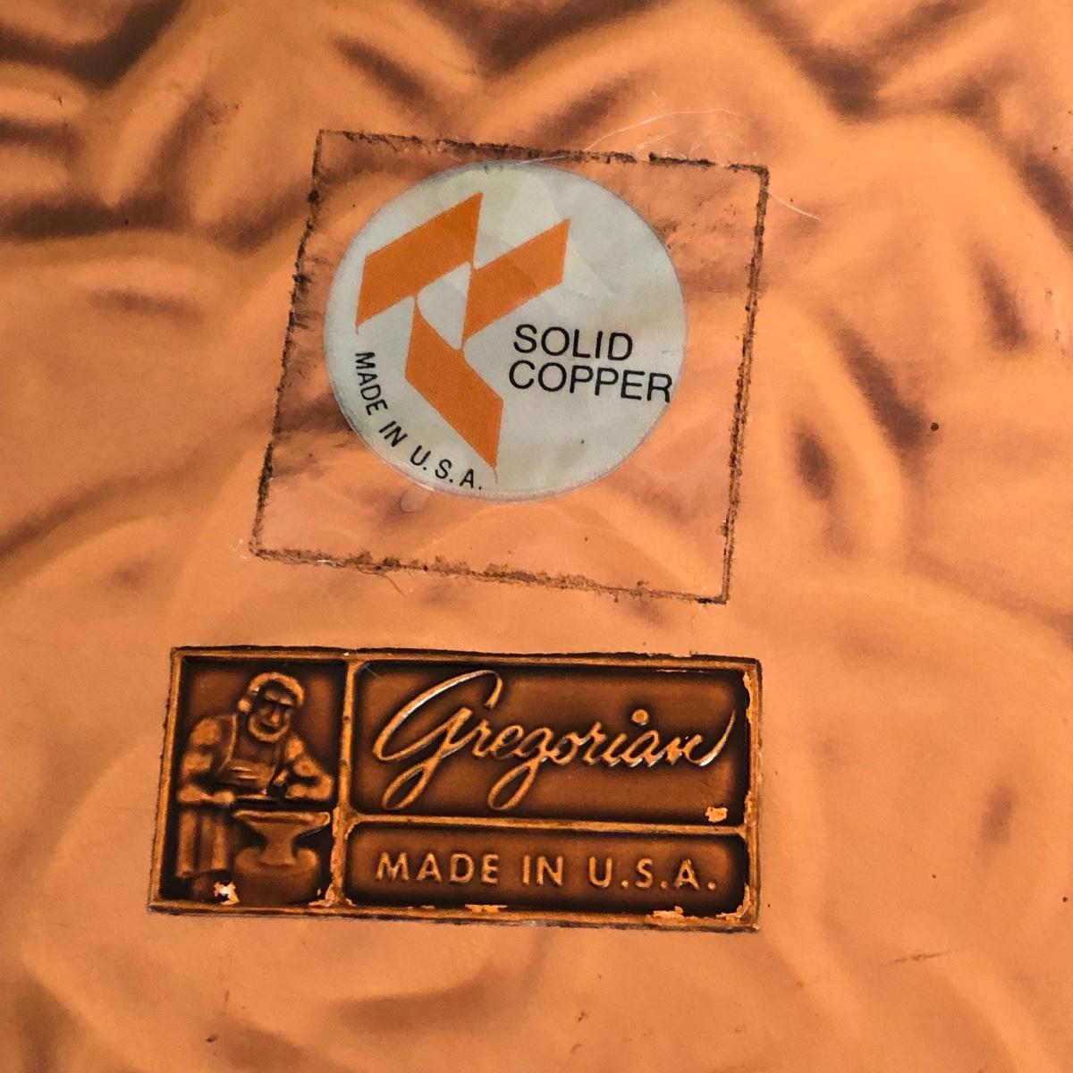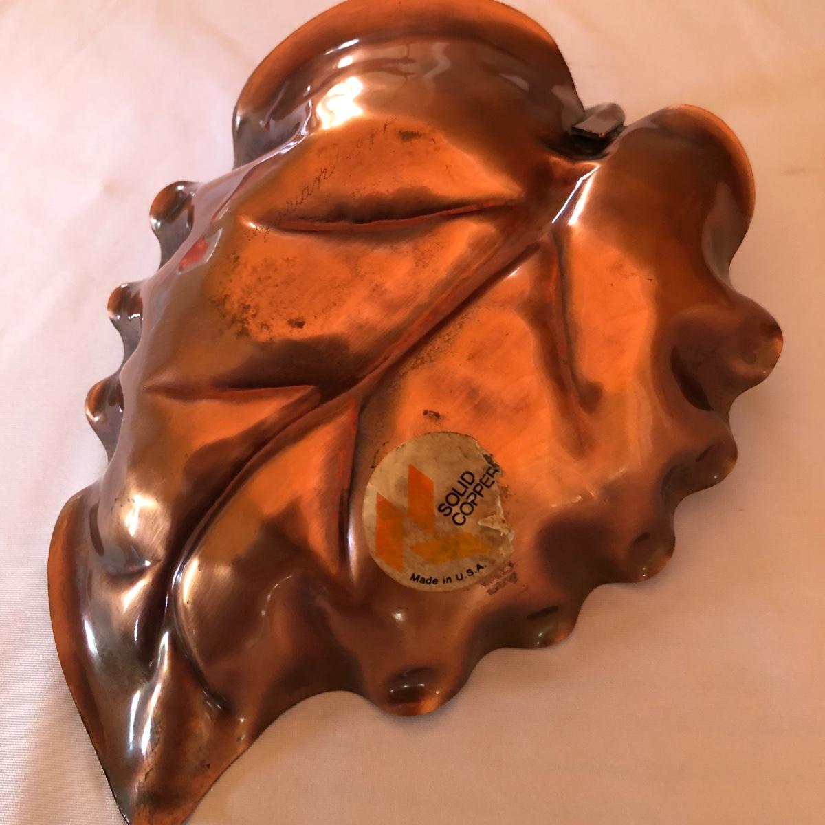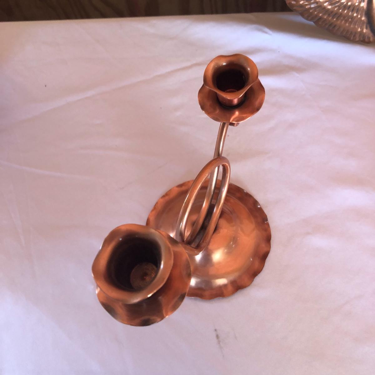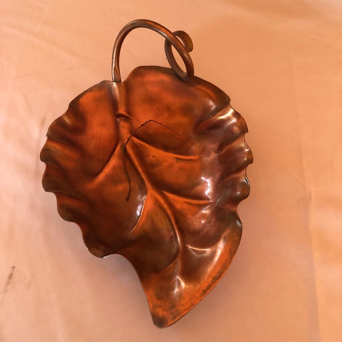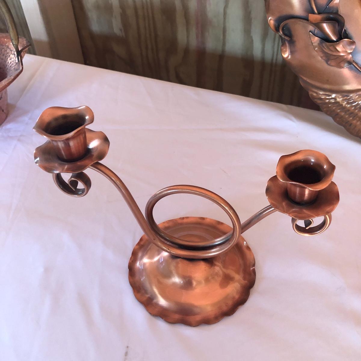 This copper group of four items will add a “pop” to your home! Enjoy a candle holder, leaf tray, basket and wall plate. The plate measures approximately 18” in diameter. Shipping Available.