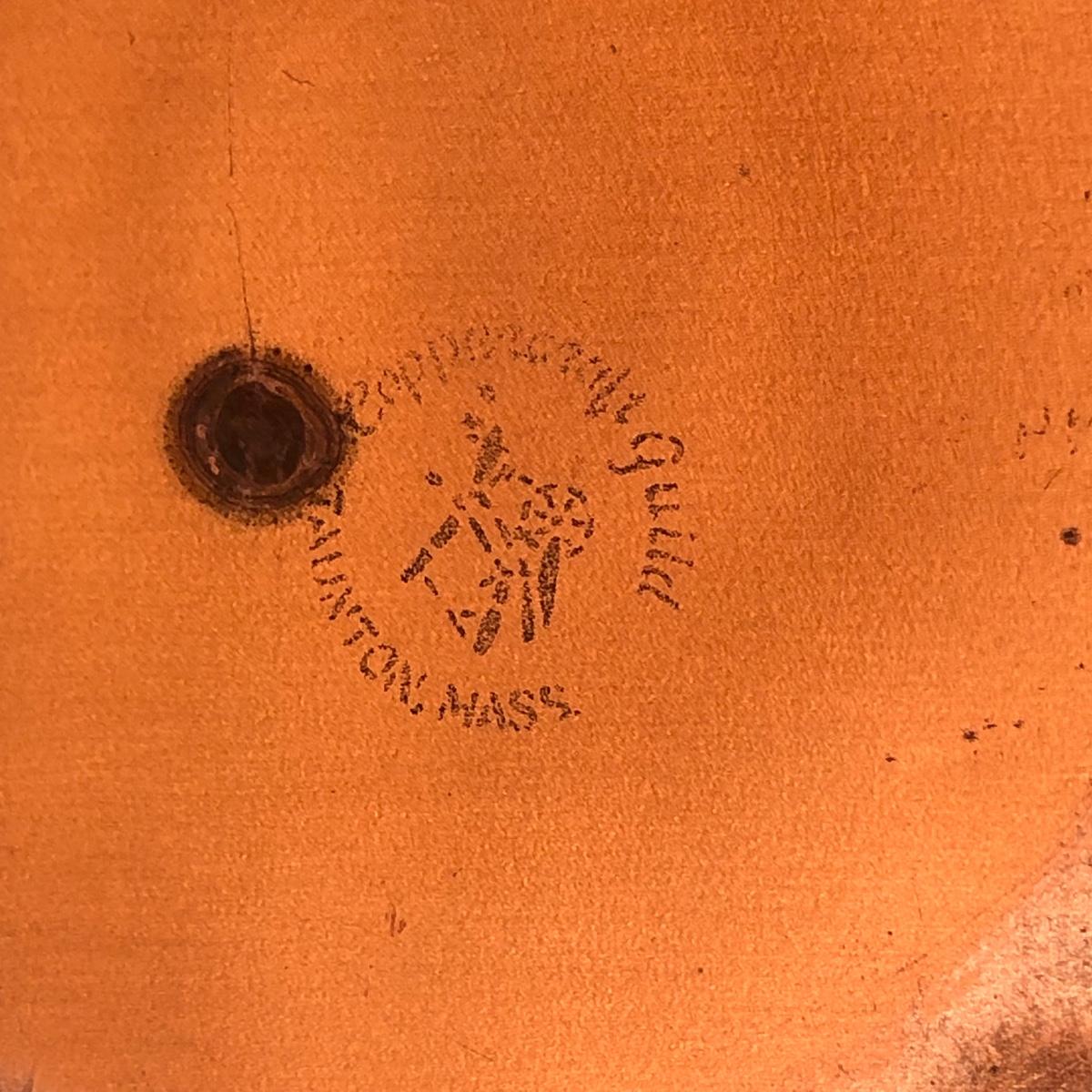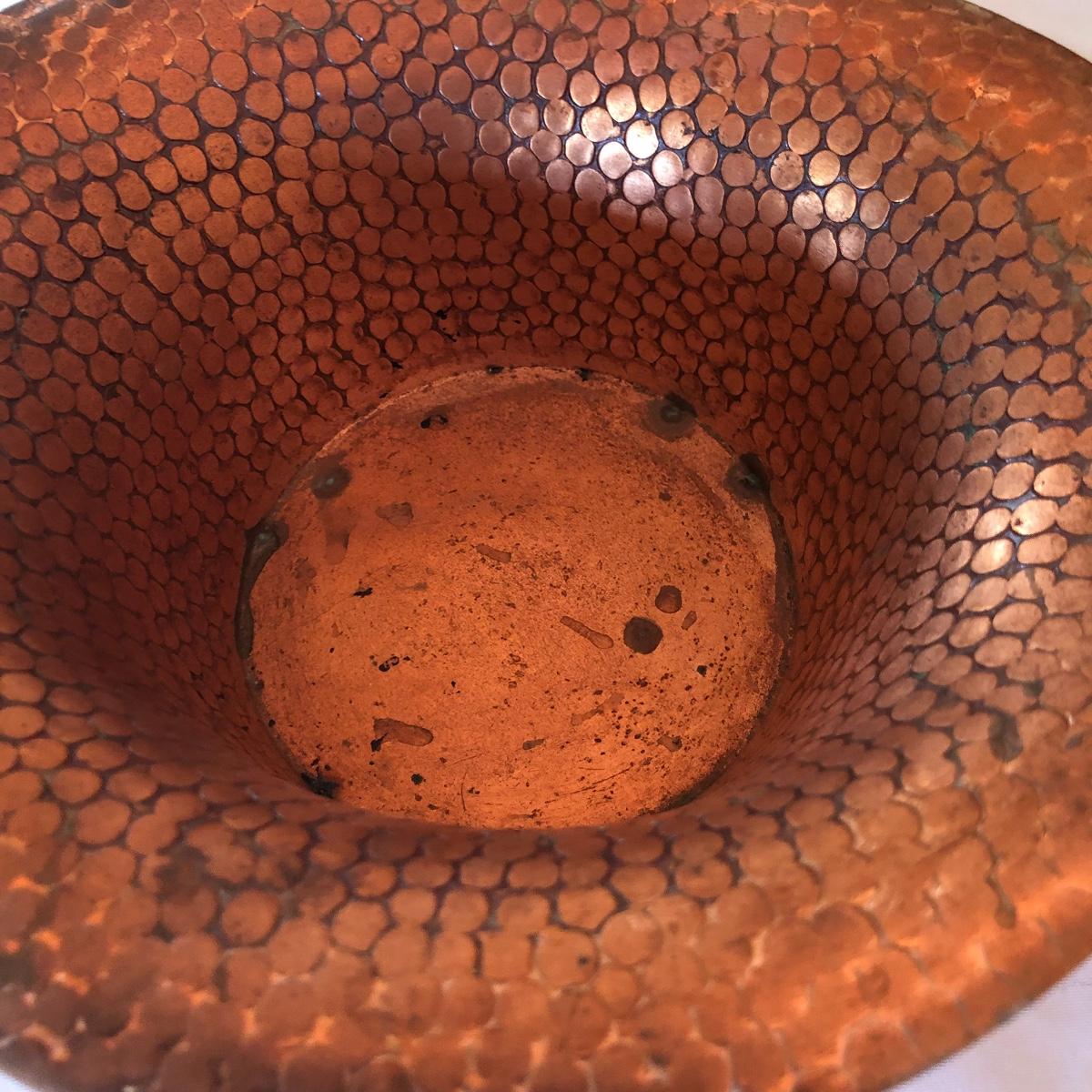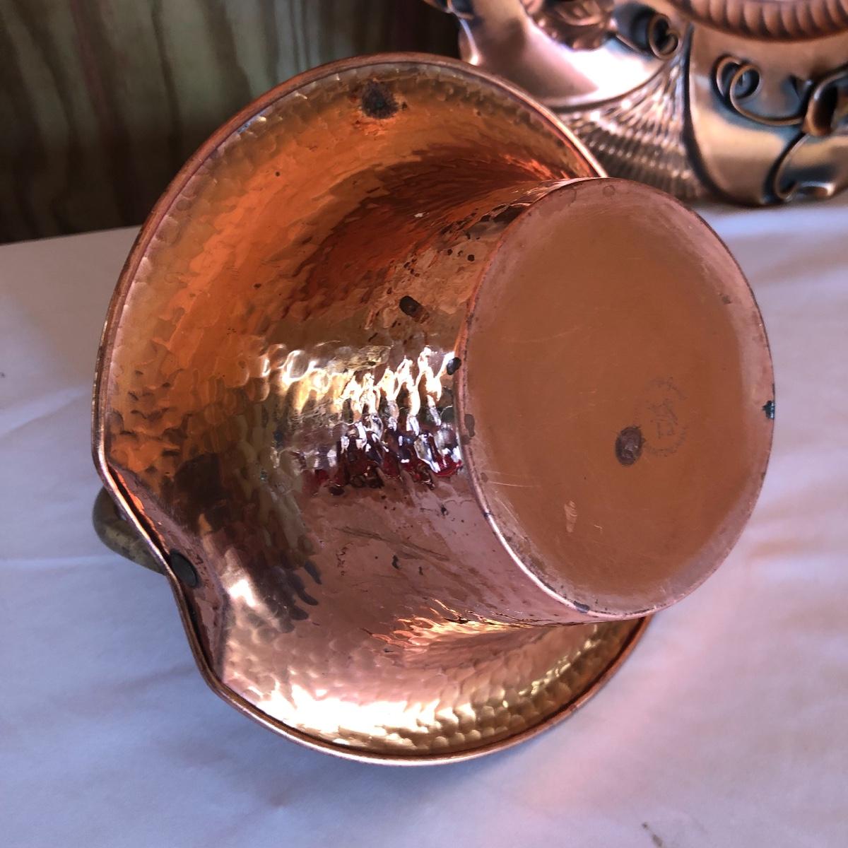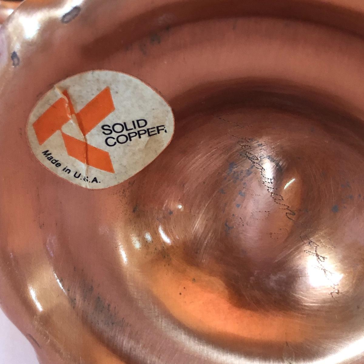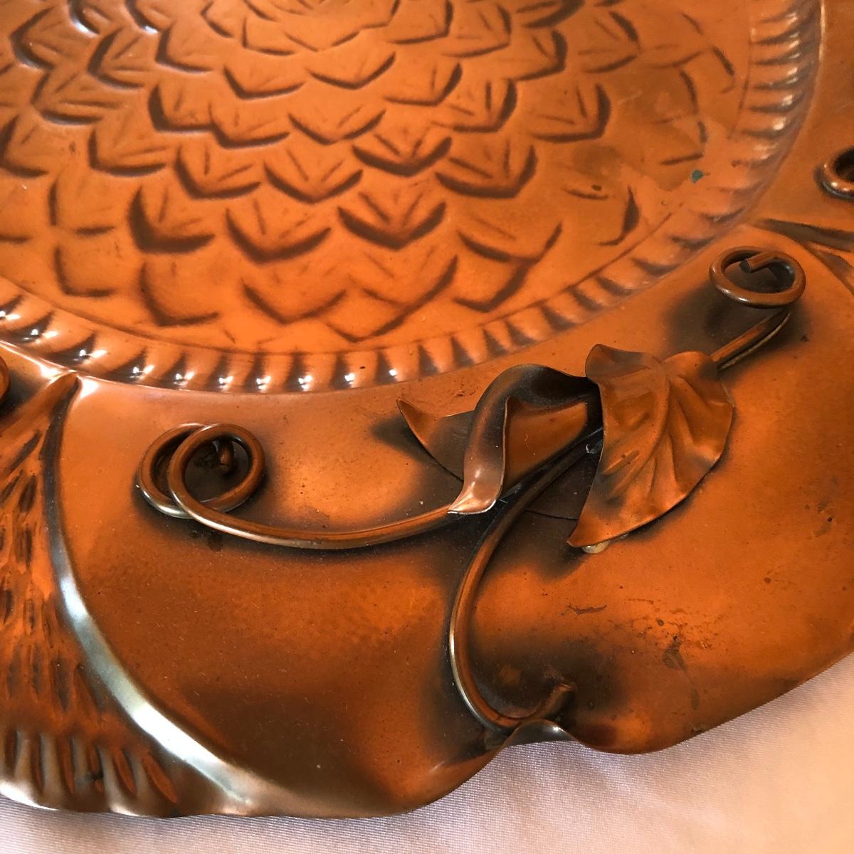 This copper group of four items will add a “pop” to your home! Enjoy a candle holder, leaf tray, basket and wall plate. The plate measures approximately 18” in diameter. Shipping Available.