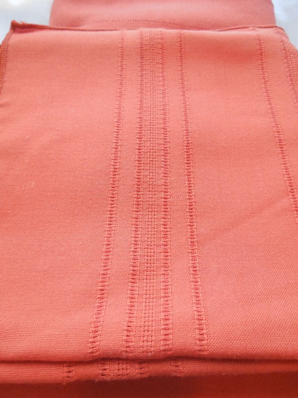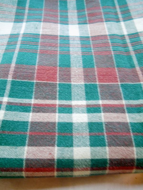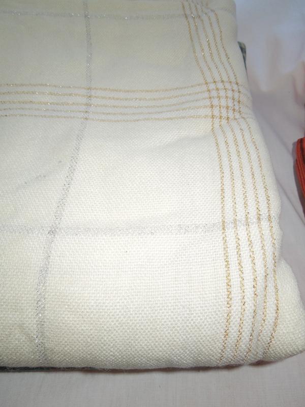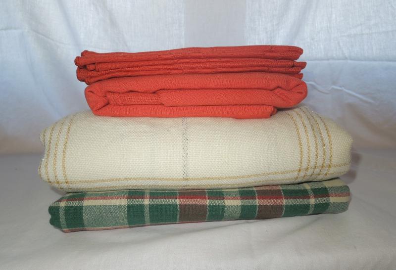 Three like new holiday tableclothes. Red/green plaid is cotton and measures 55 x 74. Orange/red fall tablecloth is cotton/poly and measures 84 x 120. White tablecloth is woven acrylic with gold threads and is 120 x 120. No pulls or loose edges.