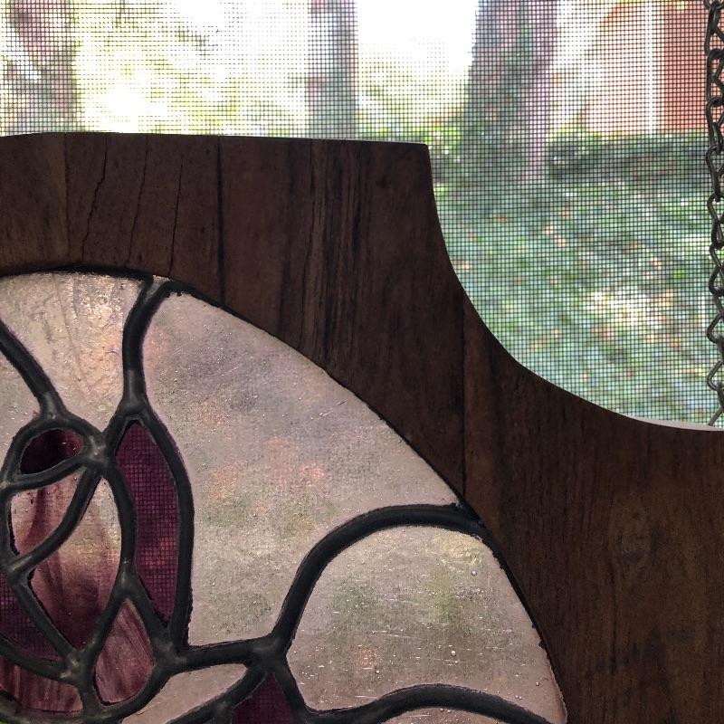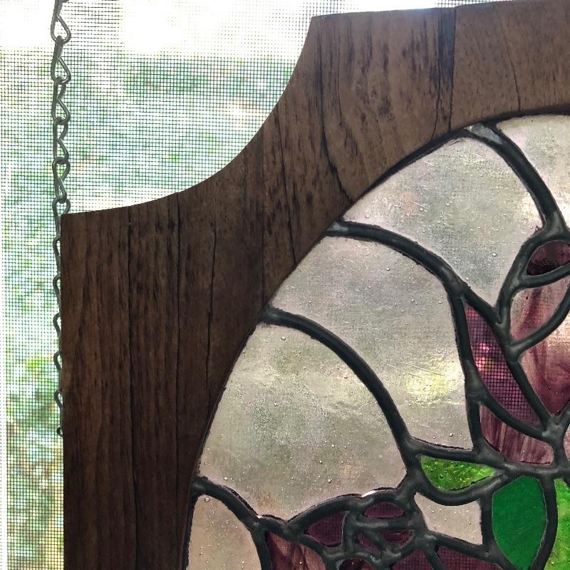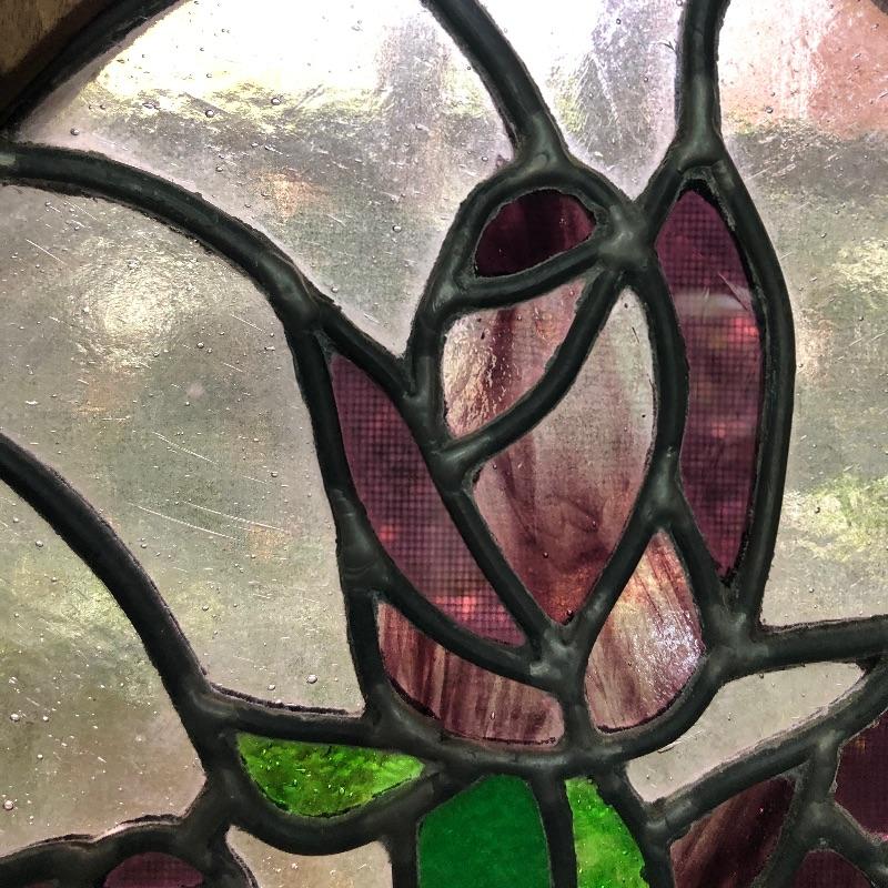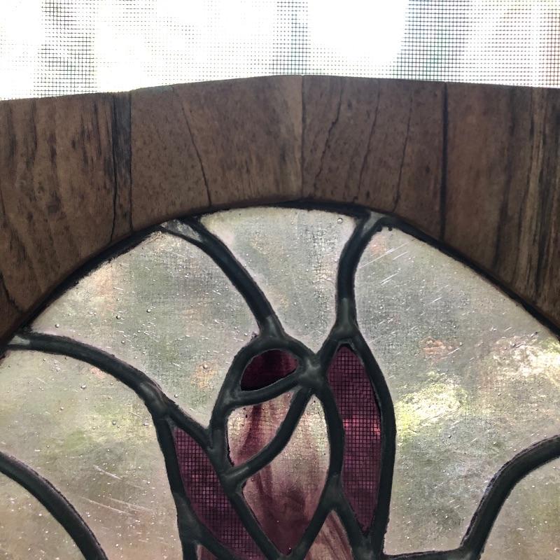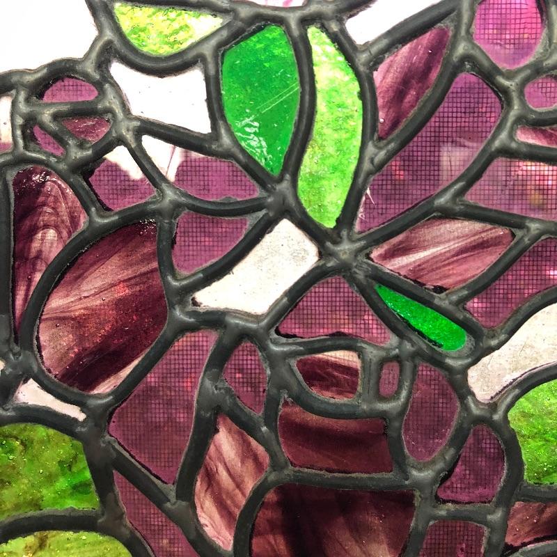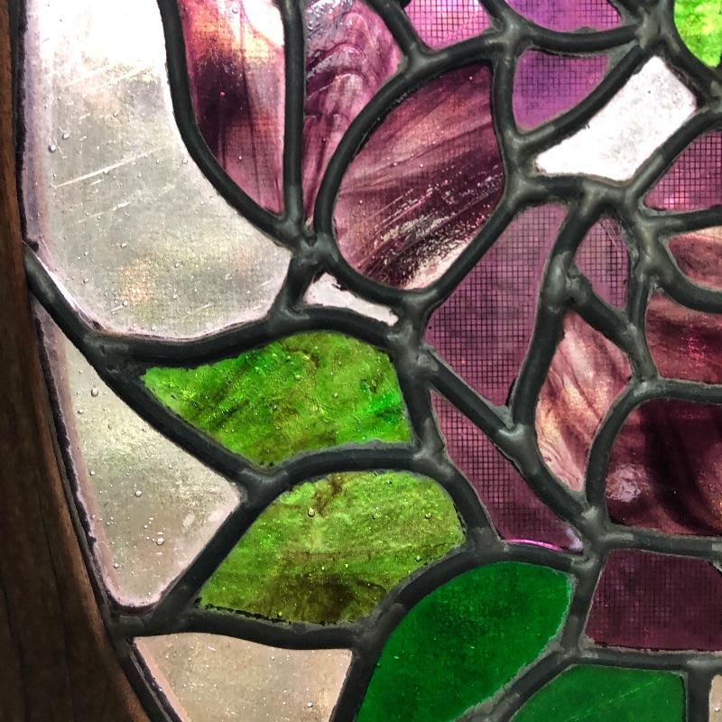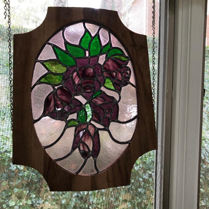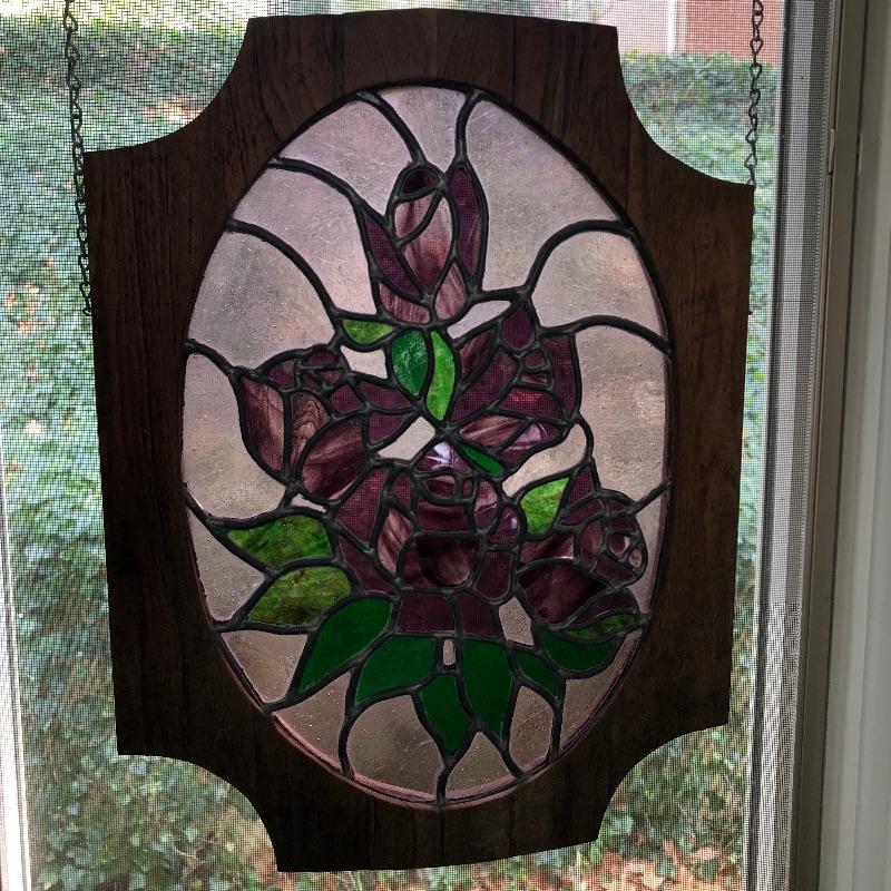 Beautiful framed and ready to hang in your favorite space is this rich purple and green stained glass Looks great from all angles and measures 14” x 1” x 18”. Shipping available.