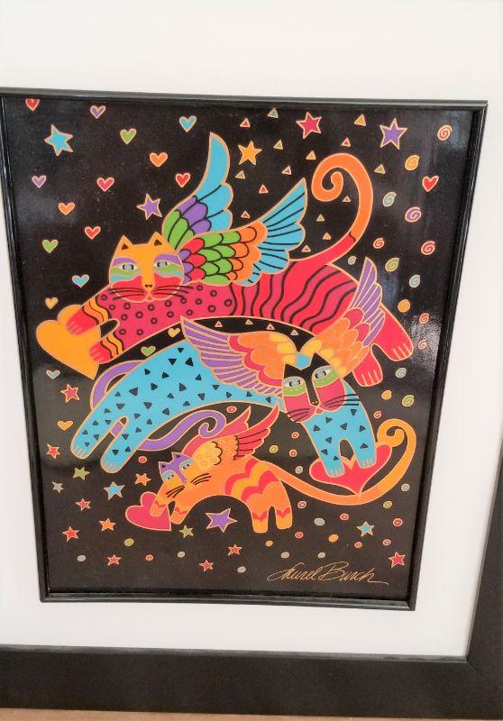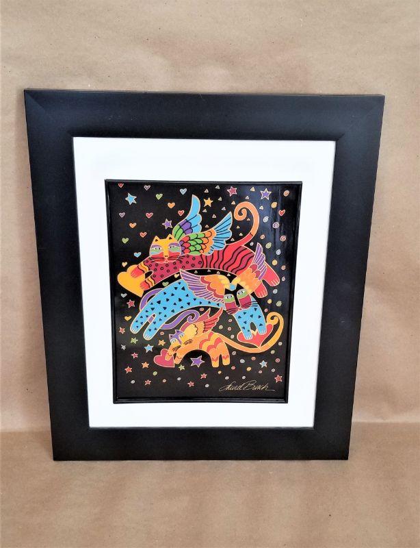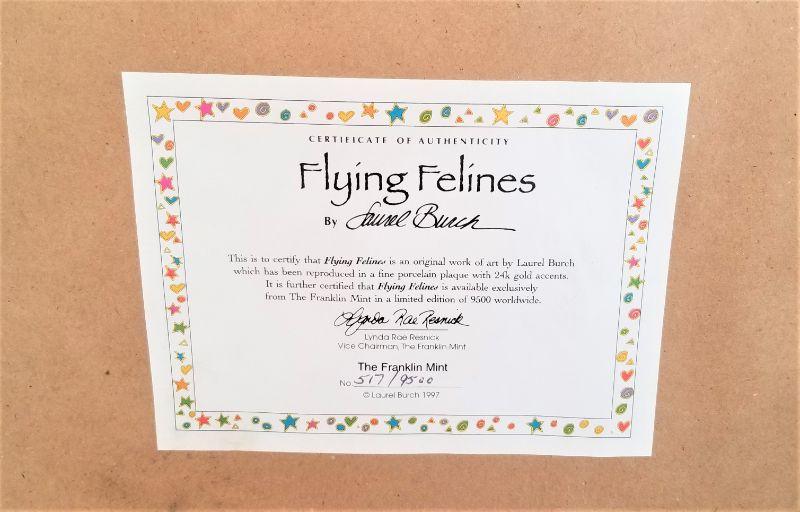 Laurel Burch is THE "cat lady." Here is a limited edition piece she produced with the Franklin Mint entitled "Flying Felines", #517 out of 9500. Porcelain plaque, 24KT gold accents, framed. Certificate on reverse. Measures 14" by 19".