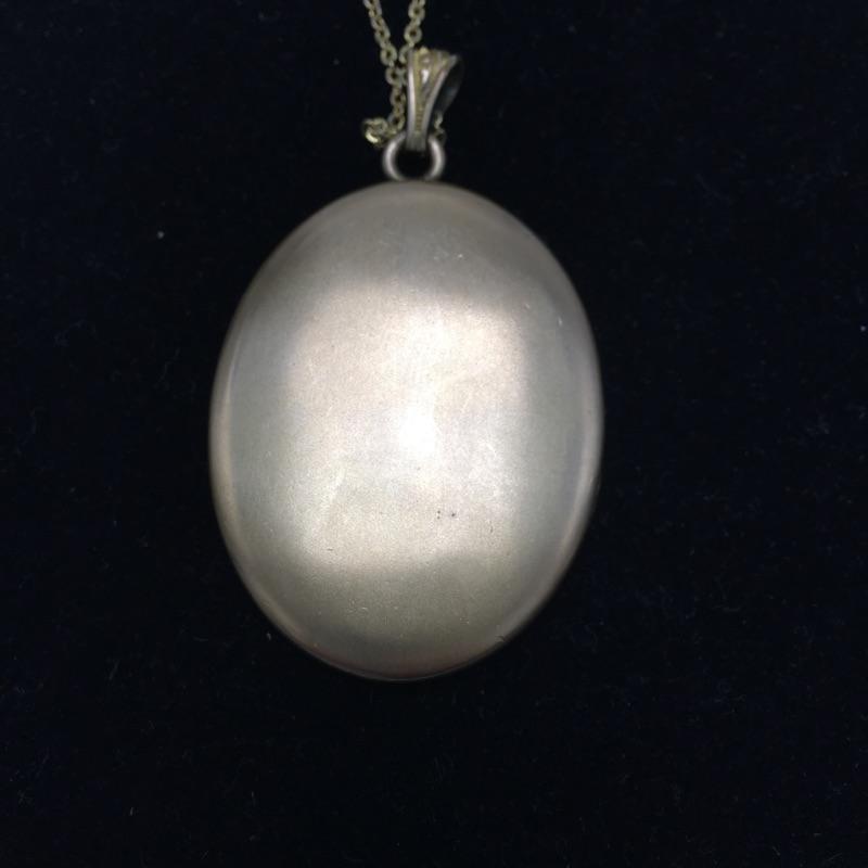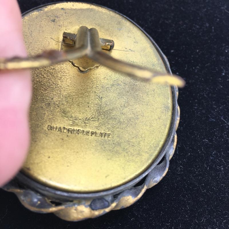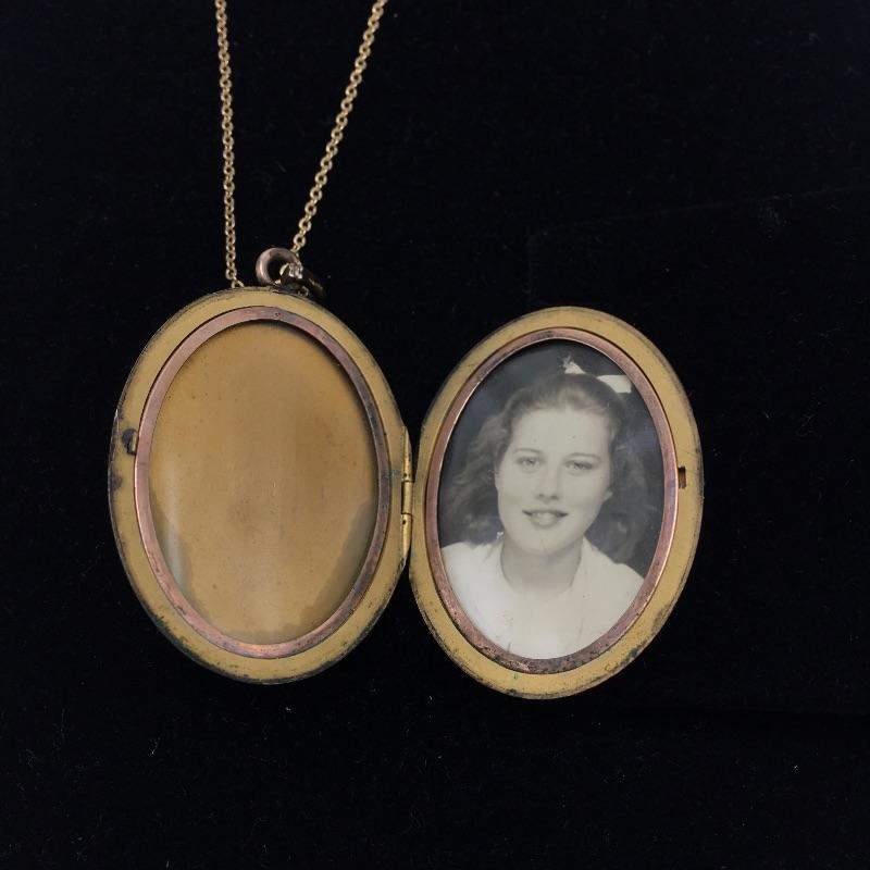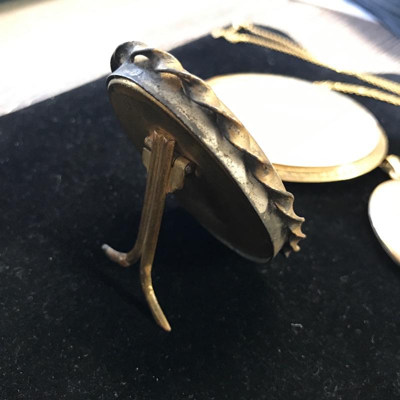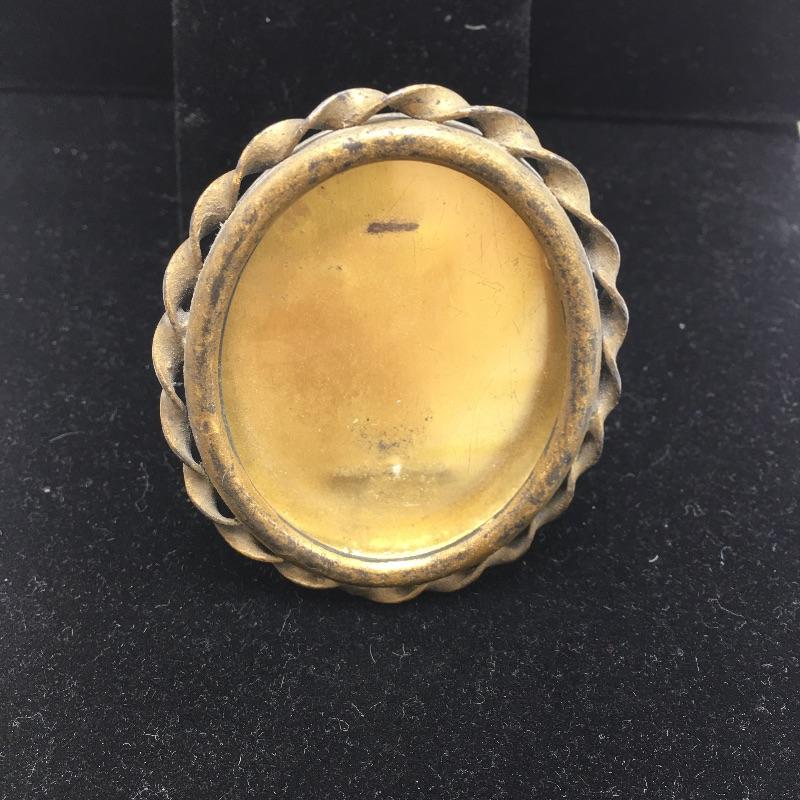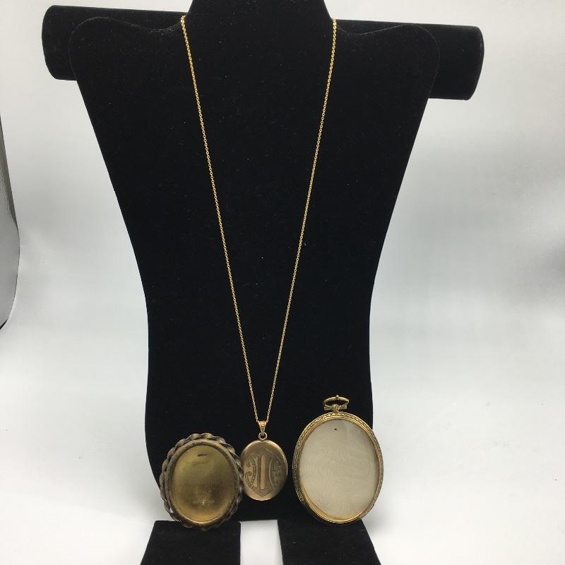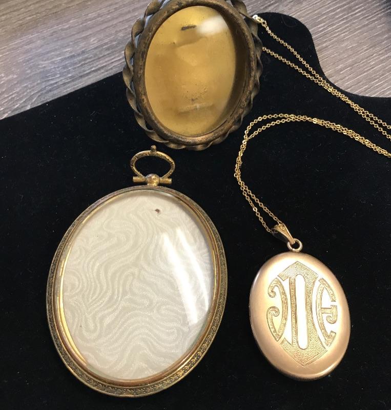 Lot includes locket that can accommodate two pictures with chain, oval shaped frame marked quadruple plate and a oval shaped hanging frame that measures 2.25” x 3”. All brass colored